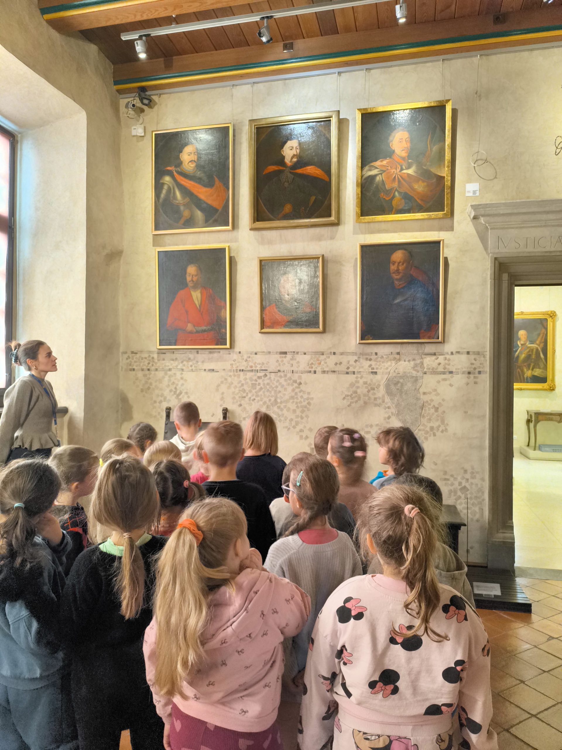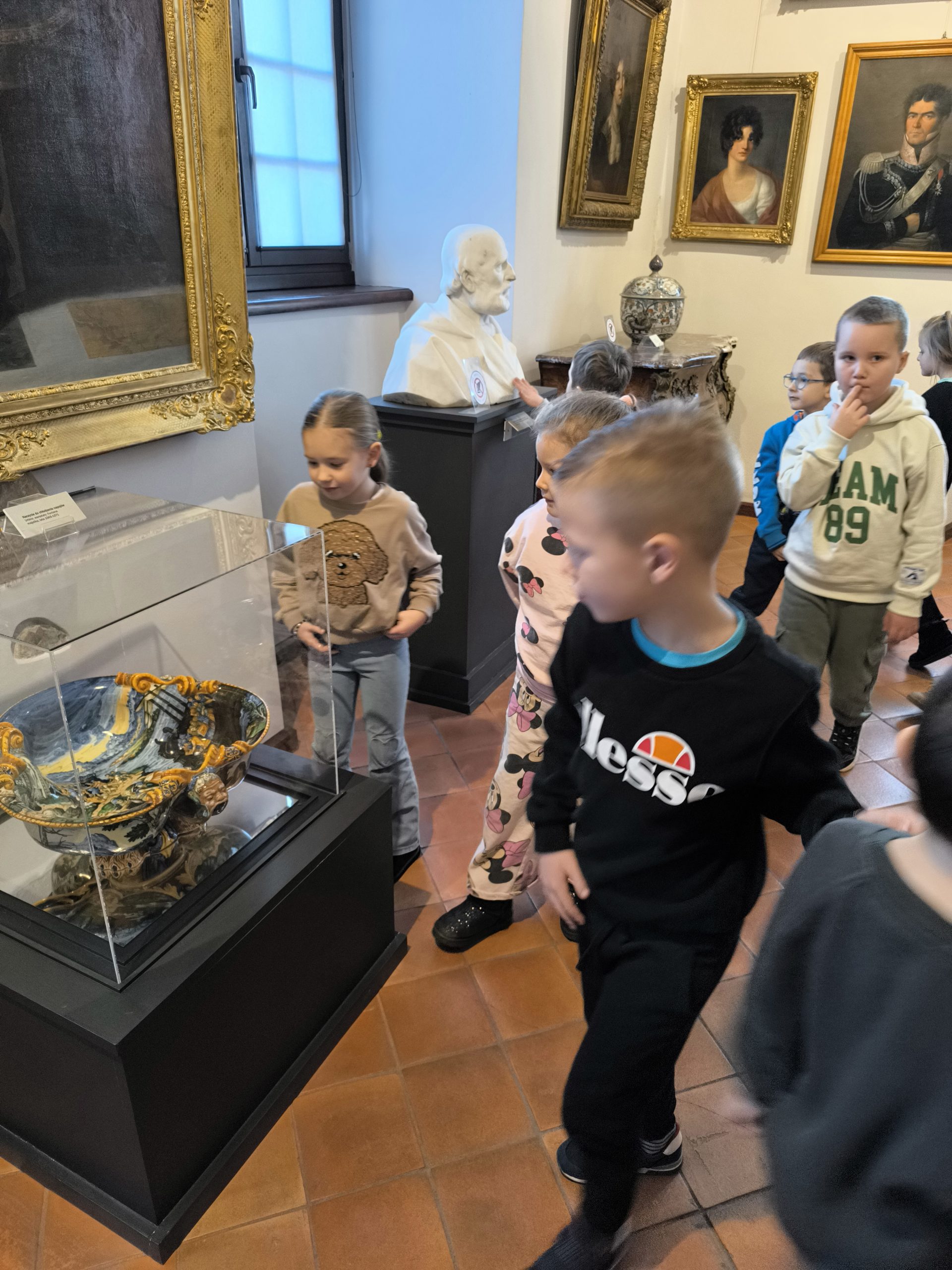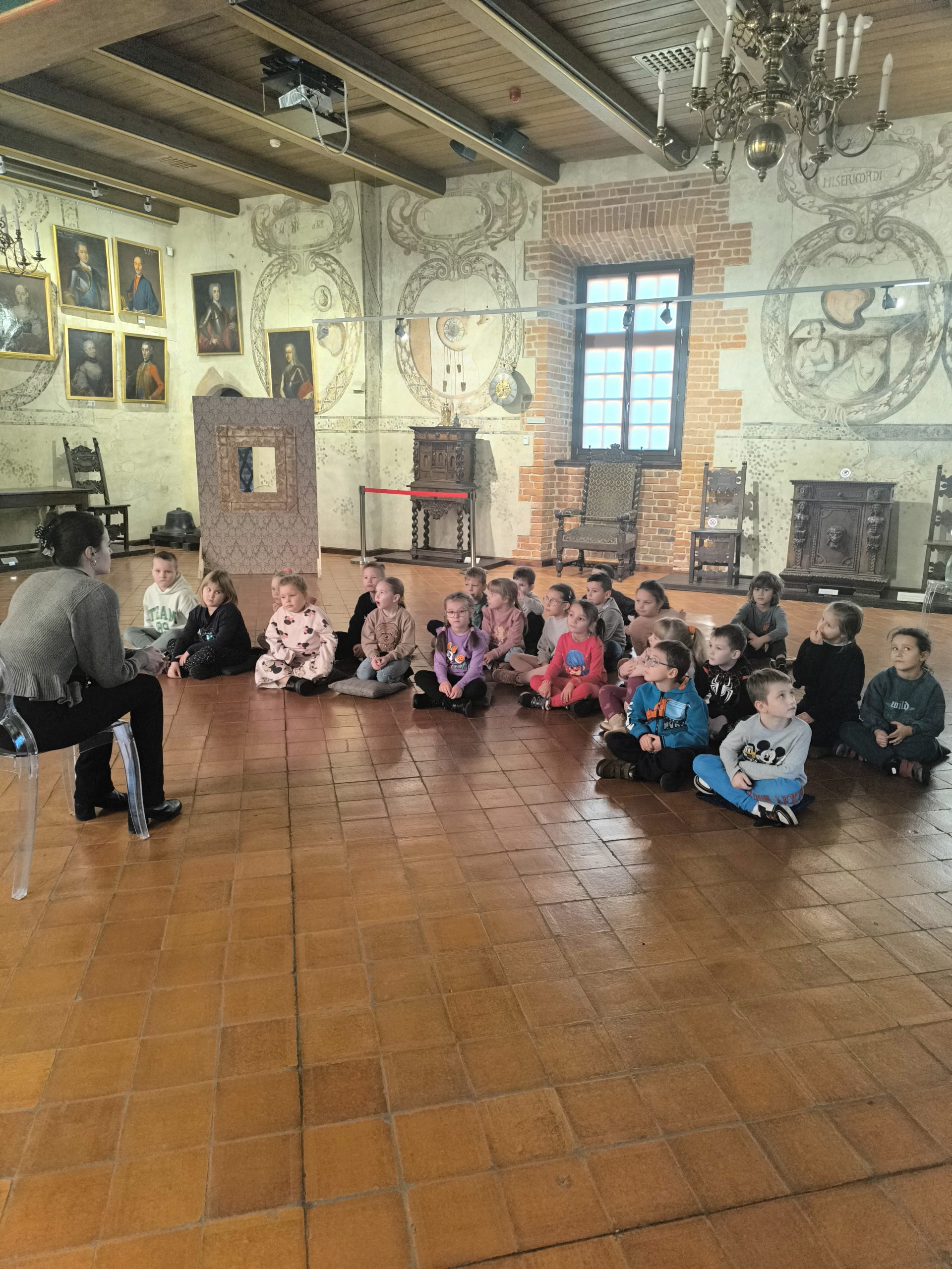 i obrazy. Wzięły również udział w wyjątkowych zajęciach artystycznych inspirowanych historią i kulturą regionu. Na miejscu dzieci poznały różne techniki tworzenia portretów oraz dowiedziały się, kim byli Sanguszkowie i jak ważną rolę odegrali w lokalnej historii. Pod okiem prowadzącej dzieci stworzyły własne prace plastyczne – portrety, wykazując się ogromną kreatywnością i zaangażowaniem. Przedszkolaki z zaciekawieniem słuchały opowieści o dawnych artystach i zabytkach związanych z rodem Sanguszków.