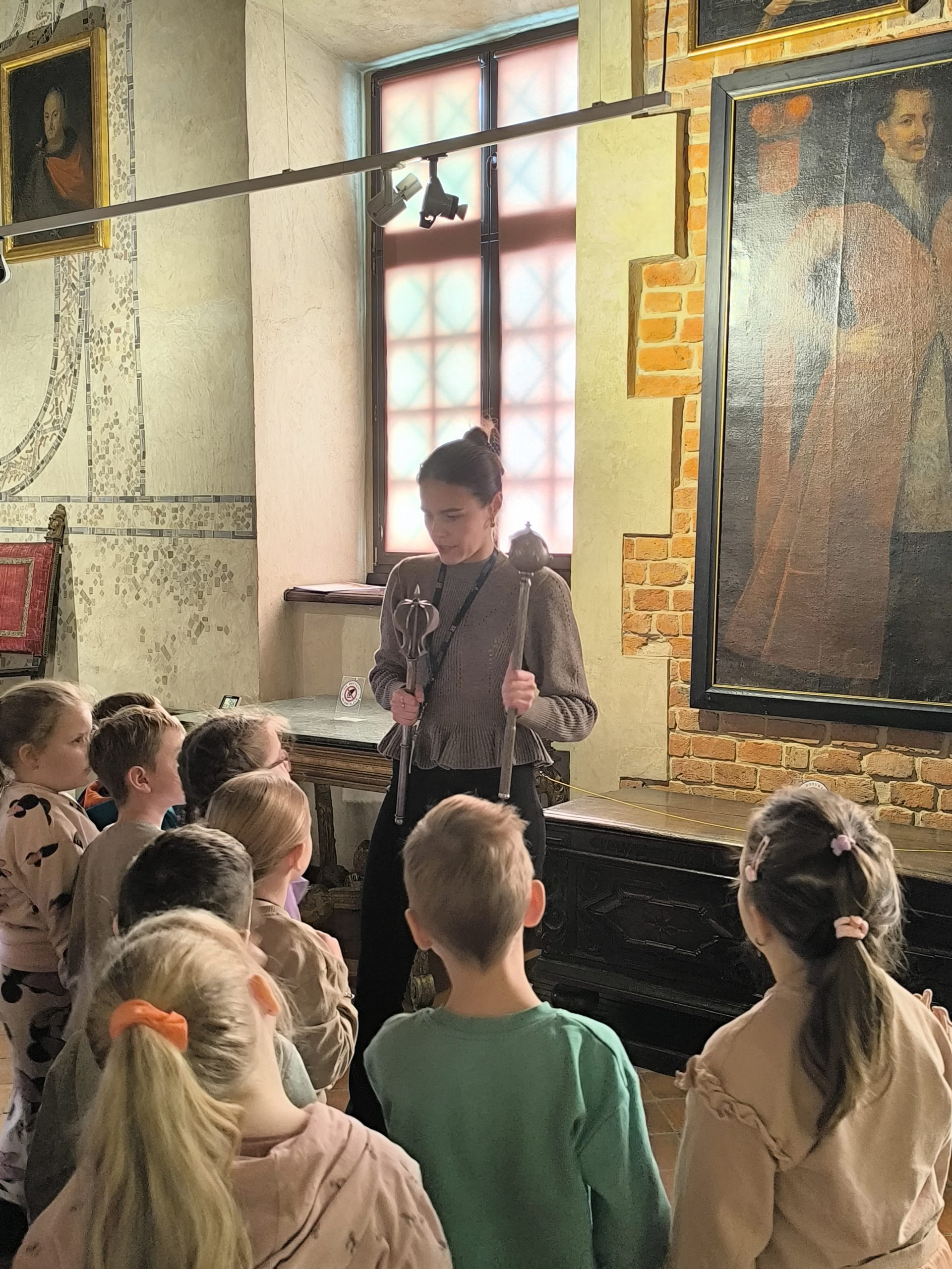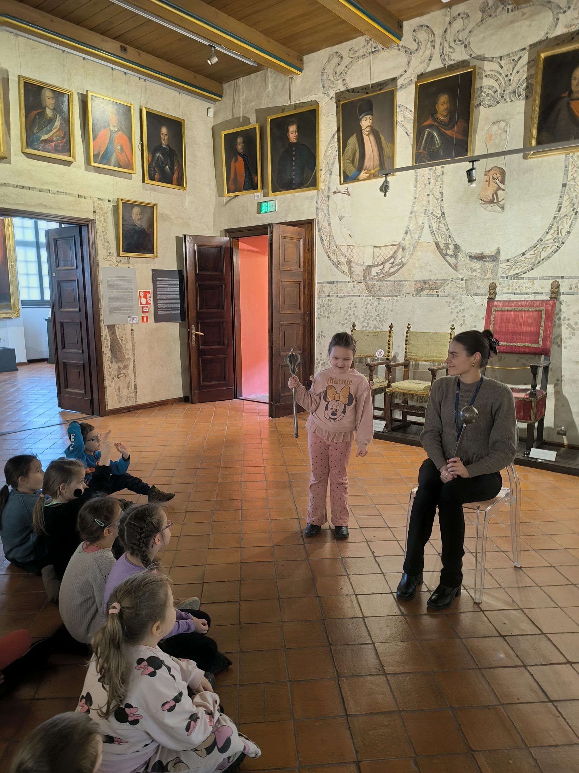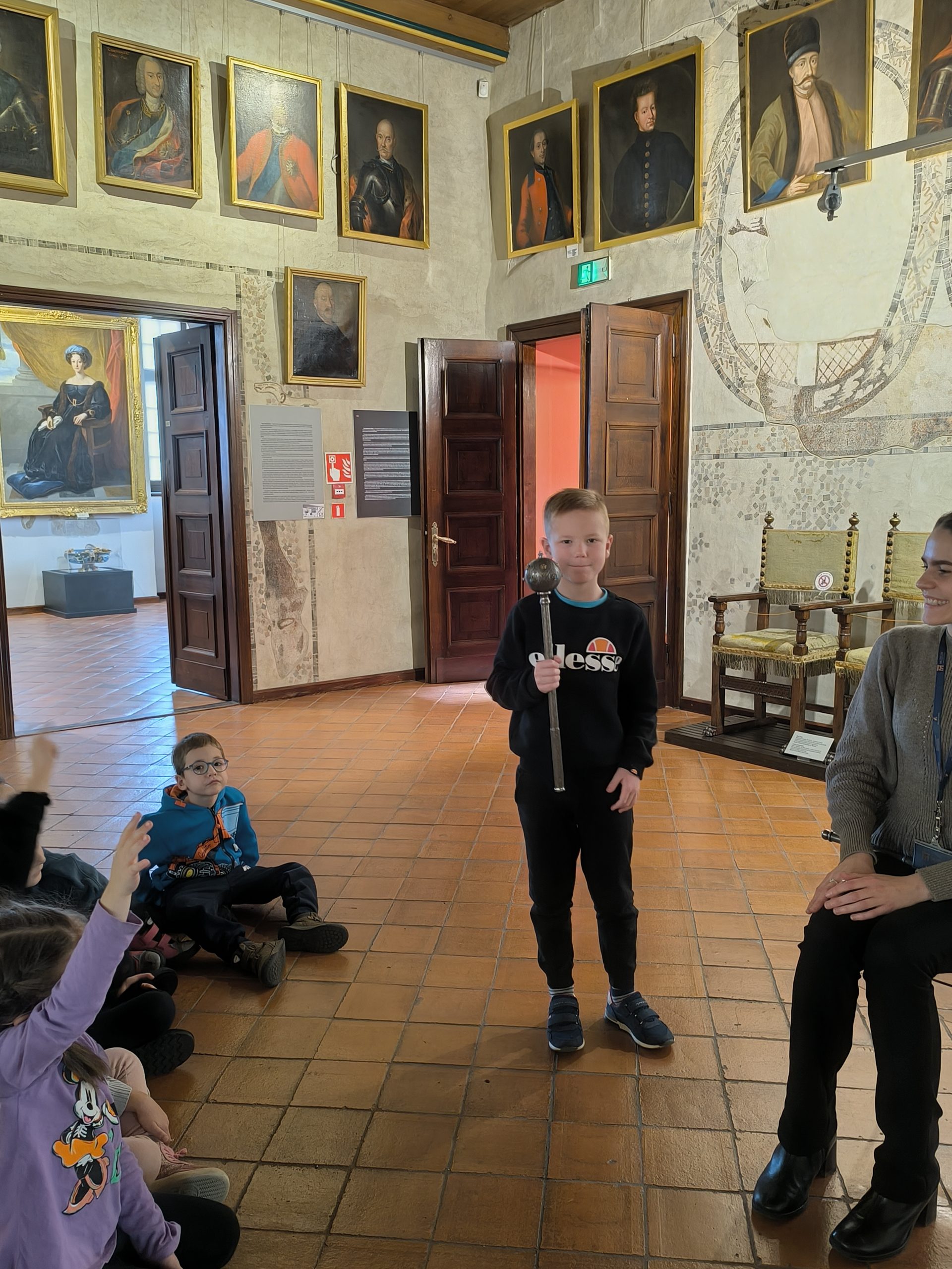 i obrazy. Wzięły również udział w wyjątkowych zajęciach artystycznych inspirowanych historią i kulturą regionu. Na miejscu dzieci poznały różne techniki tworzenia portretów oraz dowiedziały się, kim byli Sanguszkowie i jak ważną rolę odegrali w lokalnej historii. Pod okiem prowadzącej dzieci stworzyły własne prace plastyczne – portrety, wykazując się ogromną kreatywnością i zaangażowaniem. Przedszkolaki z zaciekawieniem słuchały opowieści o dawnych artystach i zabytkach związanych z rodem Sanguszków.