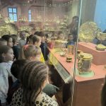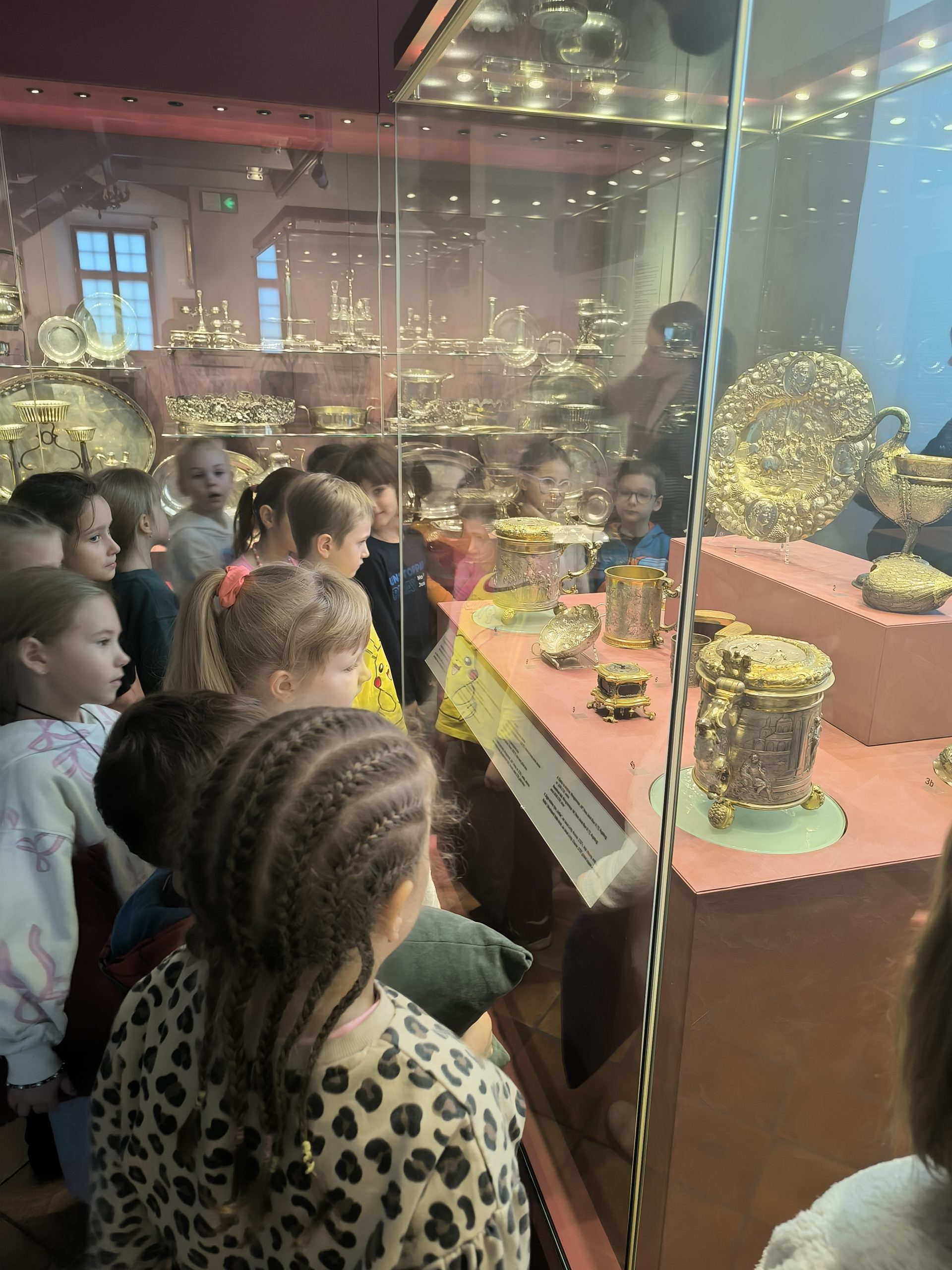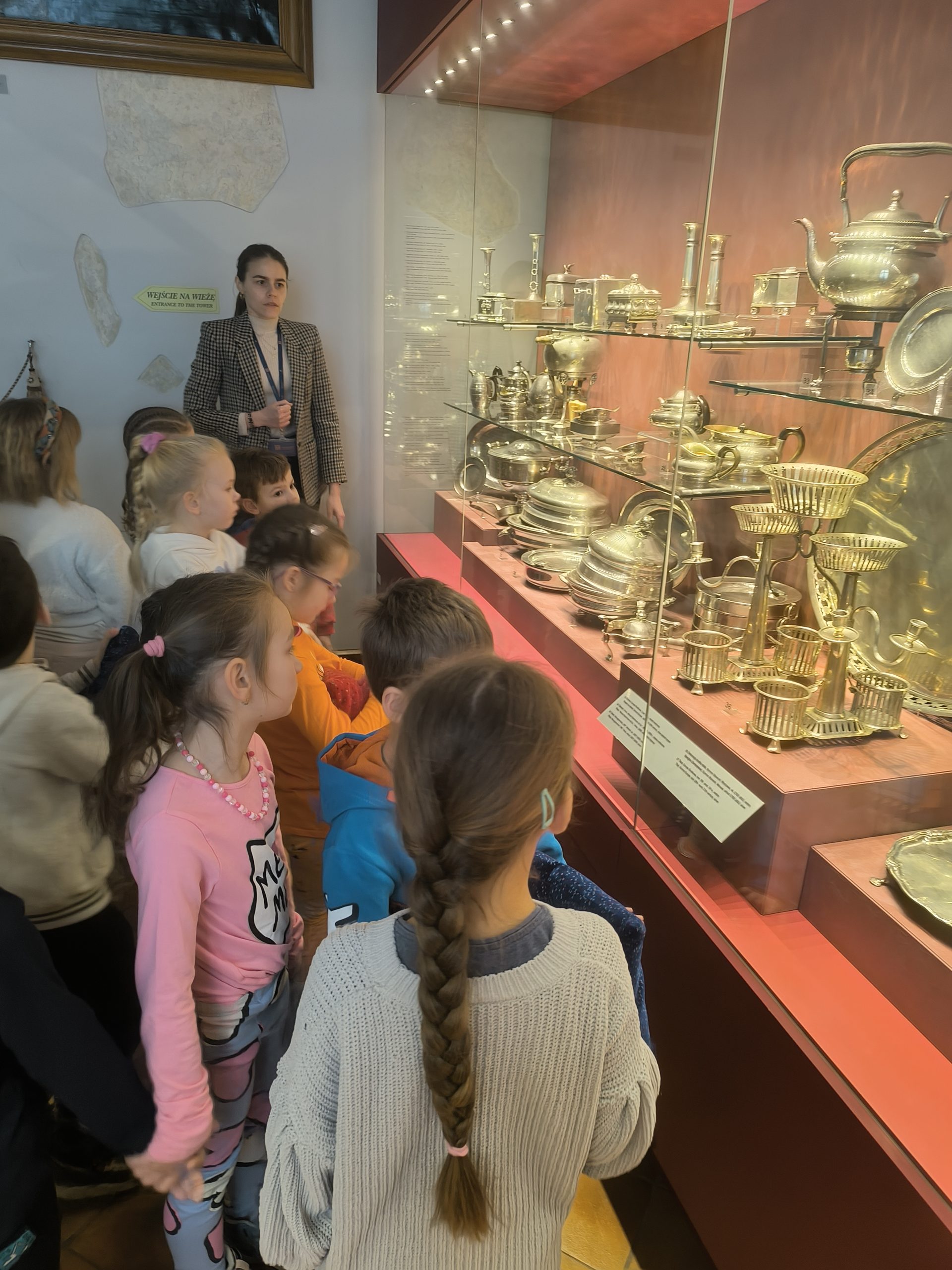 Dzieci wybrały się na wycieczkę do Muzeum Ratusz w Tarnowie, aby poznać historię dawnych zastaw stołowych i zobaczyć, jak wyglądały eleganckie naczynia używane wiele lat temu. Już na początku dzieci z dużym zainteresowaniem obejrzały okazałe zestawy wykonane ze srebra. Mogły dowiedzieć się, w jaki sposób dawniej z nich korzystano – jak je ustawiano na stołach, kto ich używał oraz dlaczego były one tak cenne. Pani przewodnik opowiadała również o technikach wykonywania srebrnych naczyń oraz o tym, jak starannie należało je pielęgnować, aby zachowały swój blask.