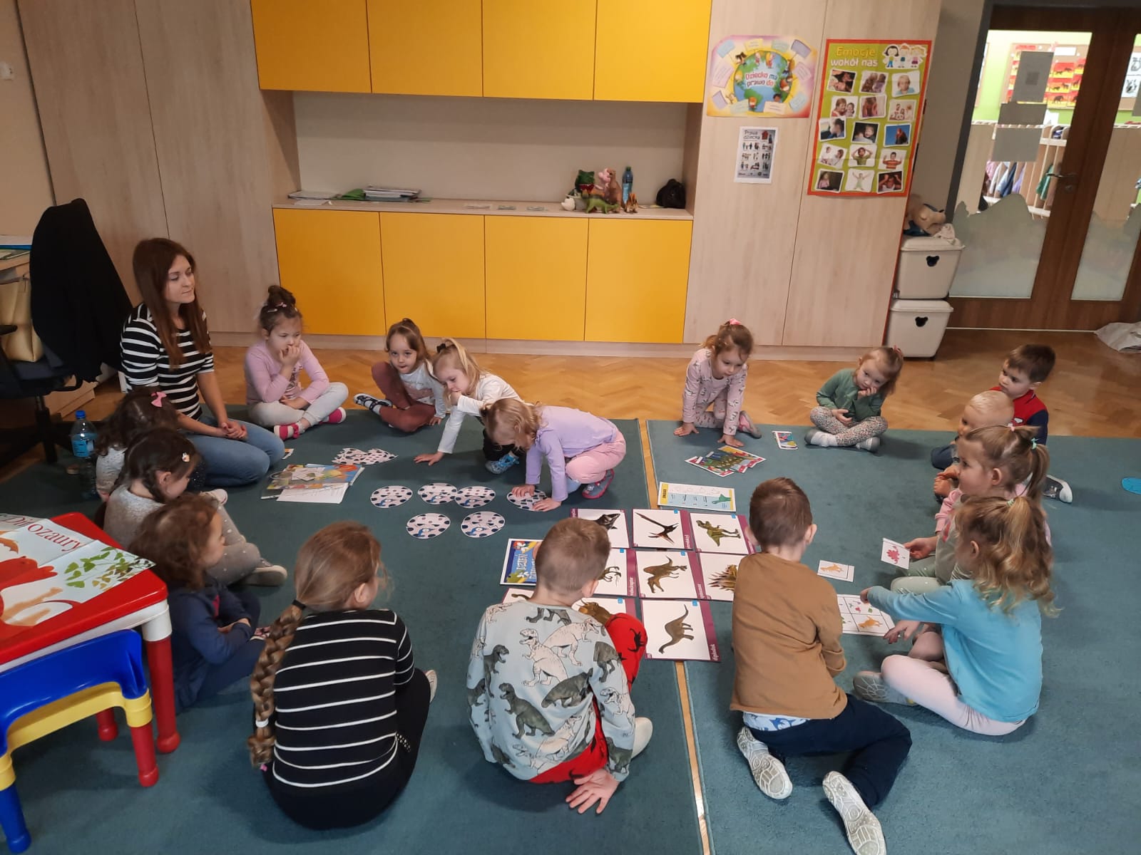 Na koniec miesiąca przypada dość nietypowe święto. Wszystkich dzieci fascynują dinozaury, dlatego postanowiłyśmy wykorzystać ich zainteresowania i w poniedziałek – 26 lutego obchodzić Dzień Dinozaura. Dzieci wykazały olbrzymie zainteresowanie tematem. Misie wymieniały charakterystyczne cechy dinozaurów, chodziły po dużych i małych śladach pozostawionych przez te wielkie stwory. W skupieniu słuchały odgłosów „Jurajskiego parku” – dźwięków z prehistorycznego lasu. Przedszkolaki odgadywały zagadki, brały udział w zabawach matematycznych oraz ruchowo-naśladowczych. Chętnie porównywały wygląd dinozaurów, określały ich wielkość, segregowały je według określonej cechy. Z łatwością rozpoznawały nazwy przyniesionych z domu dinozaurów, dzieląc się swoją wiedzą. Podczas zajęć utrwaliły pojęcia z orientacji przestrzennej; wspólnie bawiły się przy piosence „Dino, dino dinozaury…”. Najwięcej przeżyć i emocji dostarczyła dzieciom prezentacja przedszkolnej kolekcji dinozaurów. Na koniec zajęć dzieci obejrzały krótką animację o dinozaurach. Zajęcia w tym dniu z pewnością pogłębiły wiedzę przedszkolaków, a w niektórych rozbudziły nową pasję.