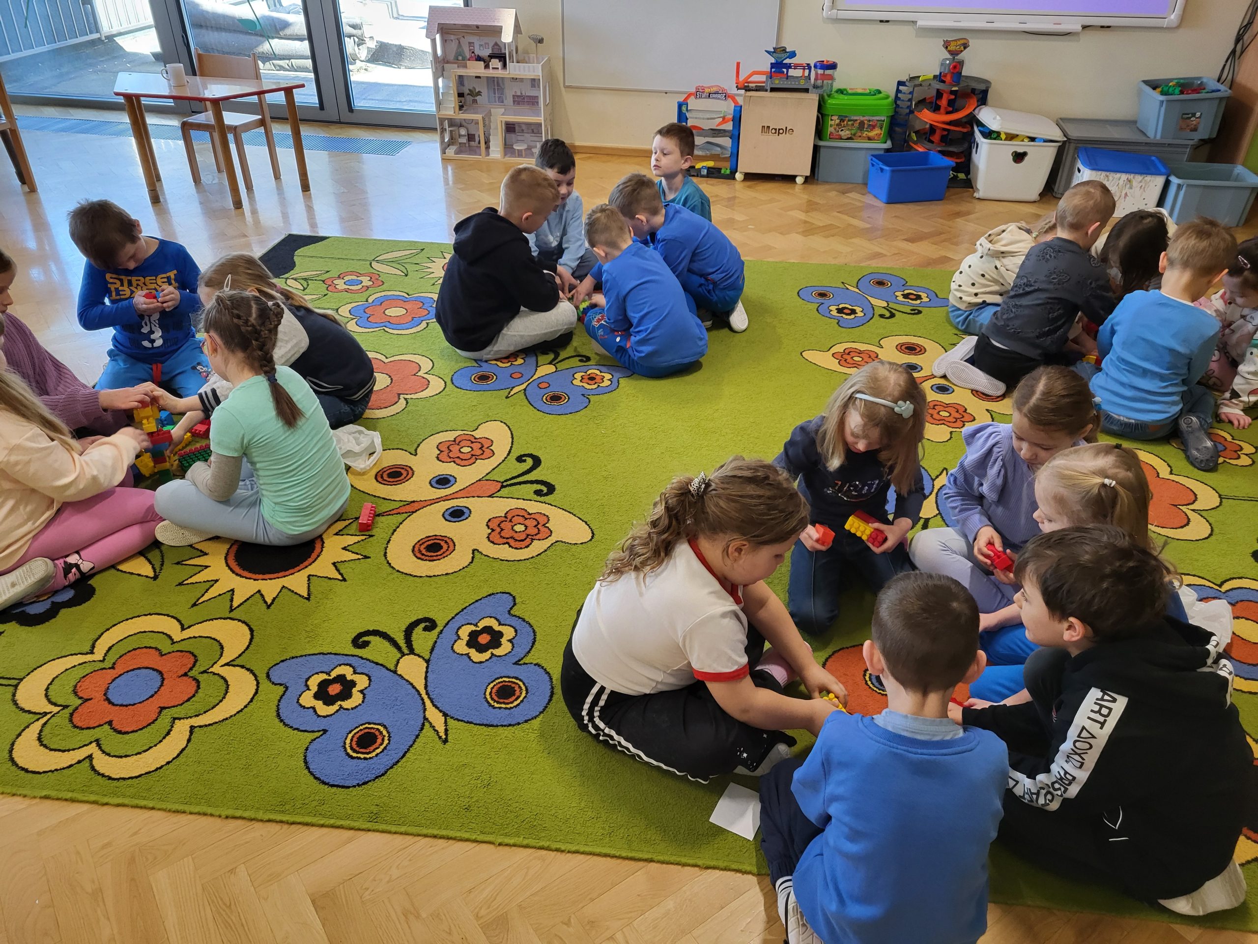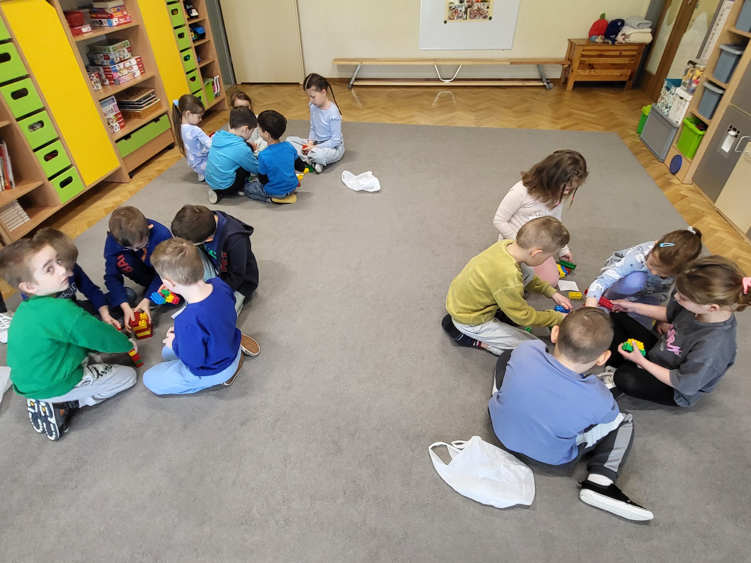 Następnie dzieci pracowały w grupach, budując z klocków dowolne konstrukcje. Omawiały swoje prace, porównywały je i dostrzegały podobieństwa oraz różnice. Ćwiczenie to, pozwoliło dzieciom zrozumieć, że każdy może mieć inny pomysł i wszystkie są równie wartościowe.