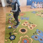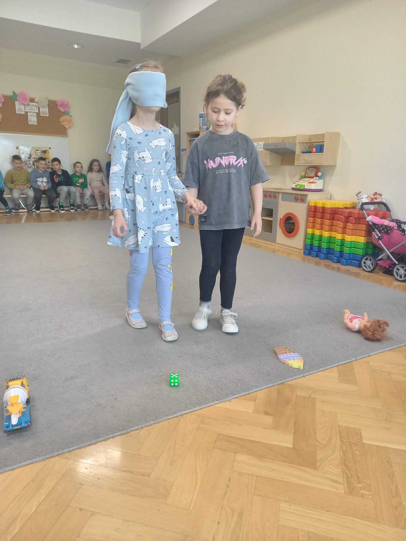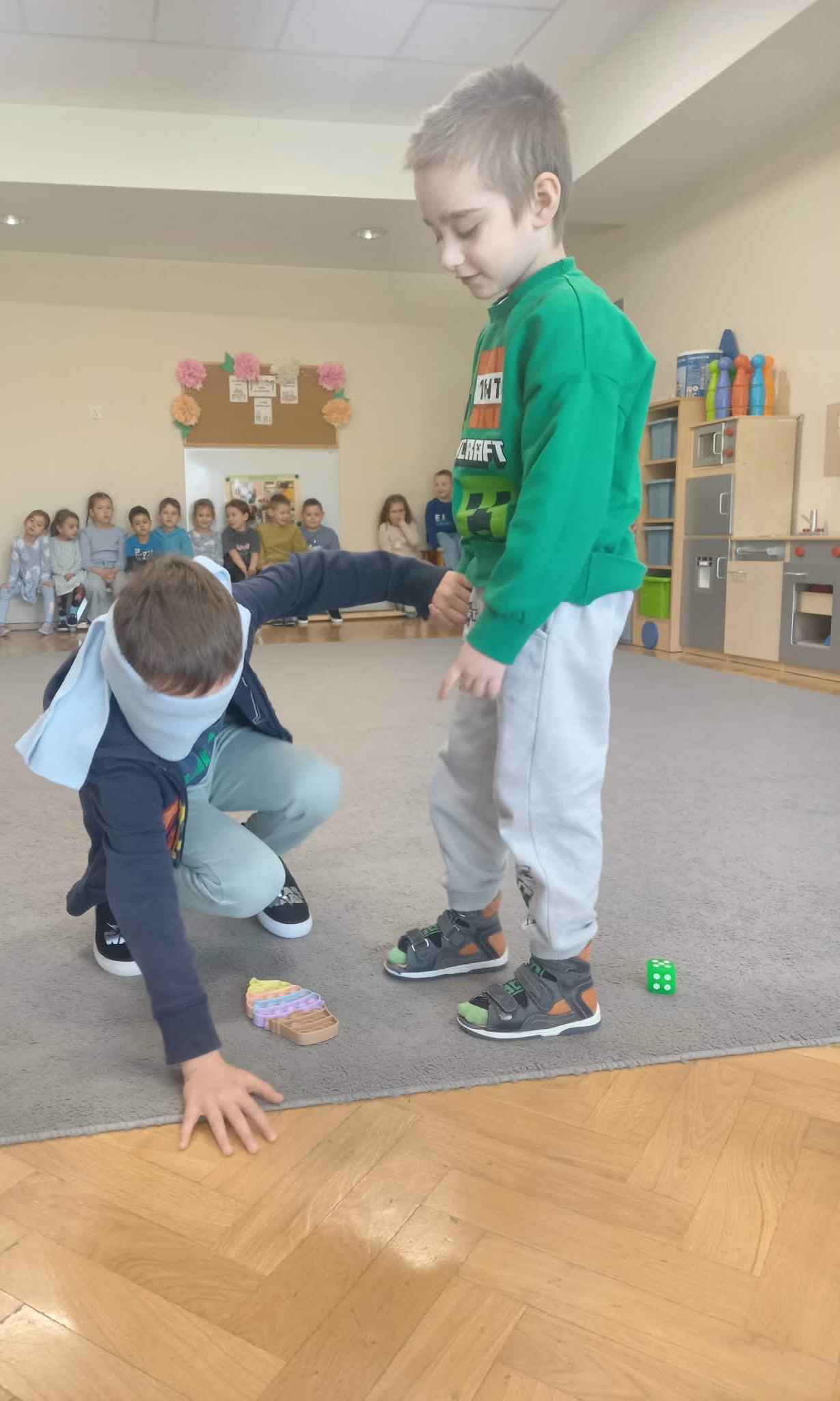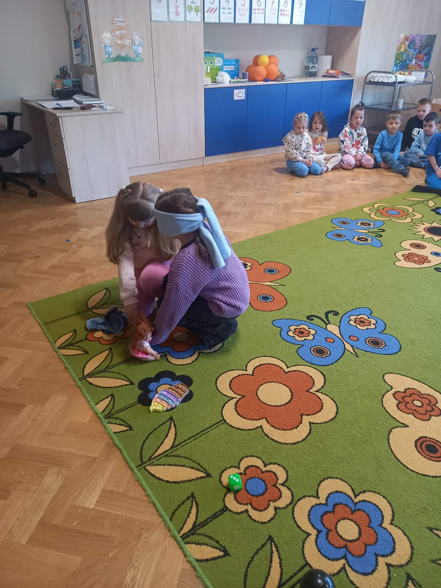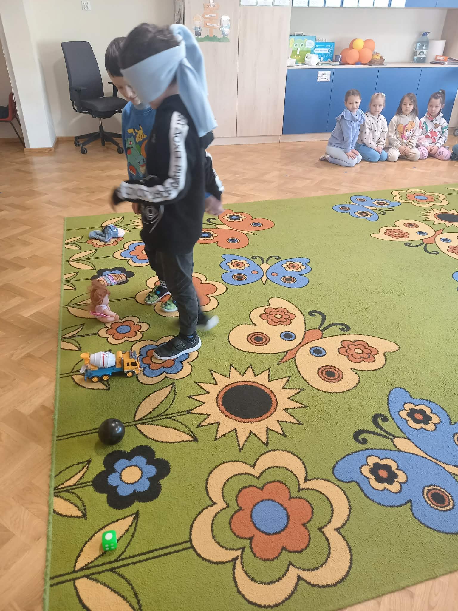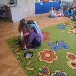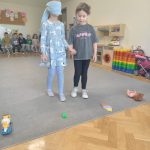 Kolejnym etapem zajęć była zabawa rozwijająca umiejętność pomagania. Dzieci w parach wykonywały zadanie polegające na odnalezieniu przedmiotu przez osobę z zasłoniętymi oczami, przy wsparciu kolegi lub koleżanki. Ćwiczenie to uczyło współpracy, zaufania oraz odpowiedzialności za drugą osobę.