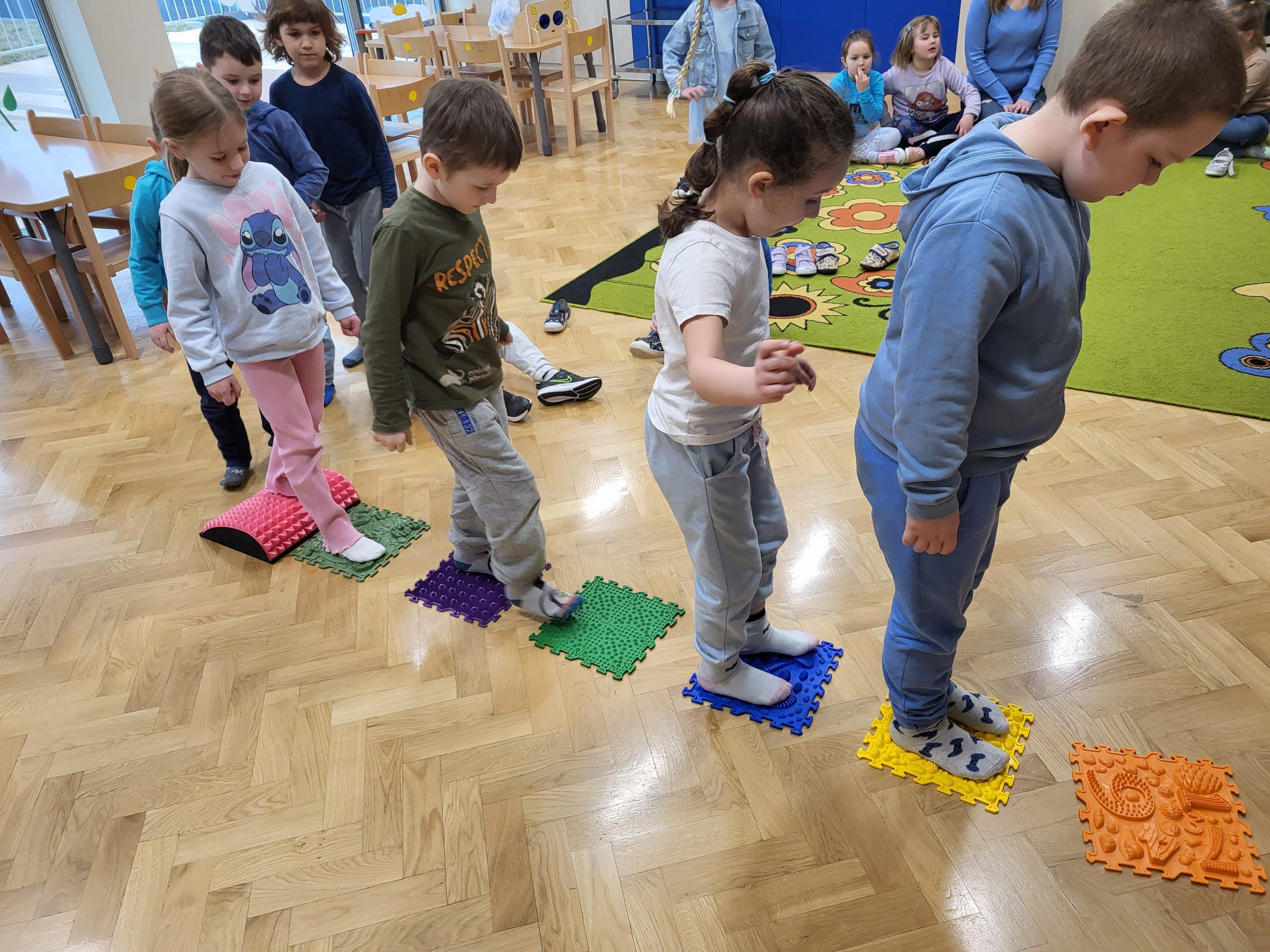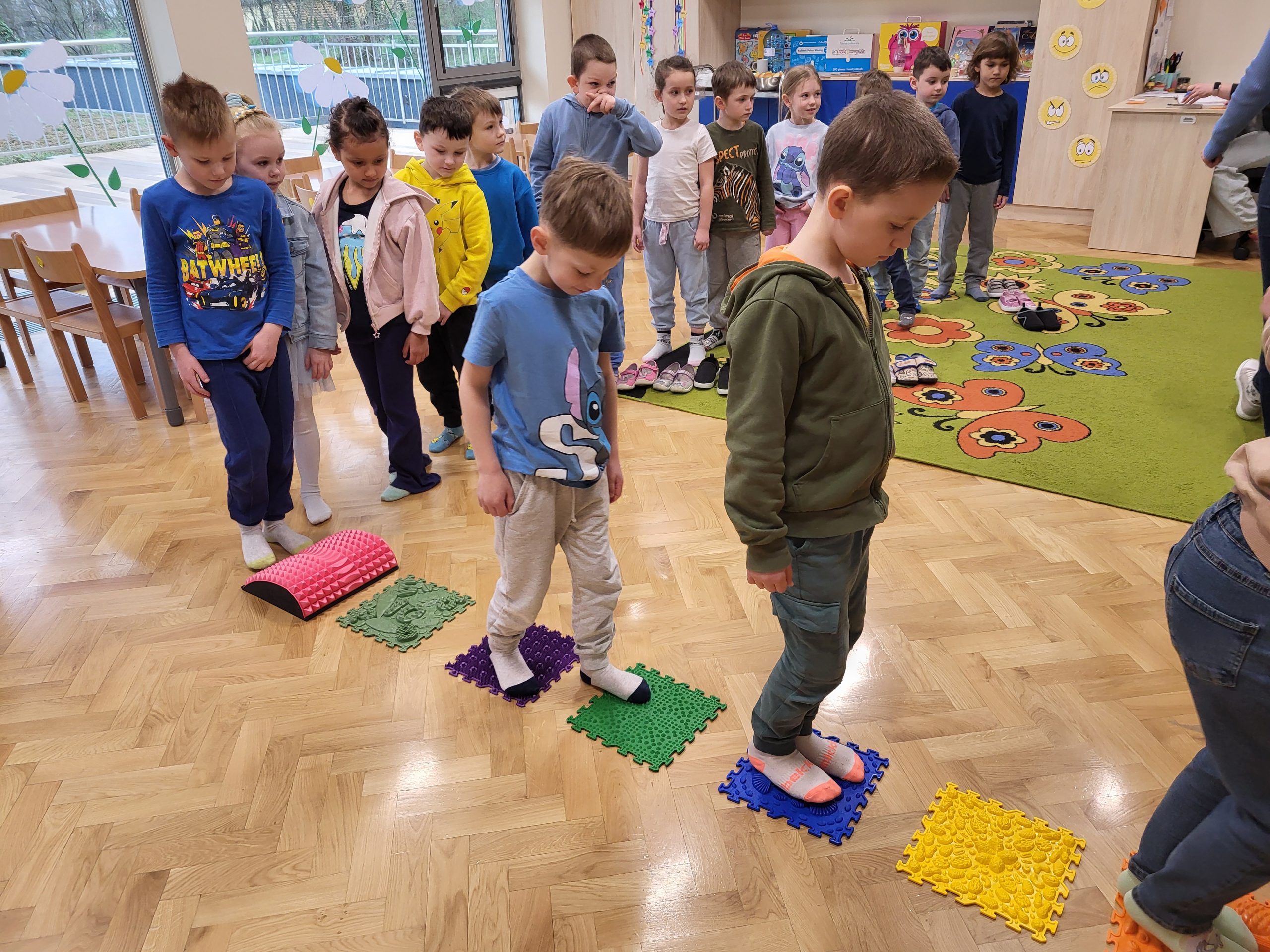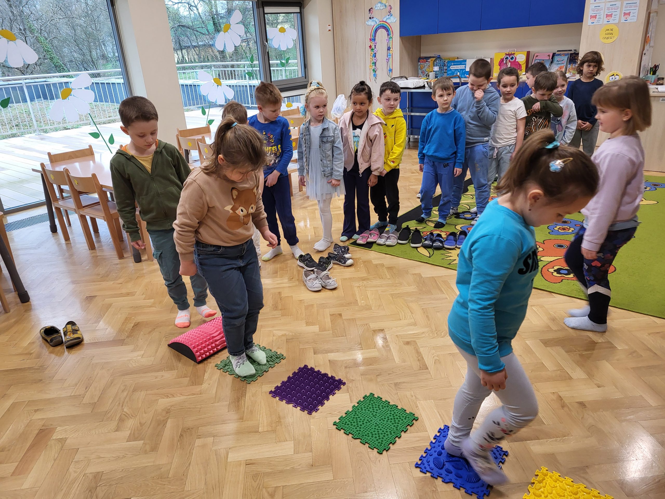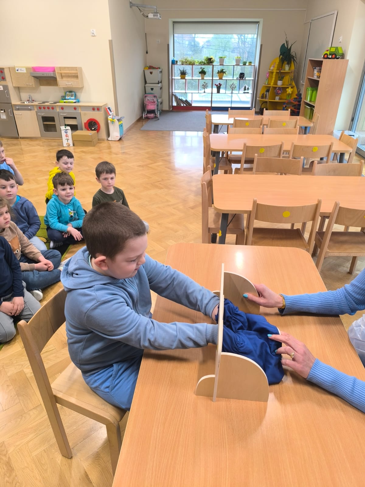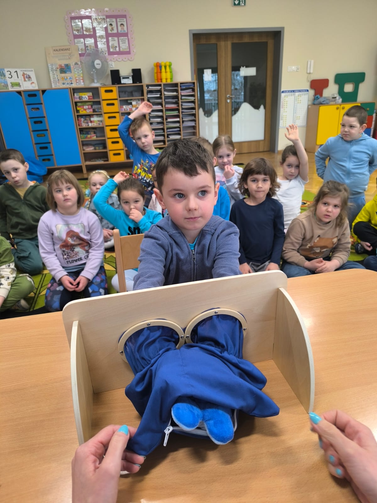We wtorek w naszej grupie obchodziliśmy Światowy Dzień Świadomości Autyzmu. Dzieci założyły niebieskie ubrania, jako wyraz szacunku i solidarności z osobami ze spektrum autyzmu. Celem zajęć było zapoznanie dzieci z pojęciem „autyzm”, charakterystycznymi cechami jakie występują u tych osób, kształtowanie postaw szacunku, tolerancji, akceptacji wobec nich. Na początku dzieci słuchały opowiadania o Janku Błękitku, a następnie aktywnie uczestniczyły w rozmowie na temat głównego bohatera, jego funkcjonowania w grupie, trudności jakie przeżywał oraz sposobów w jaki można było mu pomóc. Następnie przedszkolaki wąchając różne owocowe olejki, miały za zadanie odgadnąć, jaki to zapach. Kolejne zadanie, to spacerowanie po ścieżce sensorycznej, złożonej z różnych faktur i określenie, co czują i czy jest to dla nich przyjemne czy nie. W dalszej części dzieci dotykając przedmiotów bez ich oglądania, miały odgadnąć, co to jest. Na koniec zadaniem przedszkolaków było słuchanie polecenia nauczyciela, podczas gdy w tym czasie w sali panował hałas (klaskanie, rozmowy, bębenki). Dzieci przekonały się, że osoby z autyzmem często mają trudności z mówieniem, rozumieniem relacji społecznych, mogą w odmienny sposób odbierać wrażenia zmysłowe i na nie reagować. Czasem ich odczuwanie jest słabe, a czasem tak mocne, że sprawia im ból. Zajęcia uświadomiły obecnym, że wszyscy potrzebujemy tego samego: akceptacji, zrozumienia, empatii. Każdy ma prawo bawić się, poznawać świat, tak jak potrafi i na miarę swoich możliwości.