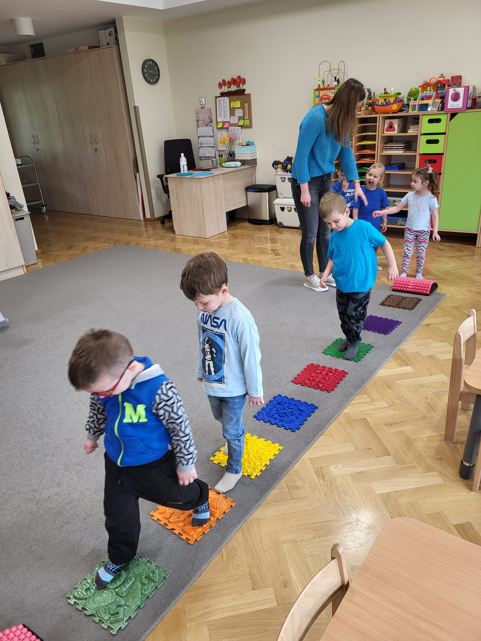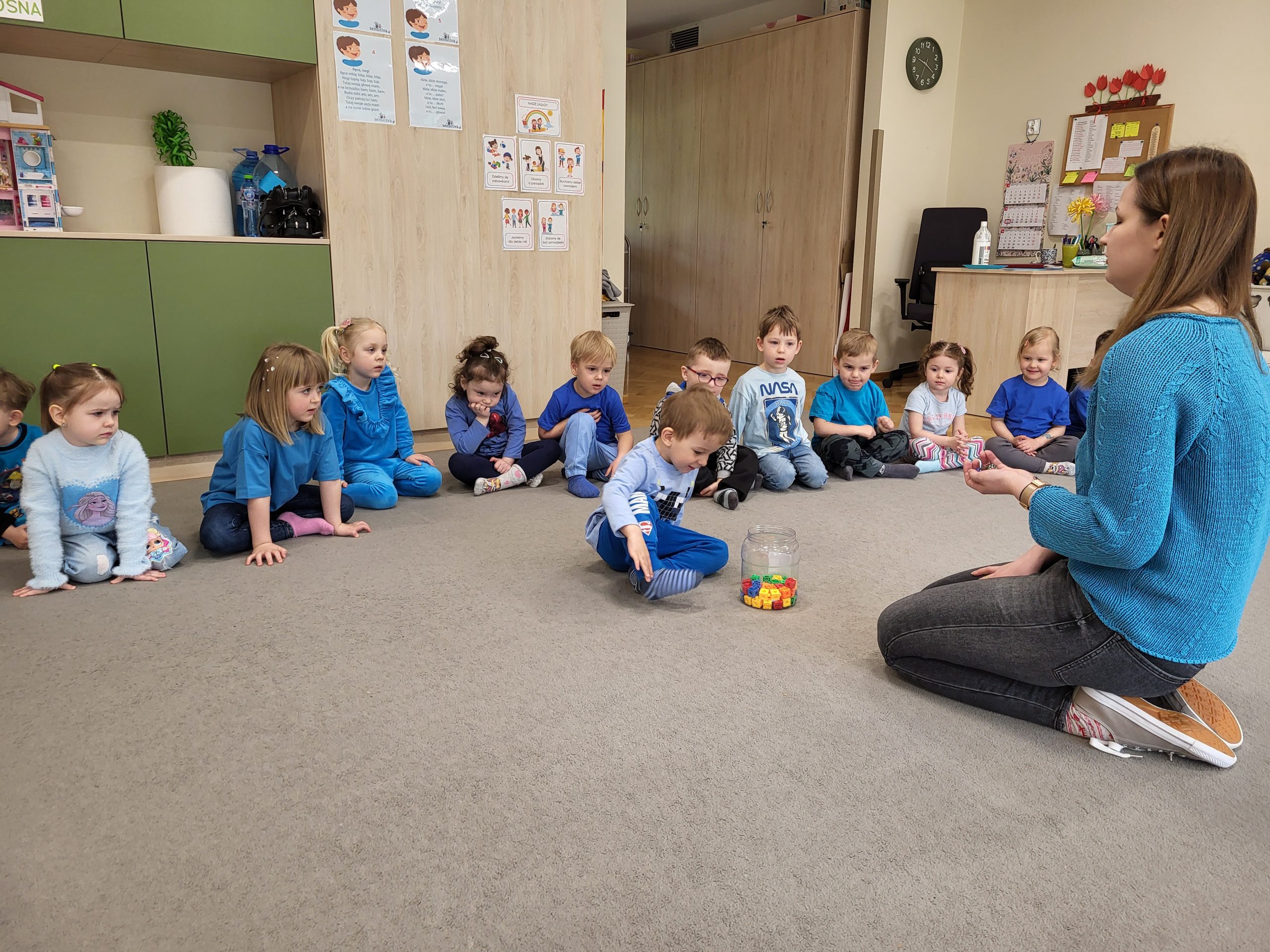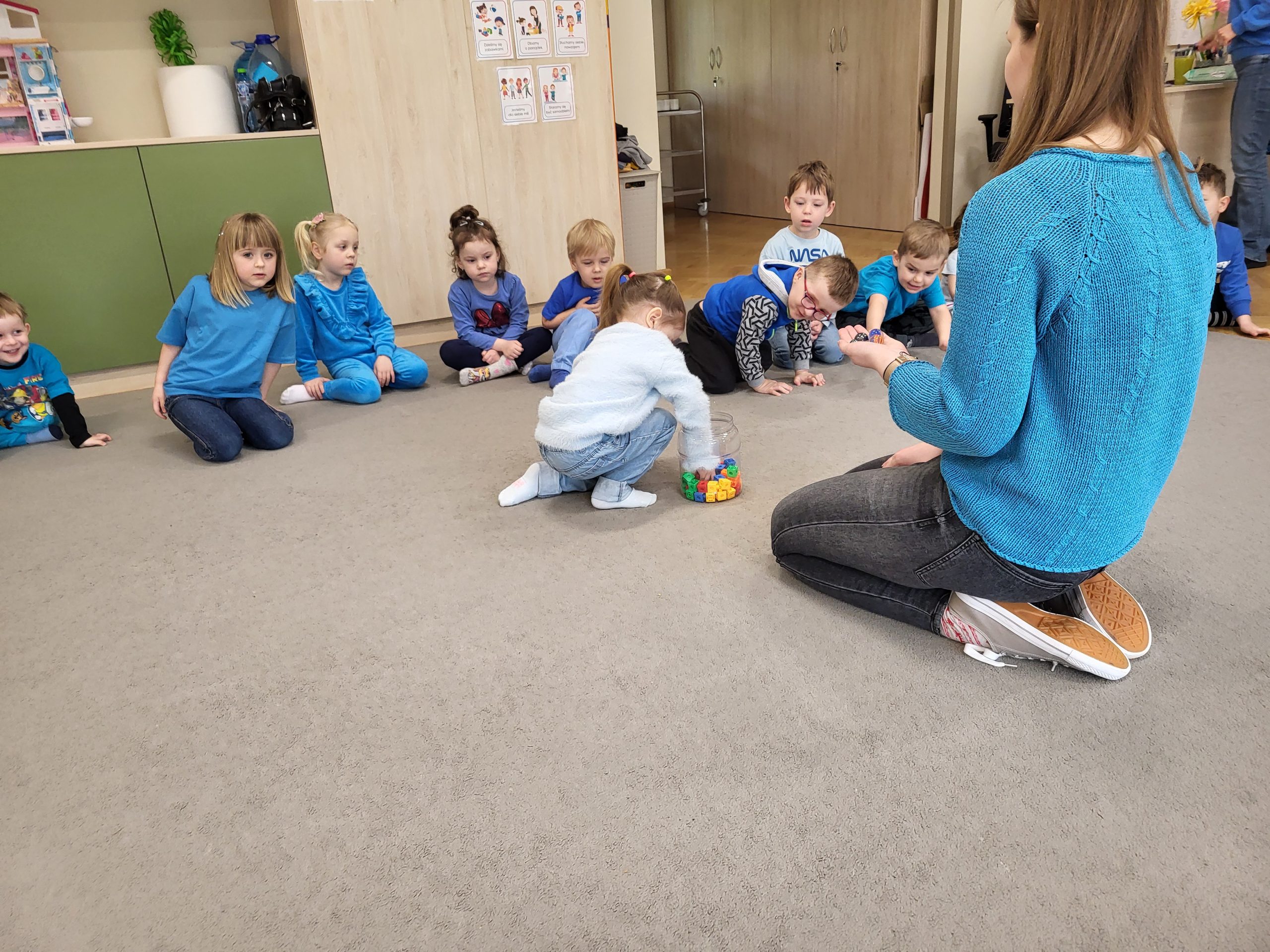 Światowy Dzień Świadomości Autyzmu został ustanowiony przez ONZ w 2007 roku, aby zwiększyć wiedzę o autyzmie i promować akceptację osób w spektrum. Autyzm to sposób, w jaki niektóre dzieci i dorośli odbierają świat. Mogą widzieć, słyszeć i czuć rzeczy inaczej niż inni. Każda osoba z autyzmem jest wyjątkowa. Z racji tego dnia 31 marca w naszym przedszkolu odbyły się zajęcia, których celem było zapoznanie dzieci z pojęciem „autyzm”, stymulacja sensoryczna i uświadomienie dzieciom, że każdy może inaczej odczuwać bodźce dotykowe. Podczas zajęć dzieci zapoznały się z filmem „Jaś i niebieskie motyle”. Miały możliwość przejścia po ścieżce sensorycznej i szukania kuleczek w klockach, co dostarczyło dzieciom niezapomnianych wrażeń dotykowych.