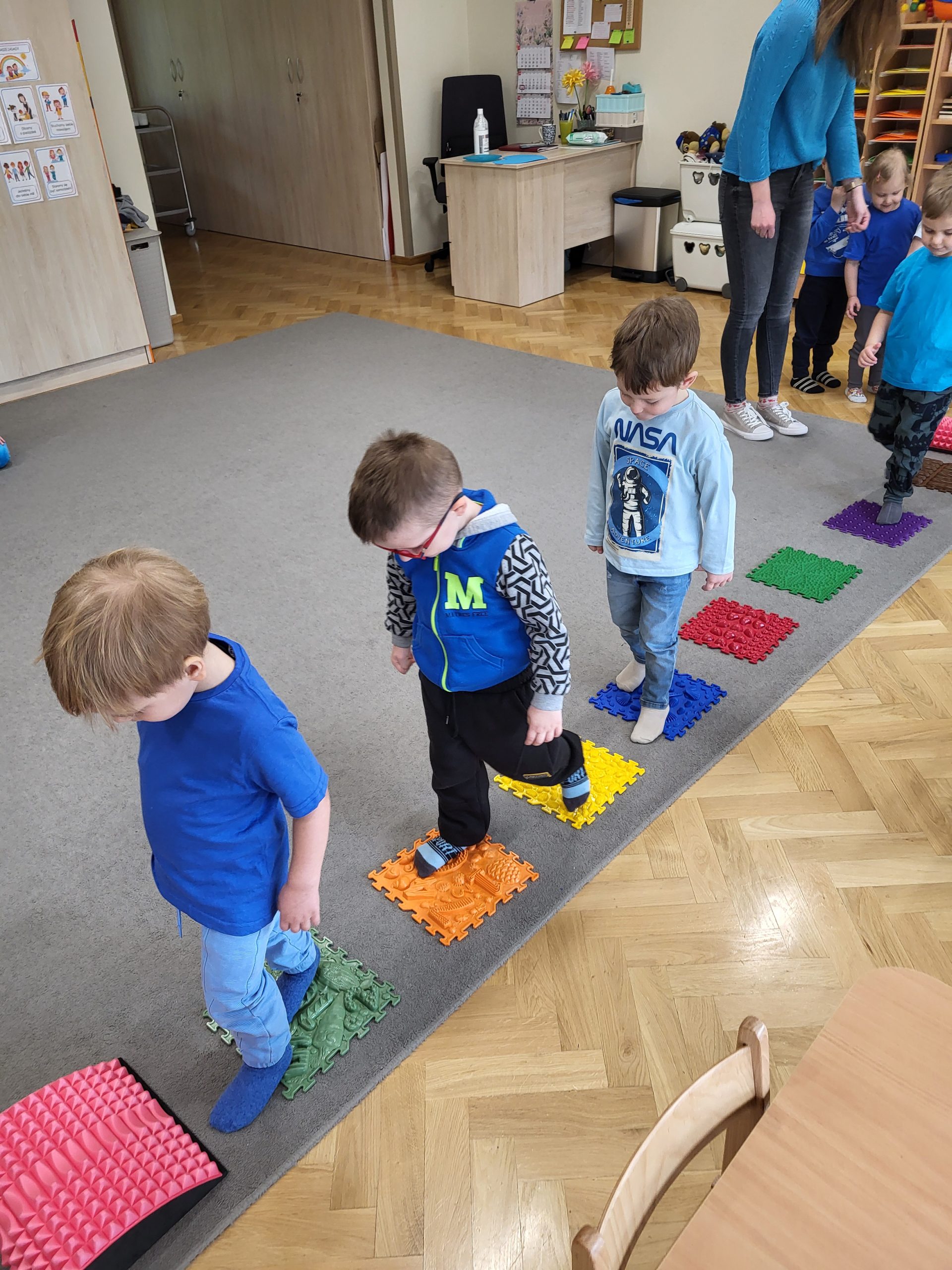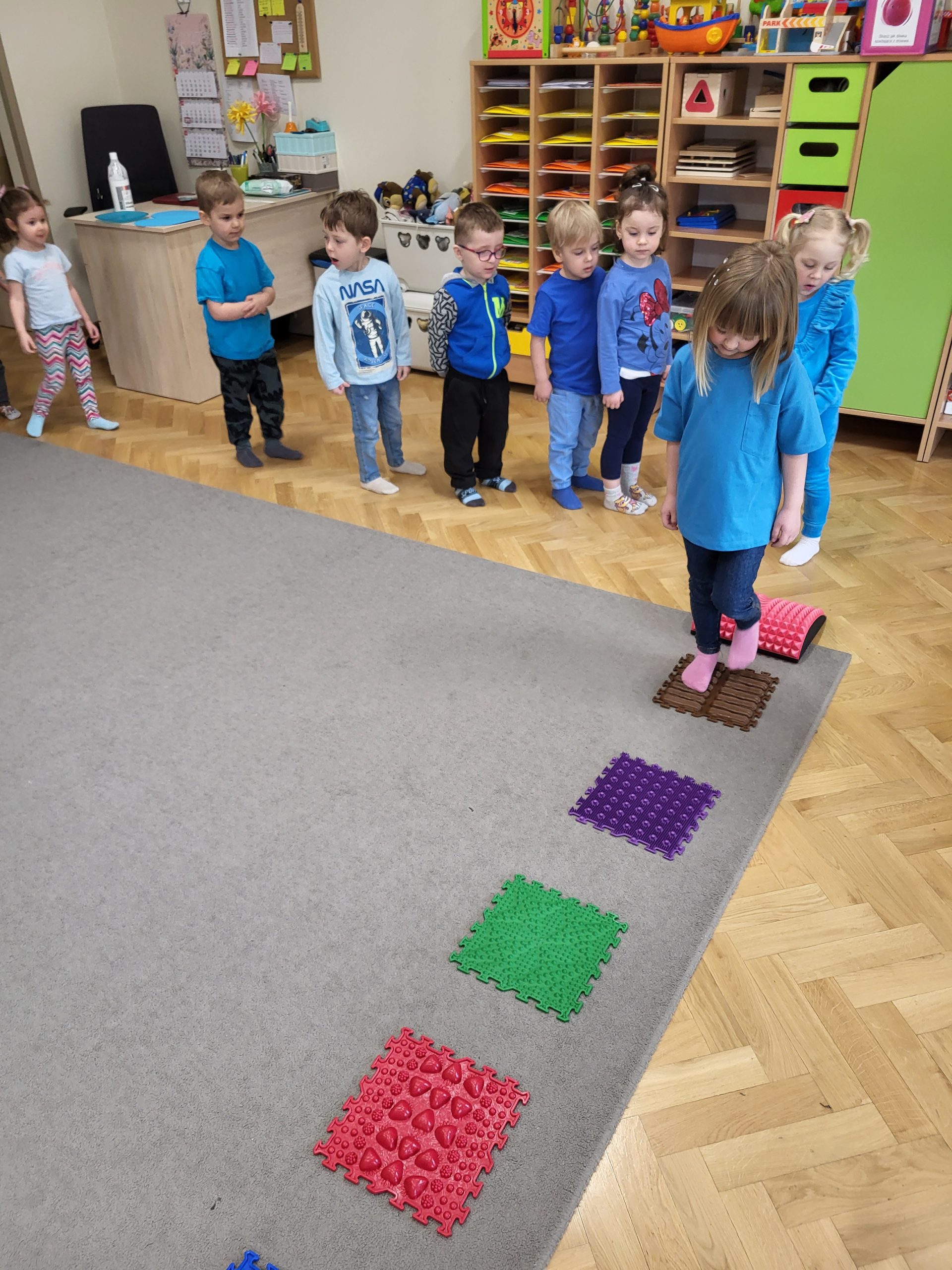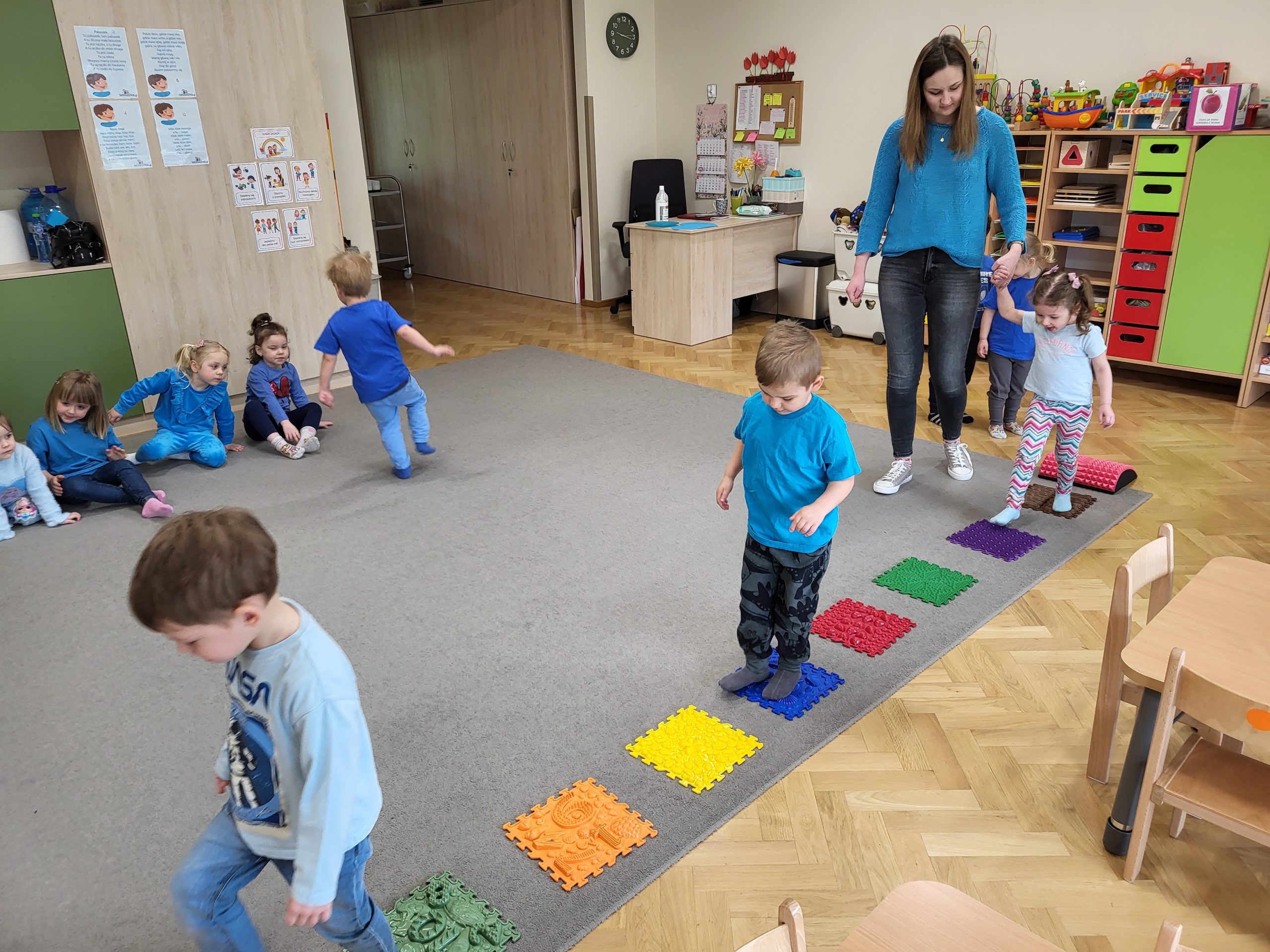 Światowy Dzień Świadomości Autyzmu został ustanowiony przez ONZ w 2007 roku, aby zwiększyć wiedzę o autyzmie i promować akceptację osób w spektrum. Autyzm to sposób, w jaki niektóre dzieci i dorośli odbierają świat. Mogą widzieć, słyszeć i czuć rzeczy inaczej niż inni. Każda osoba z autyzmem jest wyjątkowa. Z racji tego dnia 31 marca w naszym przedszkolu odbyły się zajęcia, których celem było zapoznanie dzieci z pojęciem „autyzm”, stymulacja sensoryczna i uświadomienie dzieciom, że każdy może inaczej odczuwać bodźce dotykowe. Podczas zajęć dzieci zapoznały się z filmem „Jaś i niebieskie motyle”. Miały możliwość przejścia po ścieżce sensorycznej i szukania kuleczek w klockach, co dostarczyło dzieciom niezapomnianych wrażeń dotykowych.