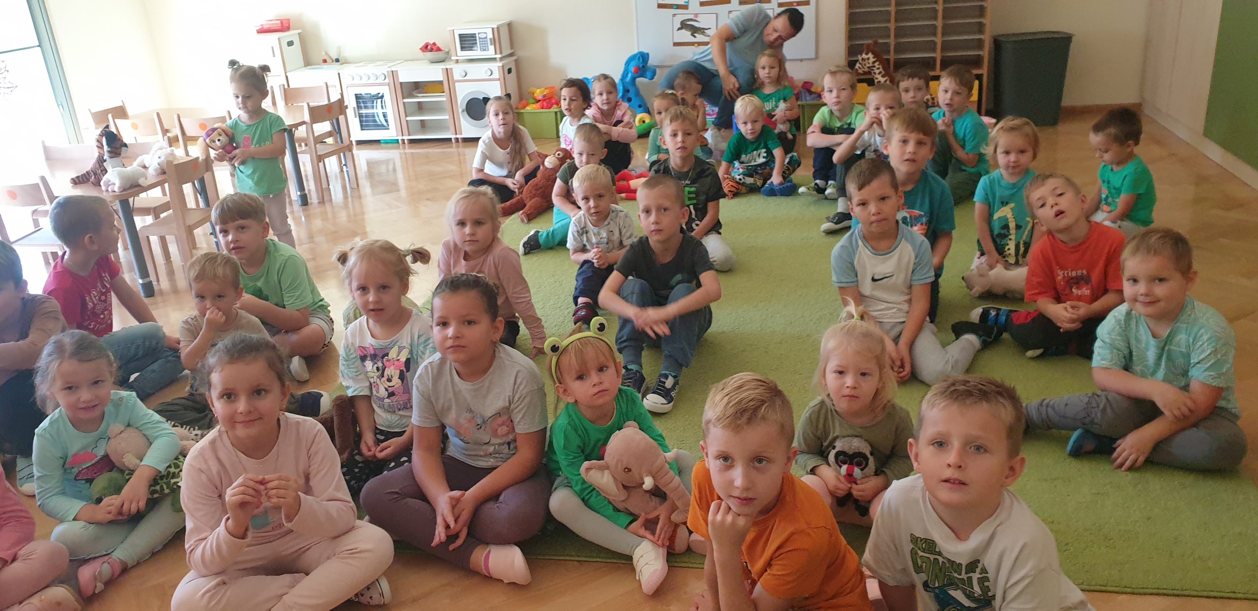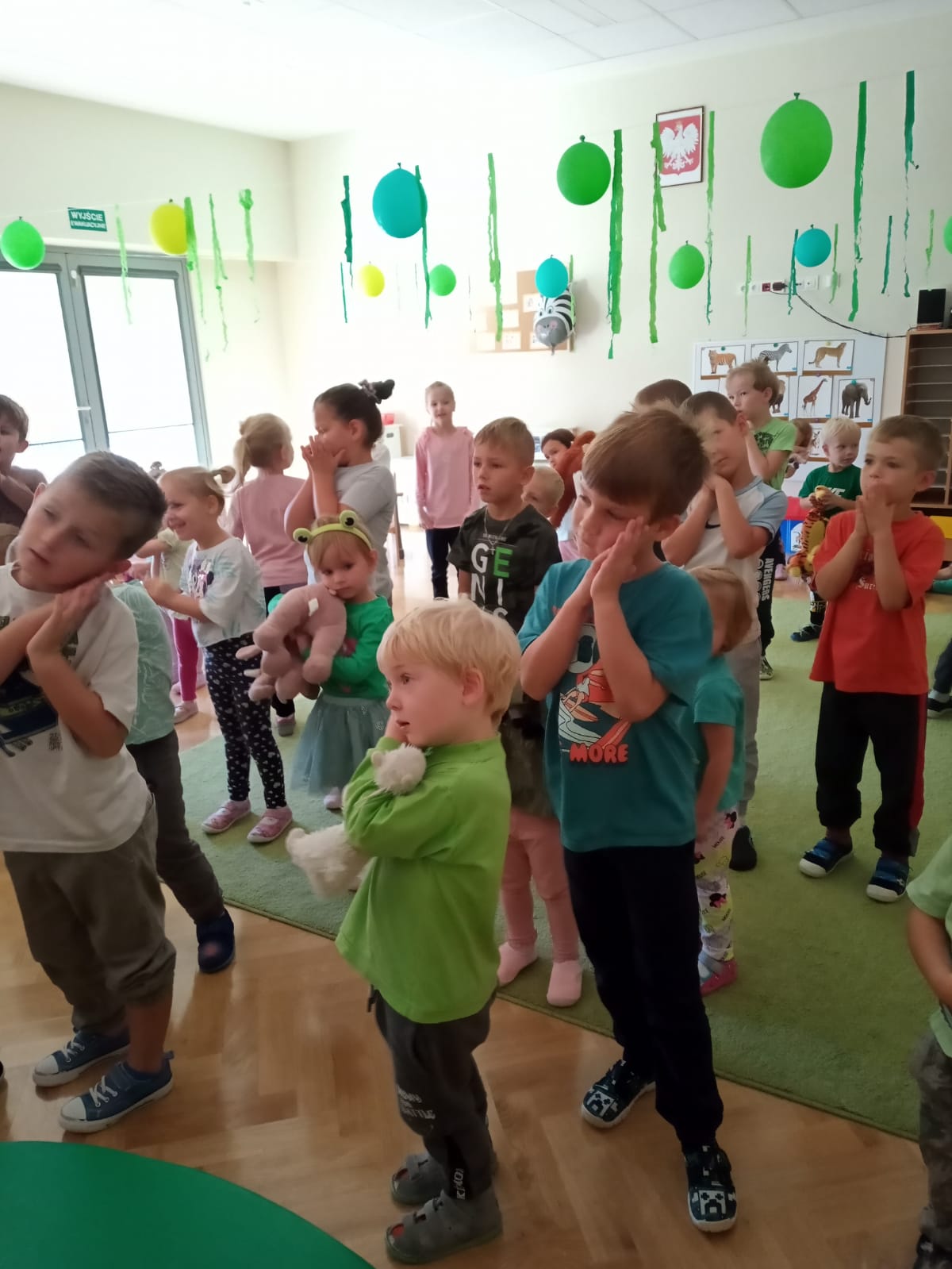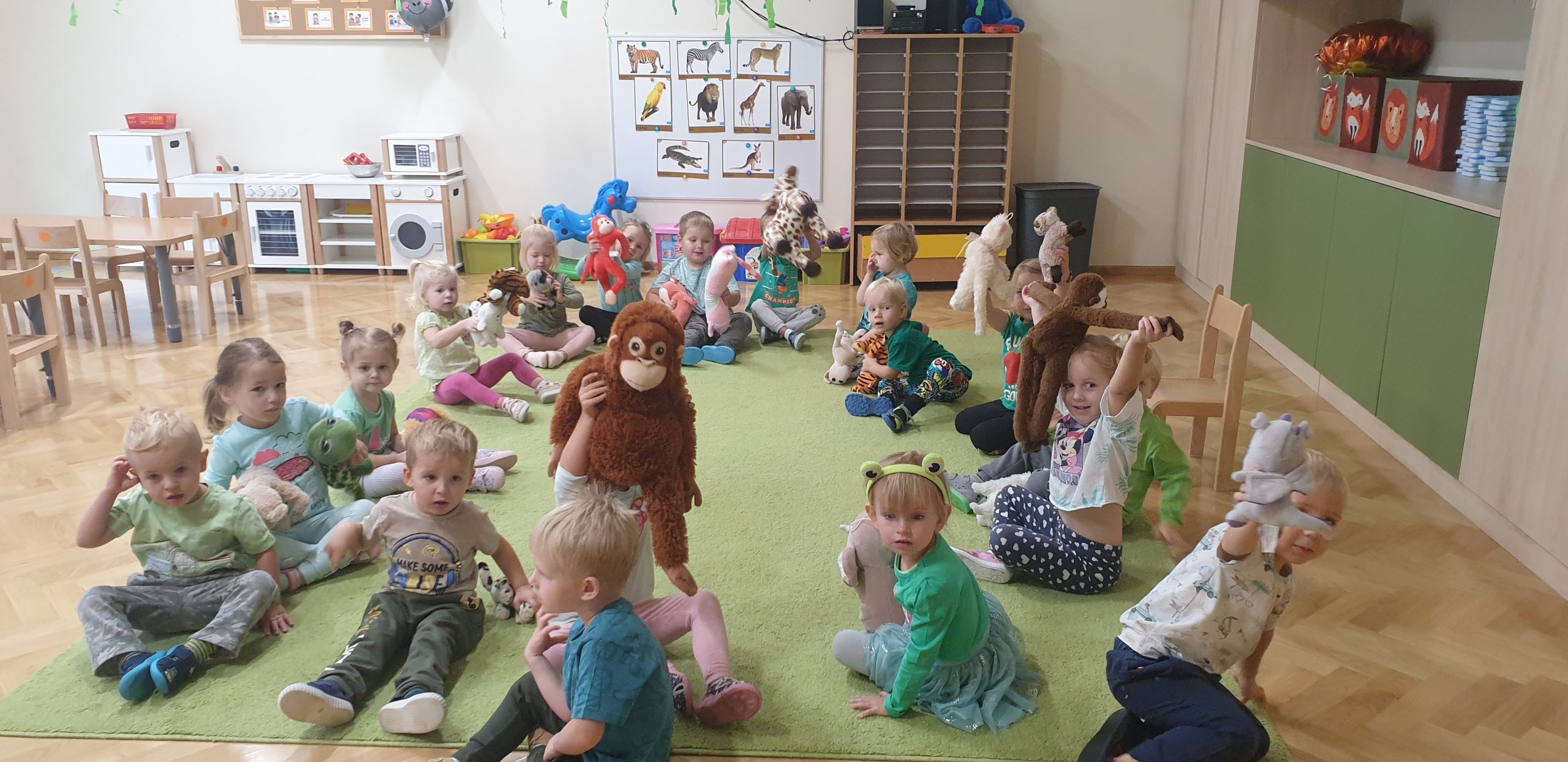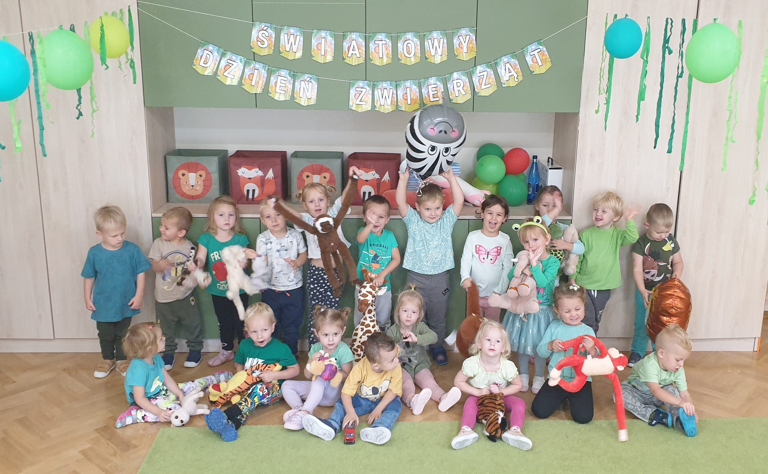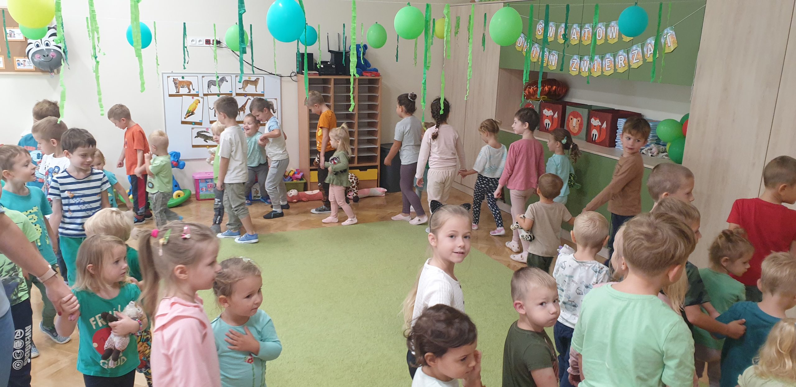 4 października obchodziliśmy w naszej grupie Światowy Dzień Zwierząt. Maluszki w tym dniu przyniosły swoje maskotki przedstawiające zwierzęta, słuchały opowiadania o wycieczce do zoo, odgadywały nazwy zwierząt na podstawie ich odgłosów. Tego dnia do świętowania dołączyła do nas grupa VI. Dzieci wspólnie bawiły się do piosenek, wspólnie maszerowały w rytm muzyki, ćwiczyły mięśnie z lwem Leonem, a na koniec nauczyły się wykonywać afrykański masażyk. Tego dnia świetnie się bawiliśmy, a kolorowe dekoracje w naszej sali sprawiły, że ten dzień był bardzo udany!