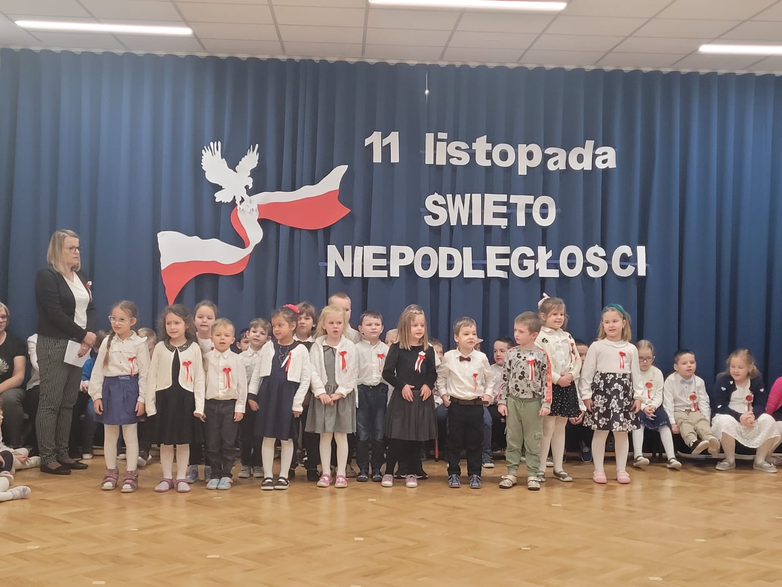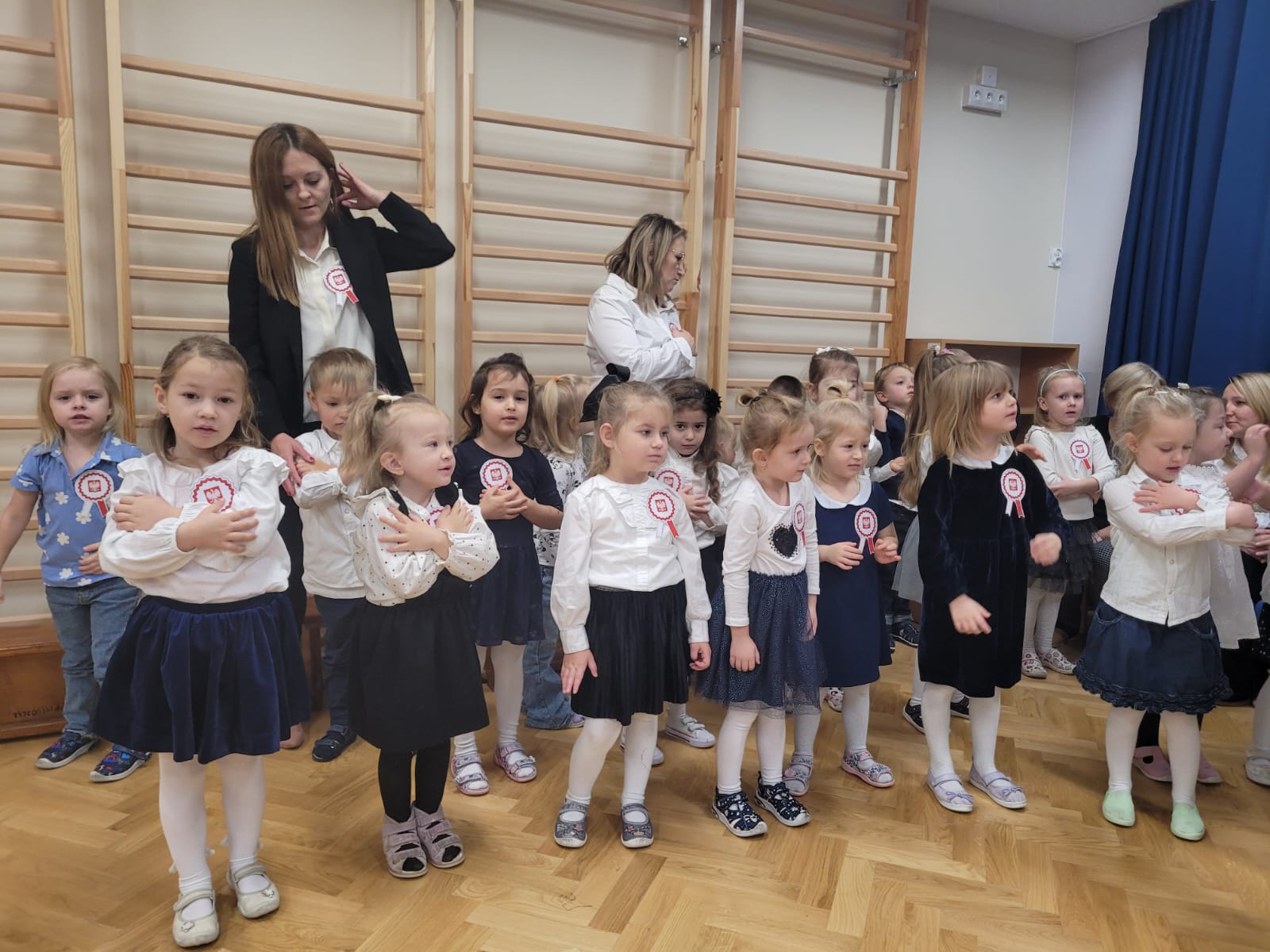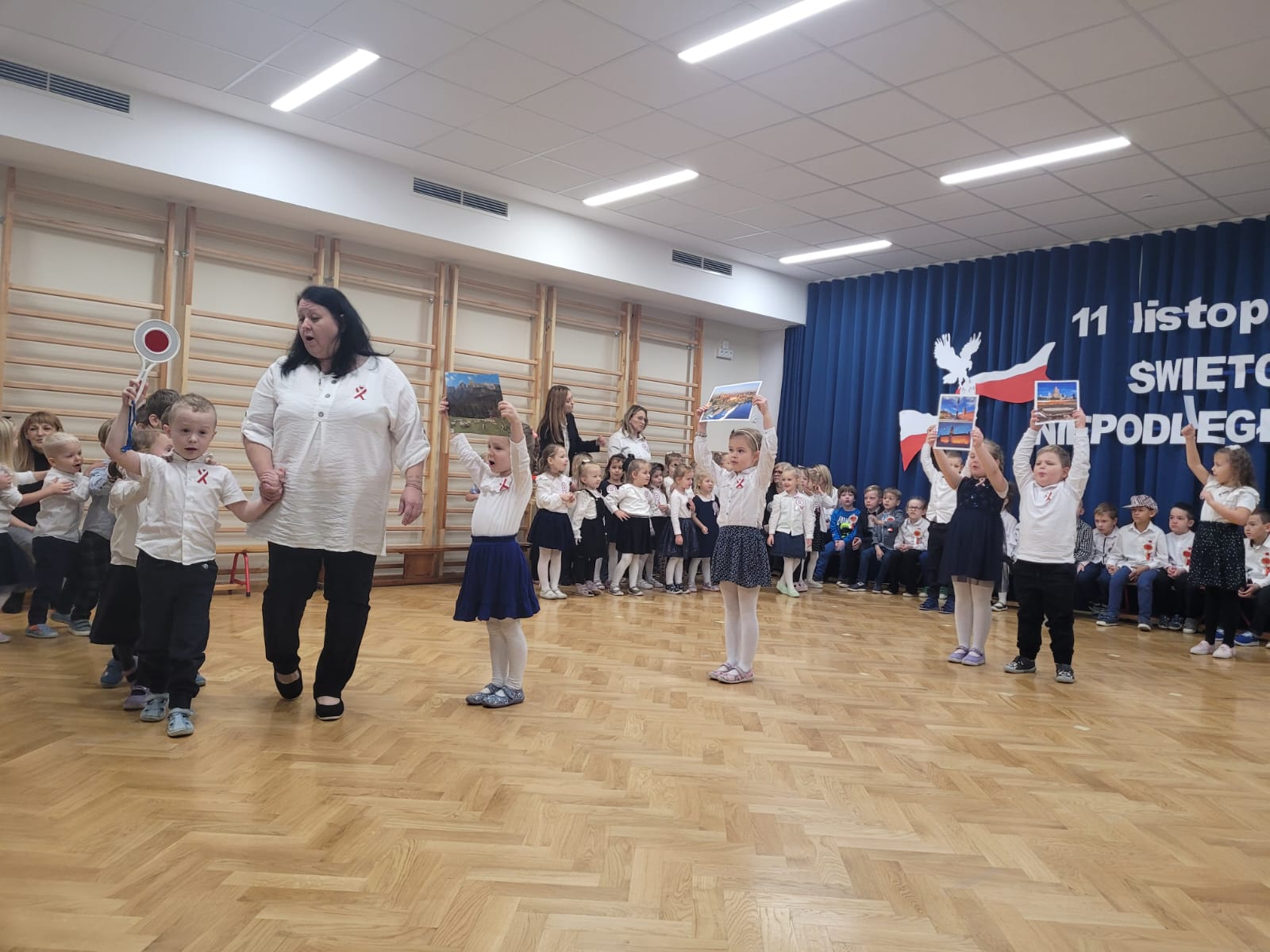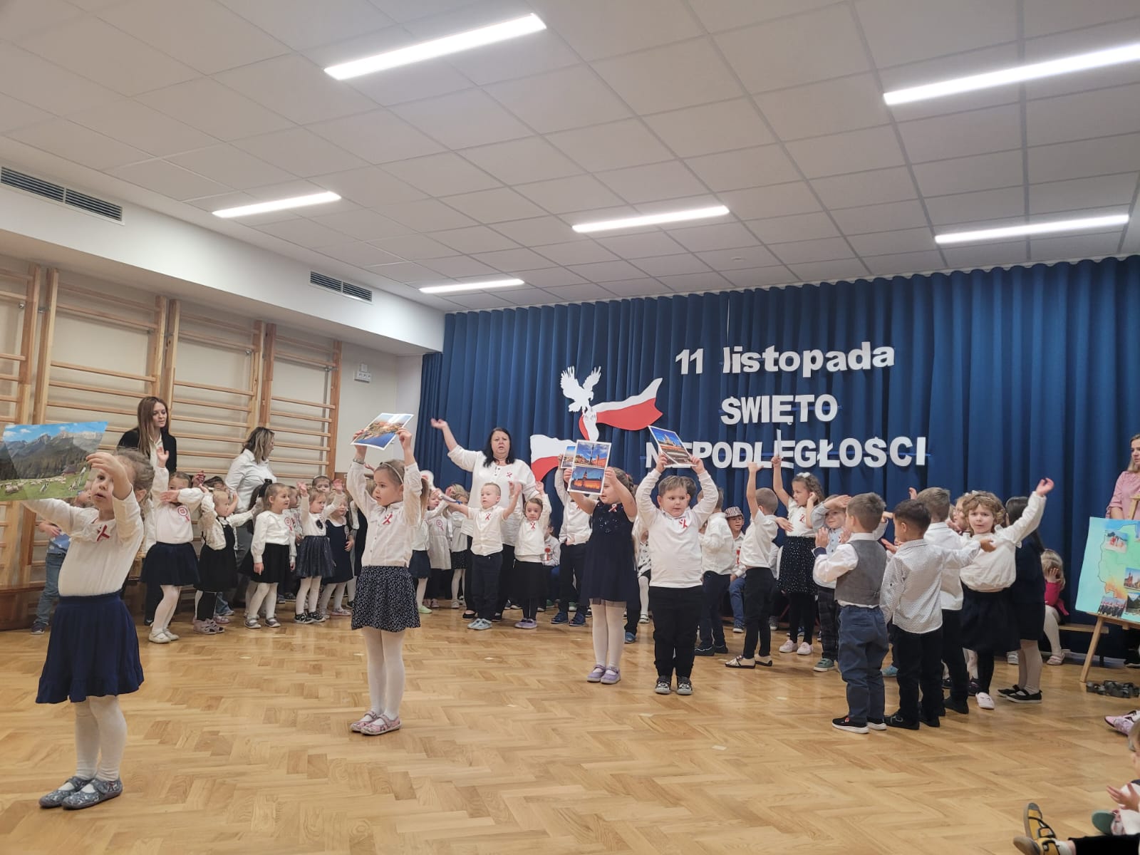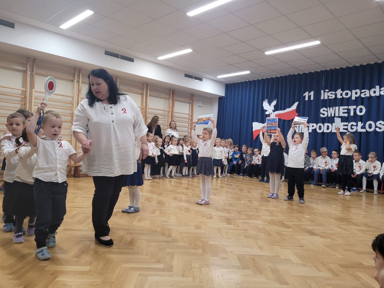 W tym roku nasze przedszkole włączyło się w ogólnopolską akcję „Szkoła do Hymnu”. 8 listopada 2024 r. o godz. 11:11 dzieci z wszystkich grup uroczyście odśpiewały na sali gimnastycznej Hymn Polski – „Mazurka Dąbrowskiego”. Inicjatorem akcji jest Ministerstwo Edukacji i Nauki, które zaprosiło szkoły, przedszkola, placówki oświatowe do odśpiewania, o symbolicznej godzinie, 4-zwrotkowego Hymnu Narodowego. Jej celem jest zachęcenie dzieci i młodzieży do wspólnego przeżywania Narodowego Święta Niepodległości oraz kształtowanie szacunku wobec polskich symboli narodowych. Już najmłodsze przedszkolaki znają godło, flagę i hymn naszego kraju. Podczas trwania hymnu dzieci zaprezentowały godną pochwały postawę skupienia i powagi. Bez wątpienia wydarzenie to było dla nich ważną lekcją patriotyzmu.
