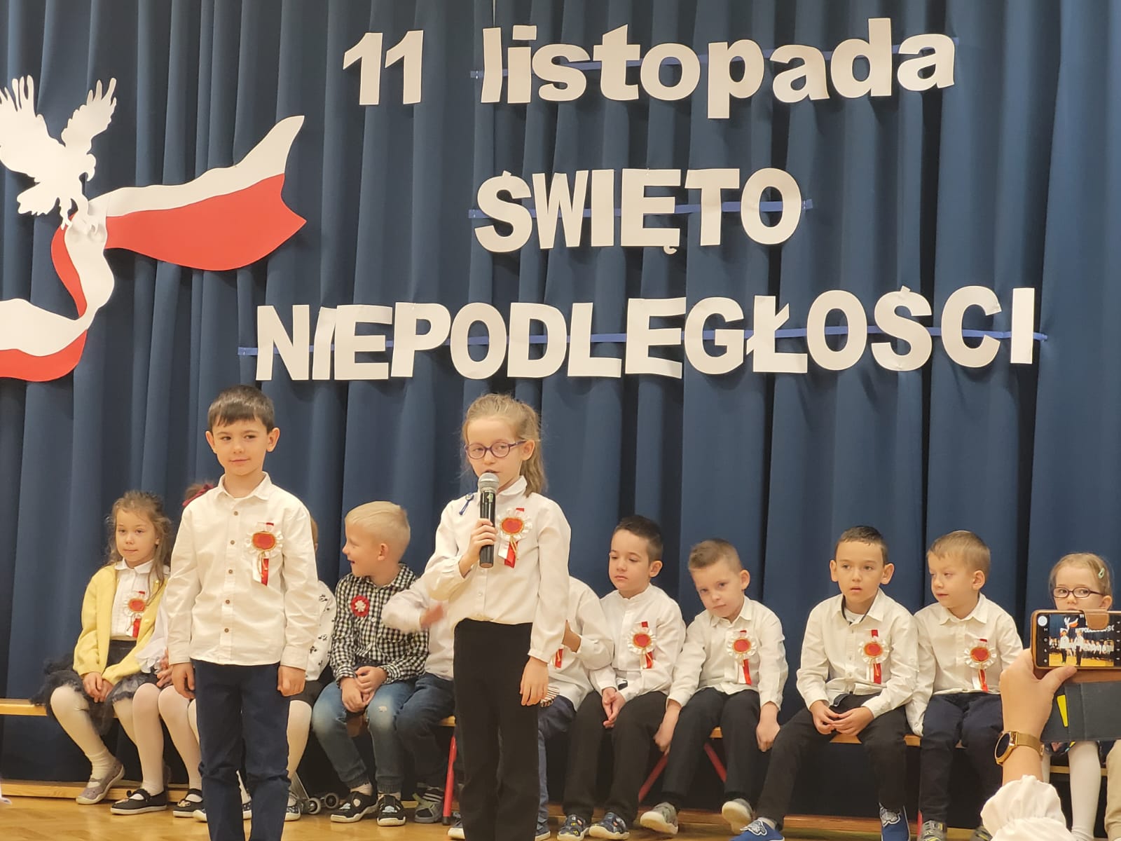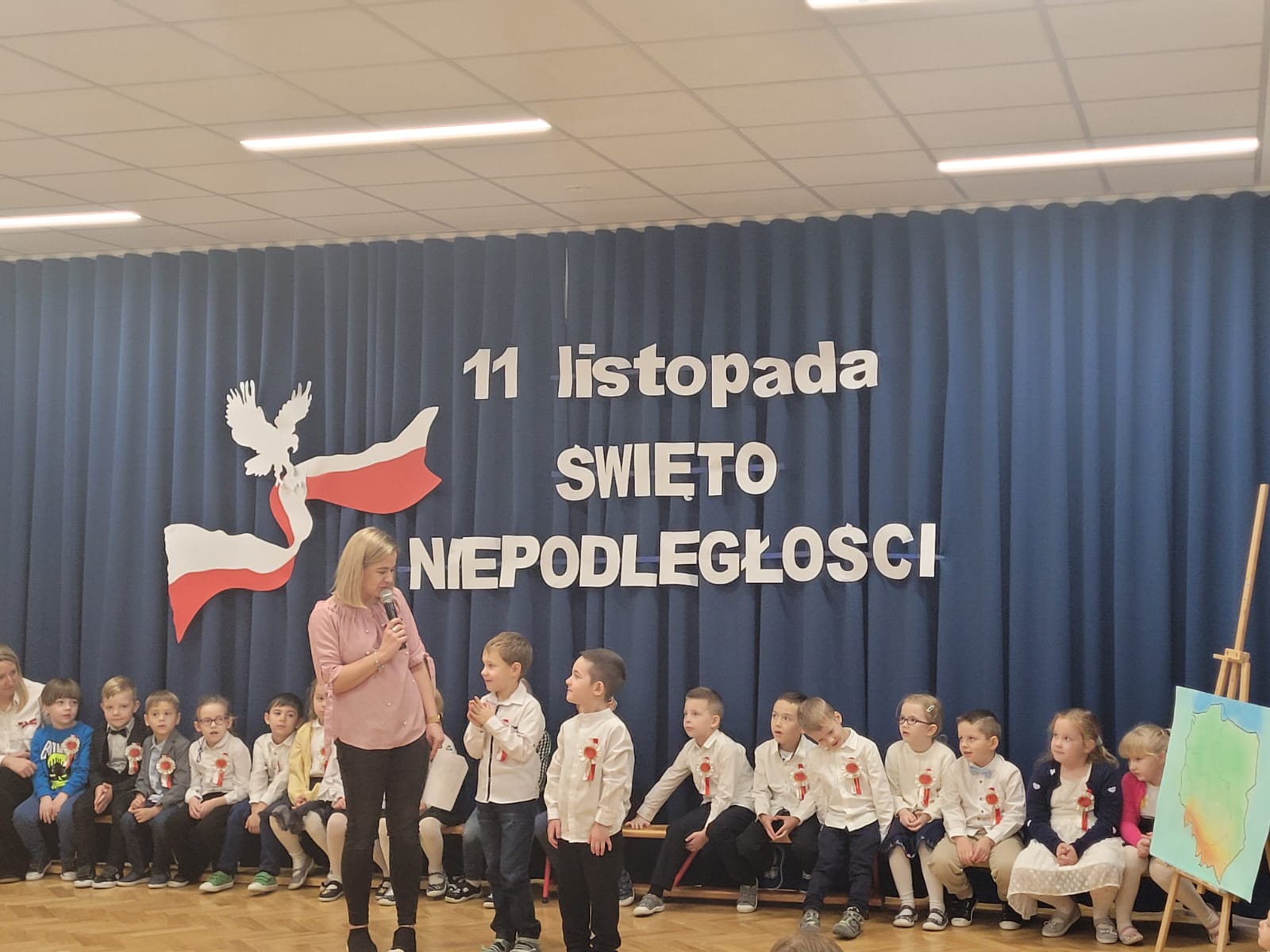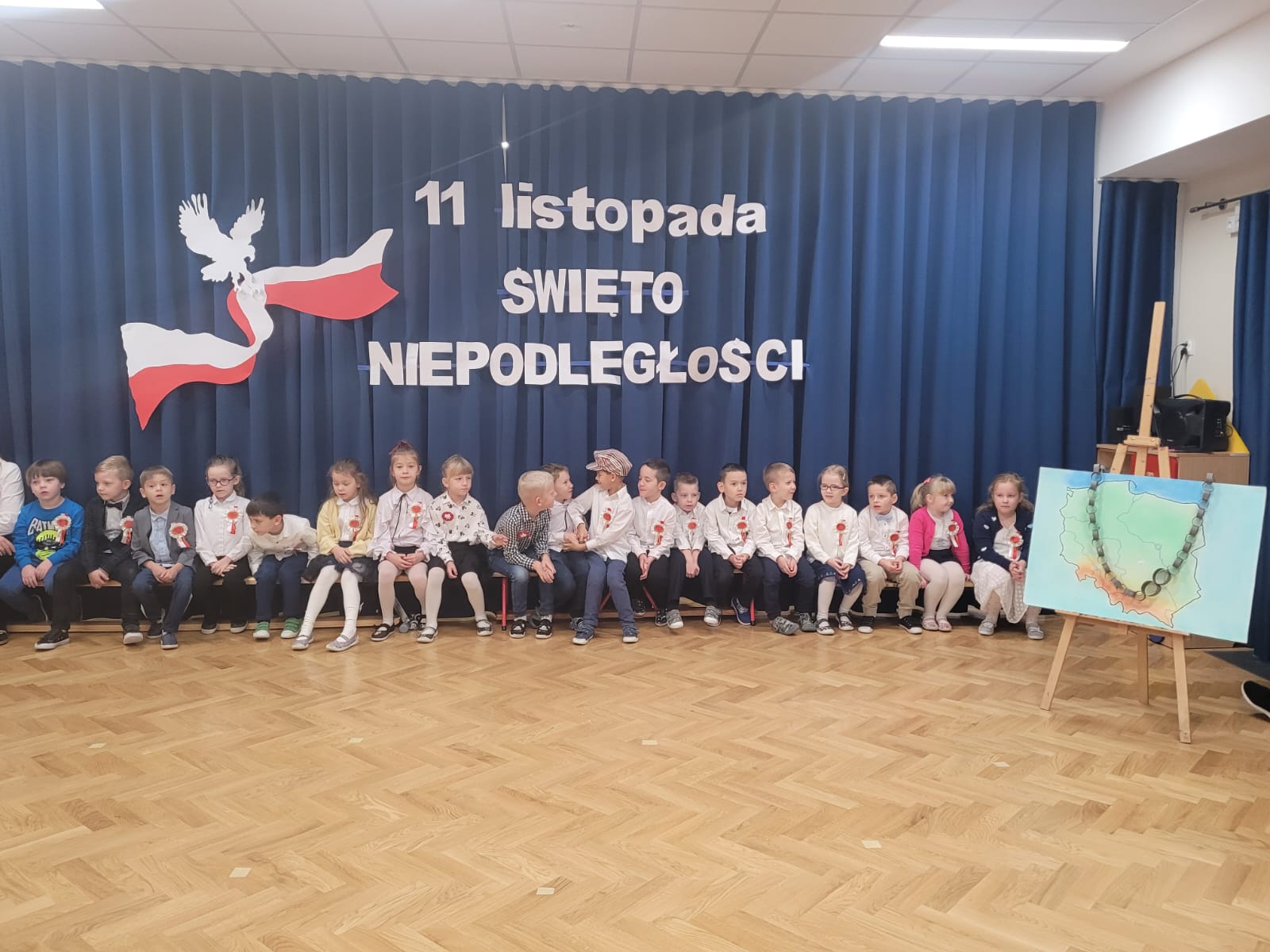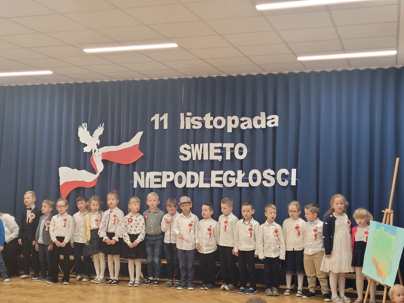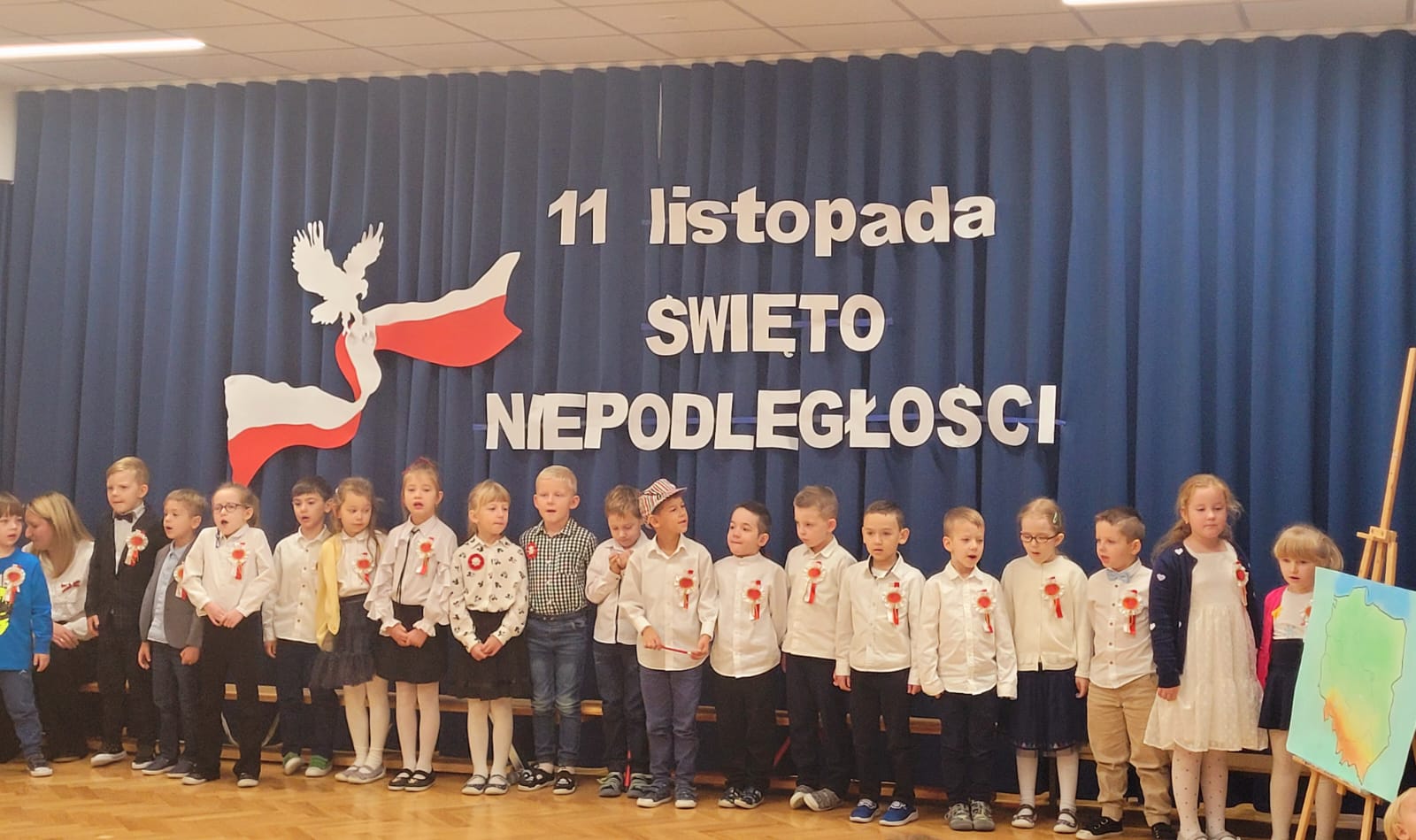 W tym roku nasze przedszkole włączyło się w ogólnopolską akcję „Szkoła do Hymnu”. 8 listopada 2024 r. o godz. 11:11 dzieci z wszystkich grup uroczyście odśpiewały na sali gimnastycznej Hymn Polski – „Mazurka Dąbrowskiego”. Inicjatorem akcji jest Ministerstwo Edukacji i Nauki, które zaprosiło szkoły, przedszkola, placówki oświatowe do odśpiewania, o symbolicznej godzinie, 4-zwrotkowego Hymnu Narodowego. Jej celem jest zachęcenie dzieci i młodzieży do wspólnego przeżywania Narodowego Święta Niepodległości oraz kształtowanie szacunku wobec polskich symboli narodowych. Już najmłodsze przedszkolaki znają godło, flagę i hymn naszego kraju. Podczas trwania hymnu dzieci zaprezentowały godną pochwały postawę skupienia i powagi. Bez wątpienia wydarzenie to było dla nich ważną lekcją patriotyzmu.