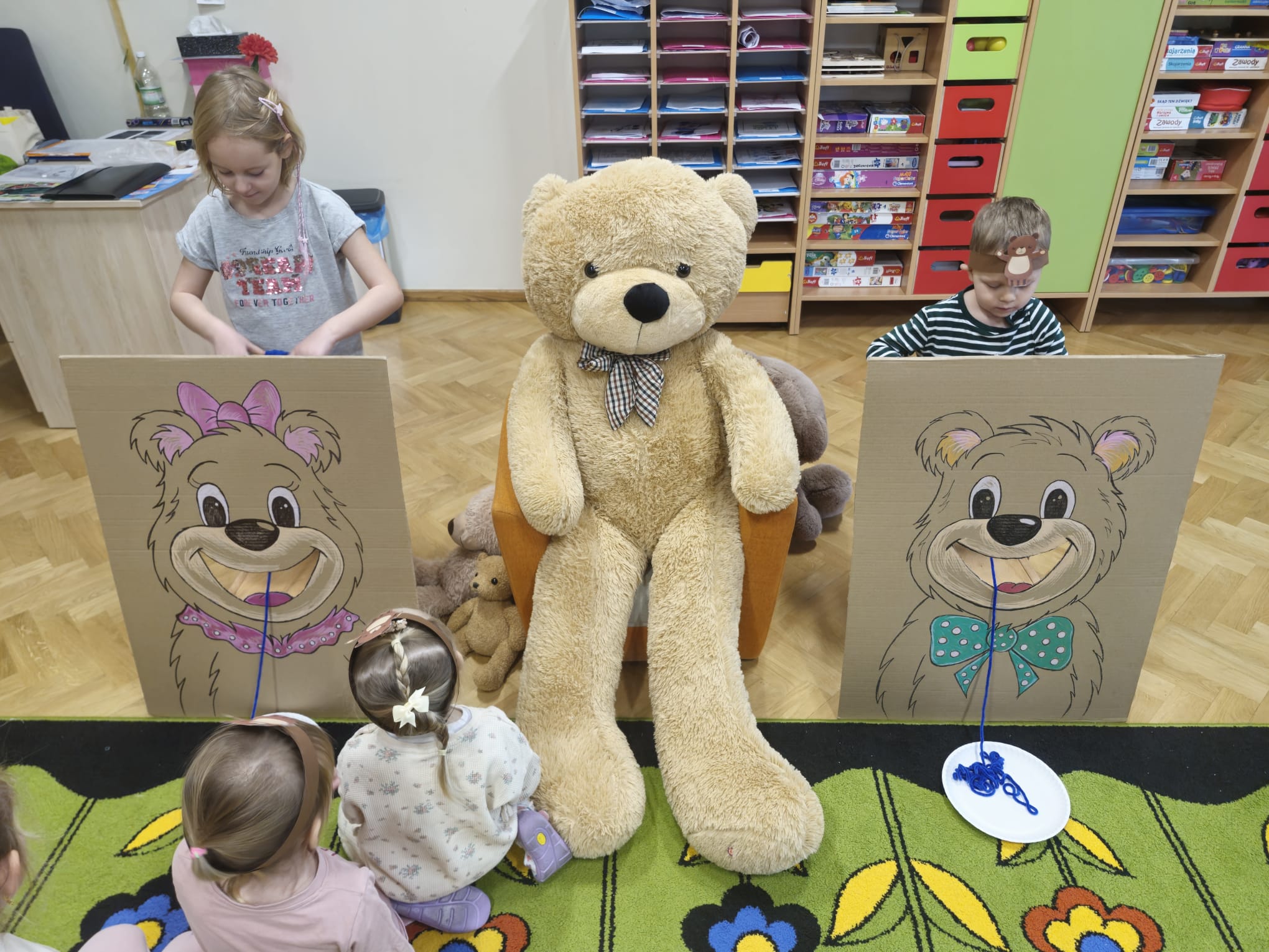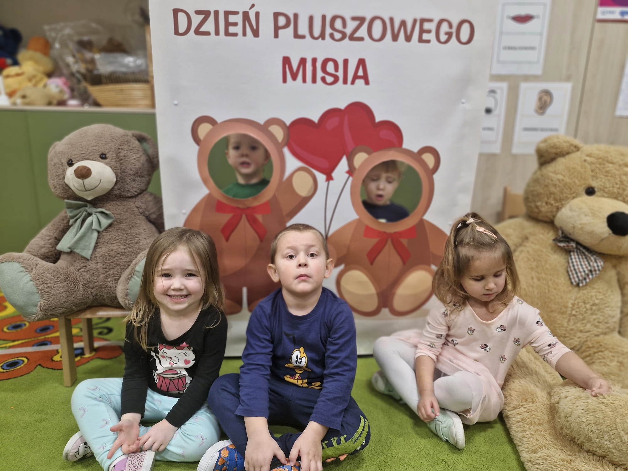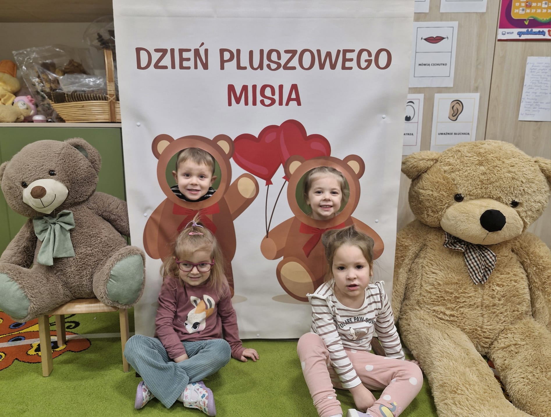 z chustą animacyjną, układanie puzzli, zagadki o misiach oraz wspólne „karmienie” misia włóczkowym spaghetti. W czasie urodzinowej imprezy dzieci wykonały portrety swoich ulubionych bajkowych misiów. Był to wyjątkowy dzień, pełen radości, śmiechu i niezapomnianych „pluszowych” wrażeń.