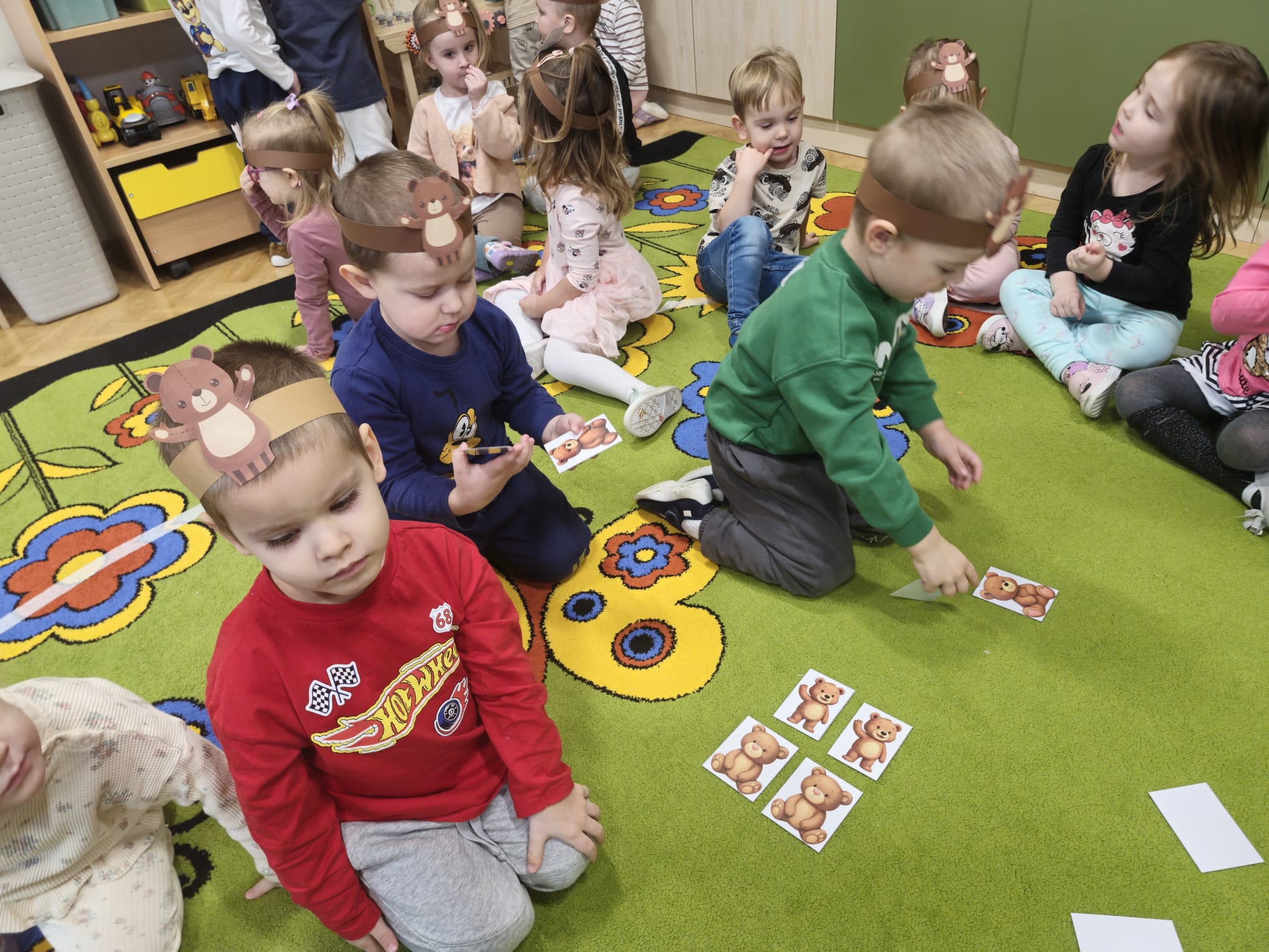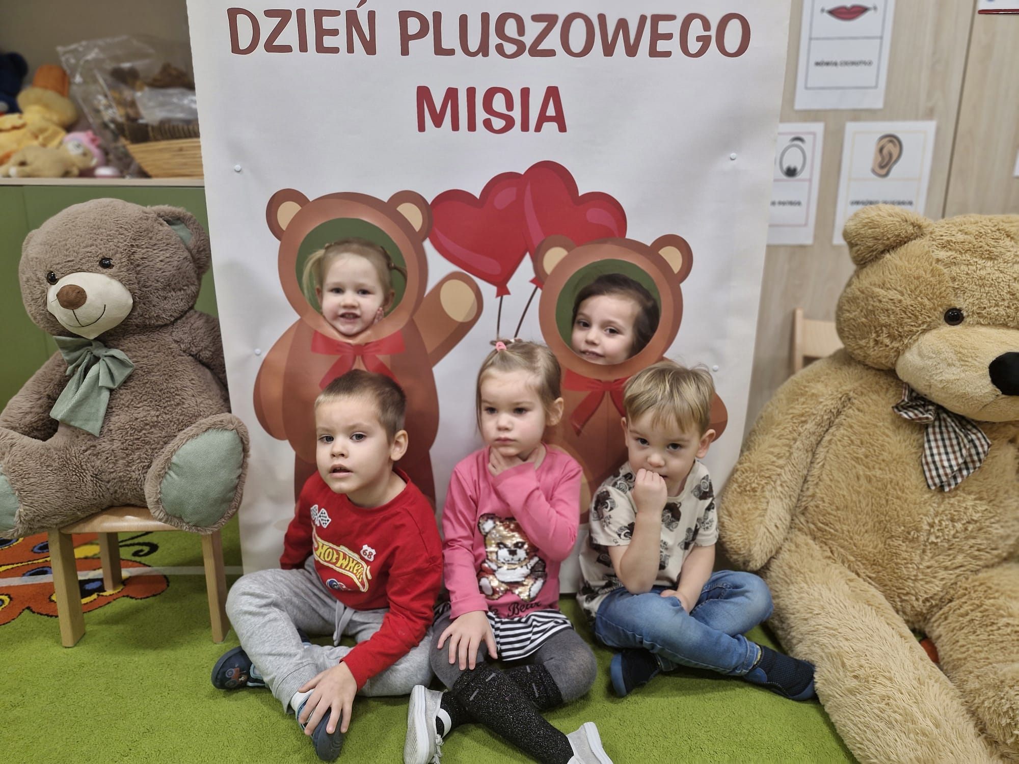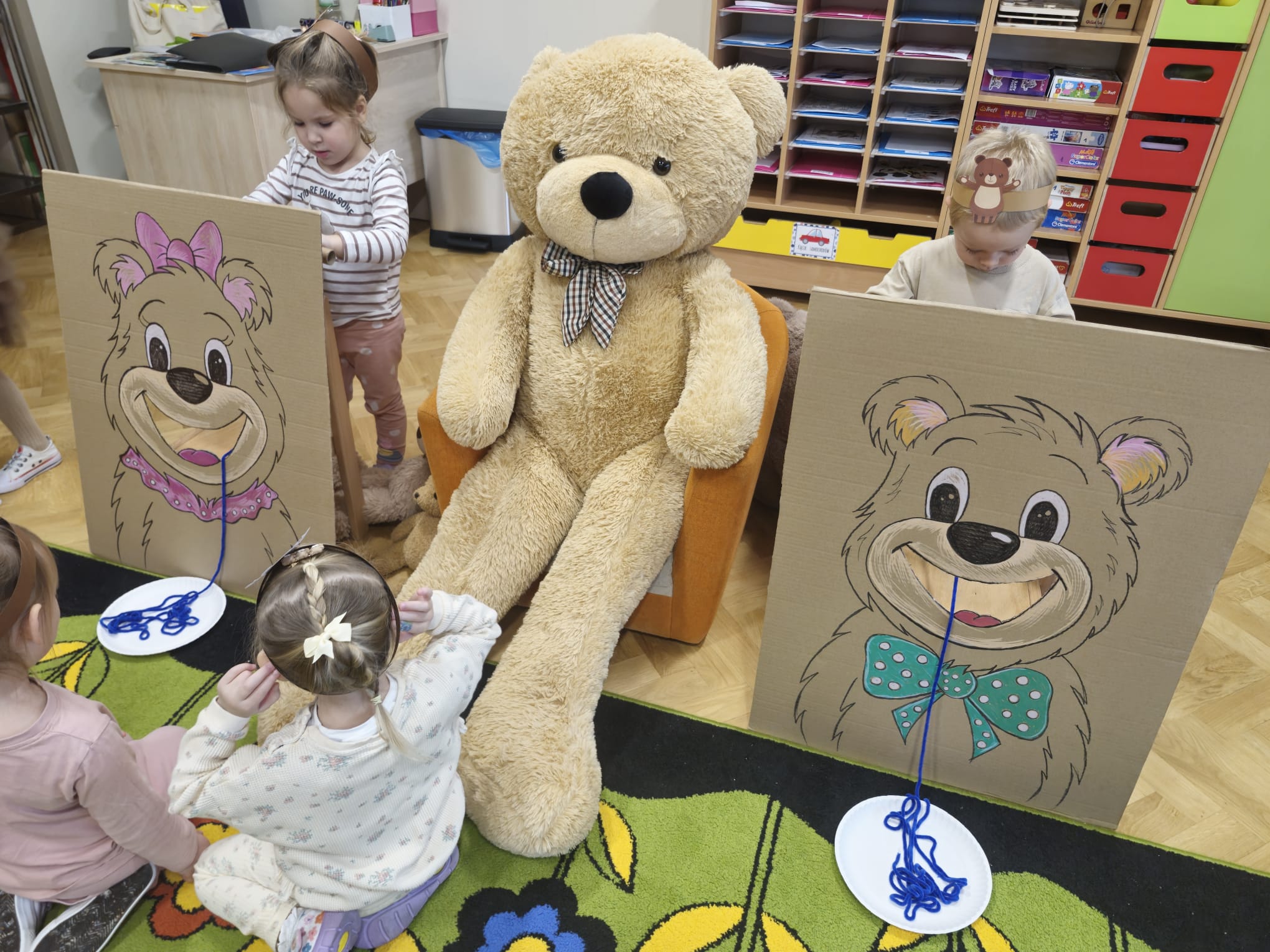 z chustą animacyjną, układanie puzzli, zagadki o misiach oraz wspólne „karmienie” misia włóczkowym spaghetti. W czasie urodzinowej imprezy dzieci wykonały portrety swoich ulubionych bajkowych misiów. Był to wyjątkowy dzień, pełen radości, śmiechu i niezapomnianych „pluszowych” wrażeń.
