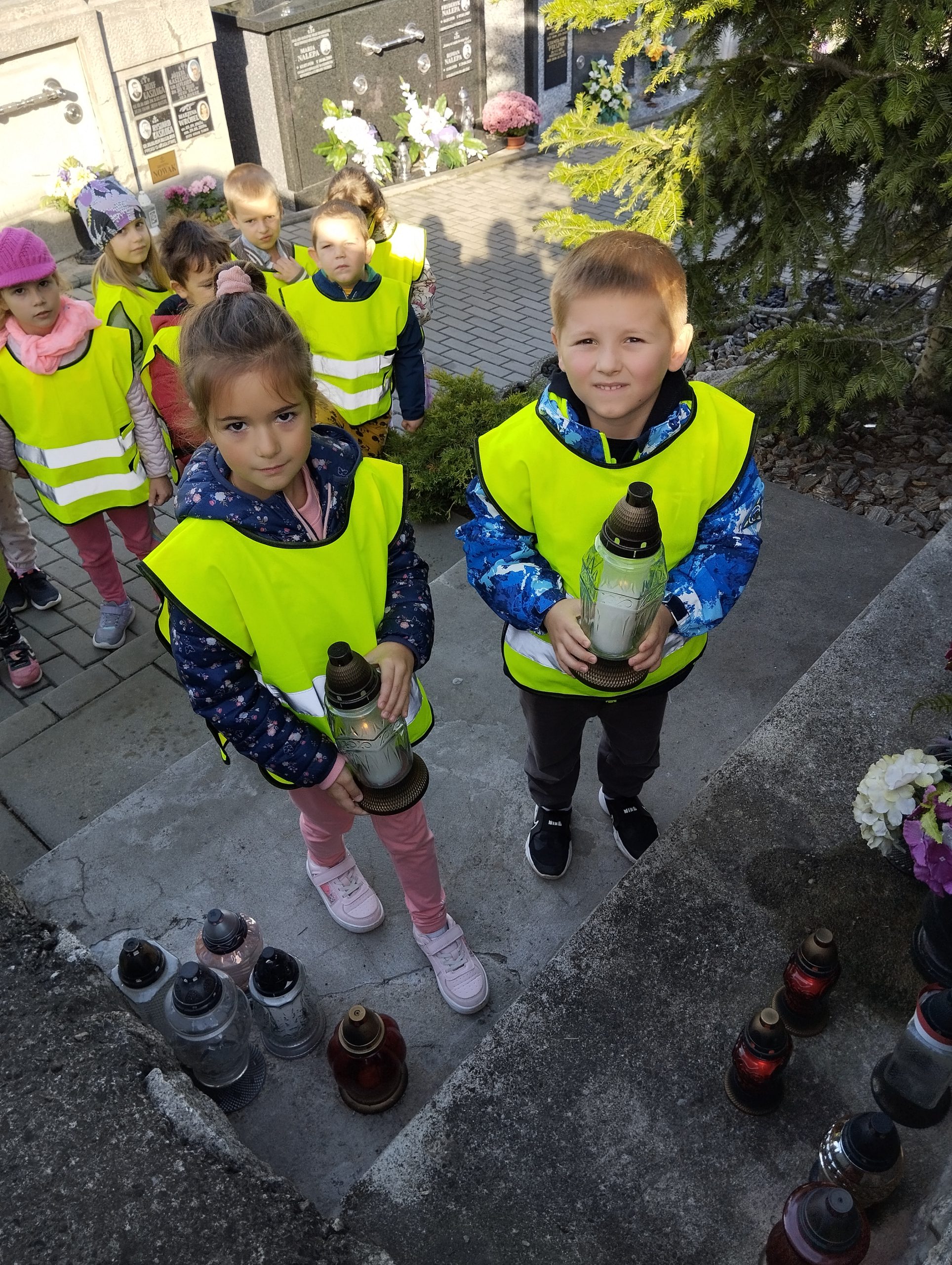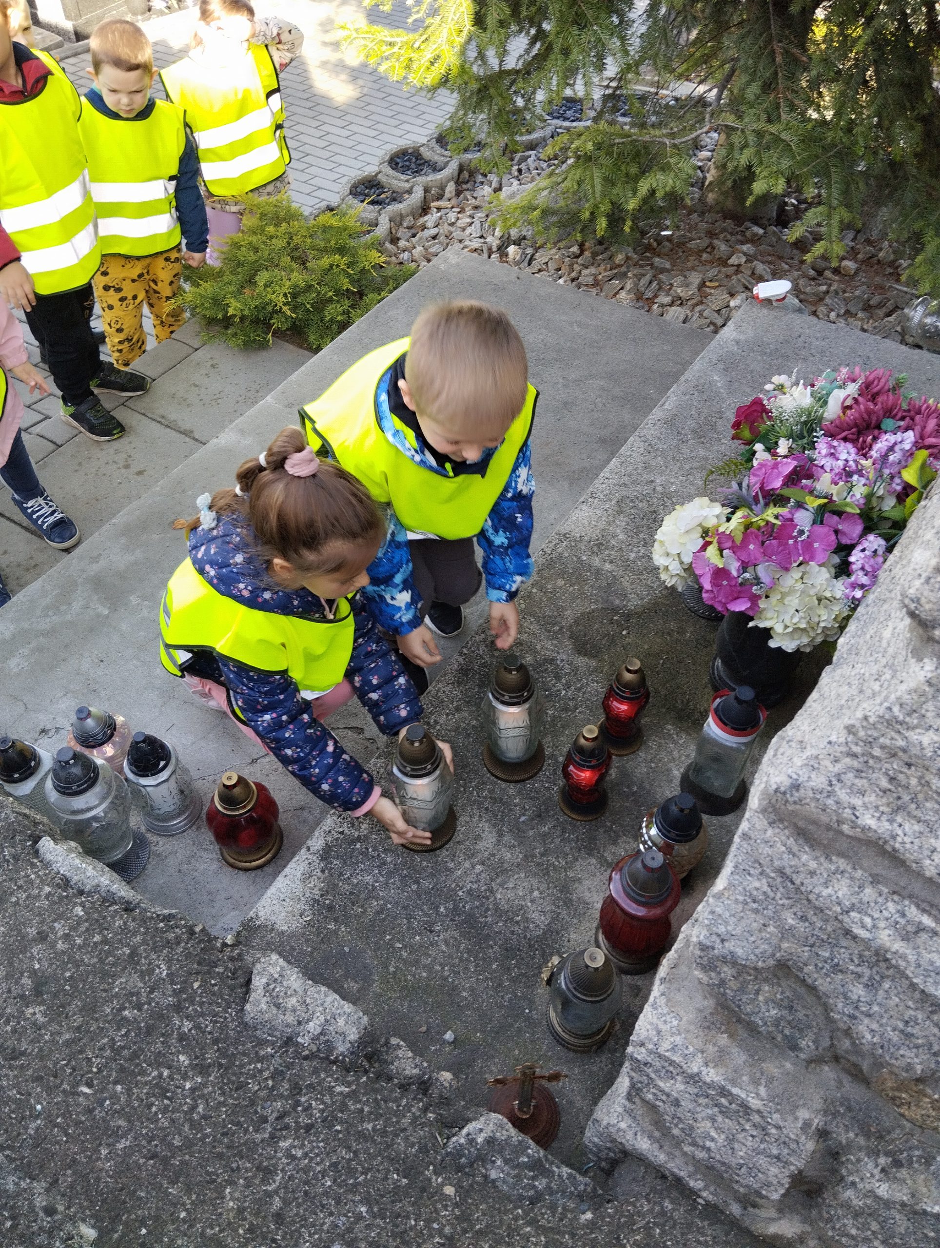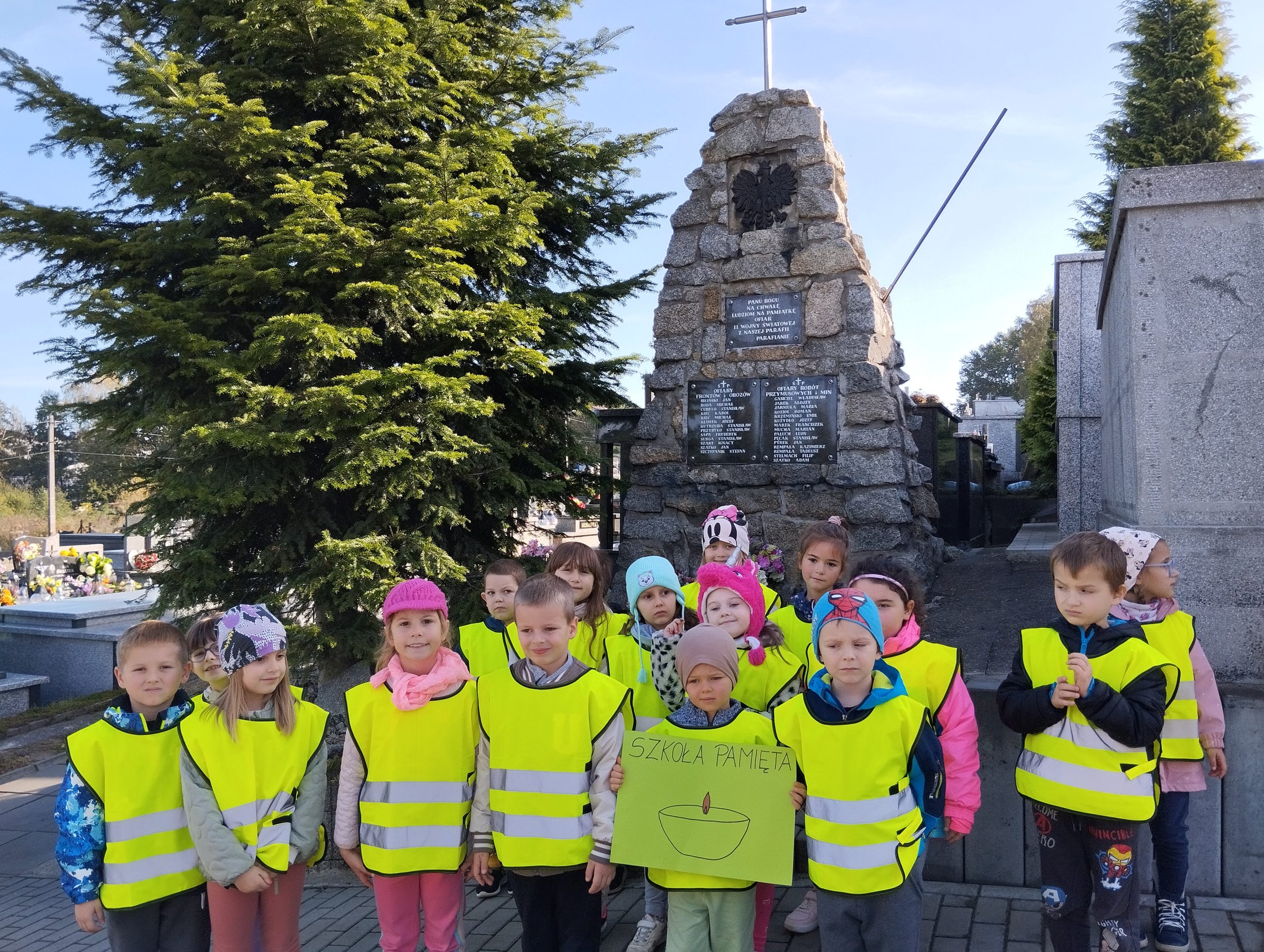 Dzieci z naszej grupy wzięły udział w akcji „Szkoła pamięta” ogłoszonej przez Ministra Edukacji Narodowej. Akcja odbyła się przed Uroczystością Wszystkich Świętych i Dniem Zadusznym, kiedy w szczególny sposób pamiętamy o zmarłych. Dzieci odwiedziły Grób Nieznanego Żołnierza na cmentarzu parafialnym oraz zapaliły znicze. Akcja miała na celu uwrażliwić na potrzebę pielęgnowania pamięci o bohaterach naszej wolności oraz o ważnych osobach. Dzieci poprzez te działania poznawały historię związaną z odwiedzanym miejscem oraz osoby, które zapisały się w historii . Podczas spaceru usłyszały jak należy się zachować w trakcie pobytu na cmentarzu i w jaki sposób należy obchodzić Dzień Wszystkich Zmarłych.