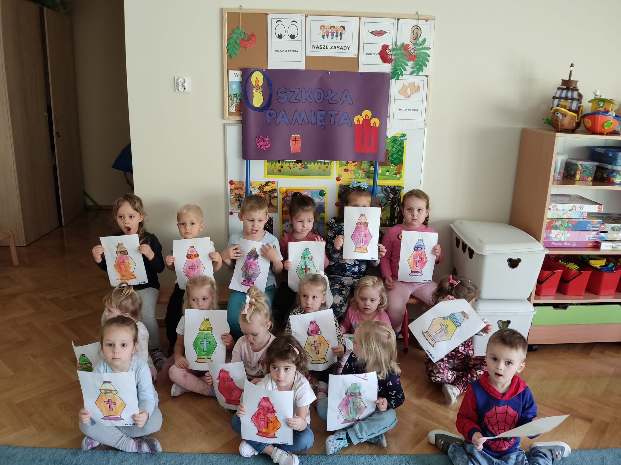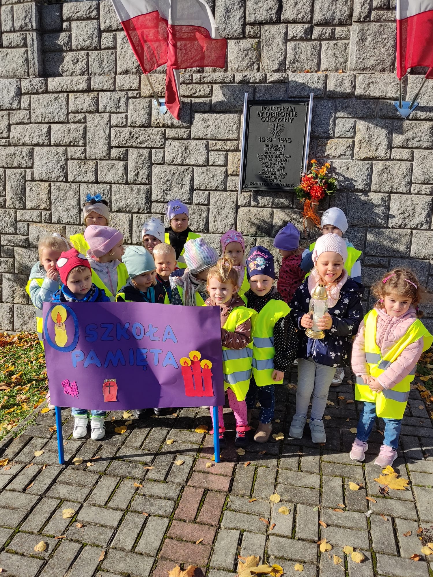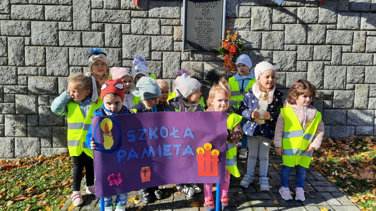 Dzieci z grupy II wzięły udział w akcji „Szkoła pamięta” ogłoszonej przez Ministra Edukacji i Nauki. Akcja odbywa się w październiku przed Uroczystością Wszystkich Świętych i Dniem Zadusznym, kiedy w szczególny sposób pamiętamy o zmarłych.