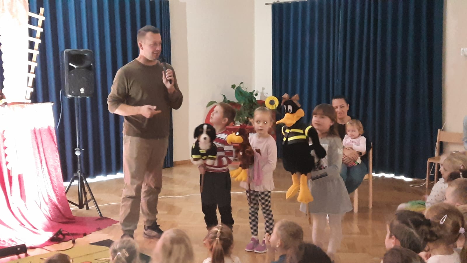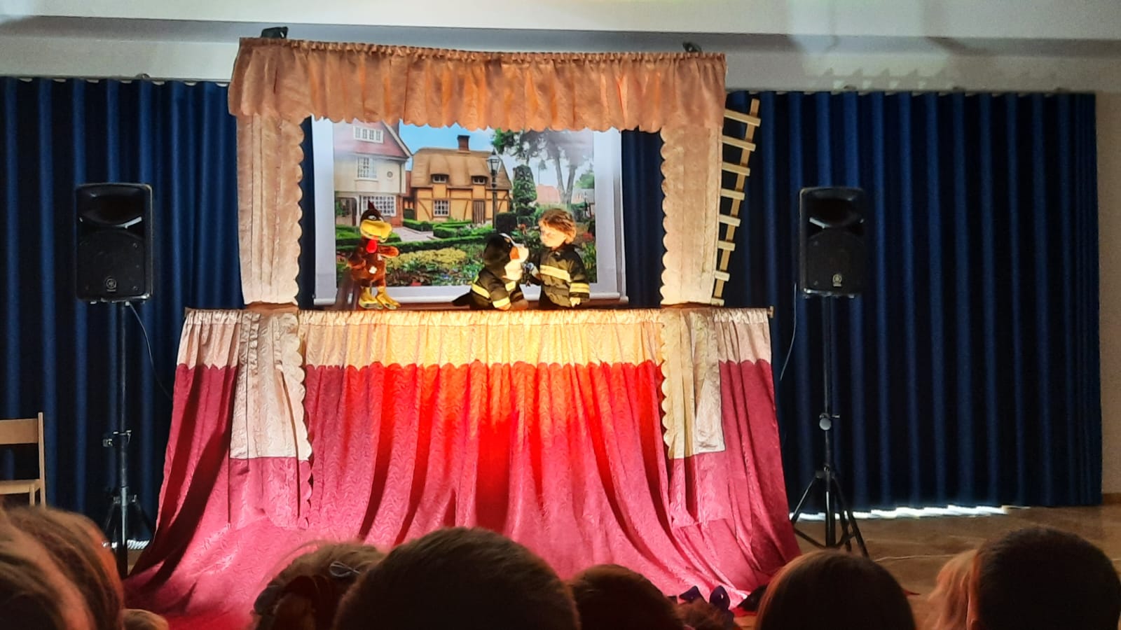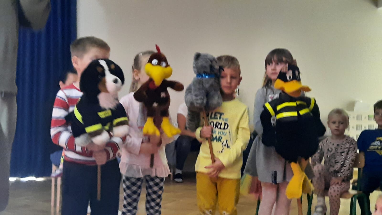 20 października 2023 r. w naszym przedszkolu gościliśmy Teatr Lalek ART CINEMA z Nowego Sącza ze spektaklem „O Maciusiu Strażaku”. Była to bajka profilaktyczna o tym, jak zachować się w obliczu zagrożenia. Główny bohater – Maciuś chciał zostać strażakiem. Aby spełnić swe marzenia otrzymał od Pana Naczelnika strażacki topór, mundur, pas i kask oraz musiał poszukać dzielnych ochotników. Wesoła drużyna Maćka w składzie: kot, kogut, pies i kaczka uczyła dzieci, jak obchodzić się z ogniem i wodą. Dzieci dowiedziały się, że nie wolno bawić się zapałkami, wchodzić do wody bez opieki dorosłych, utrwaliły wspólnie numery alarmowe. Po zakończeniu występu dzieci nagrodziły aktorów głośnymi brawami.