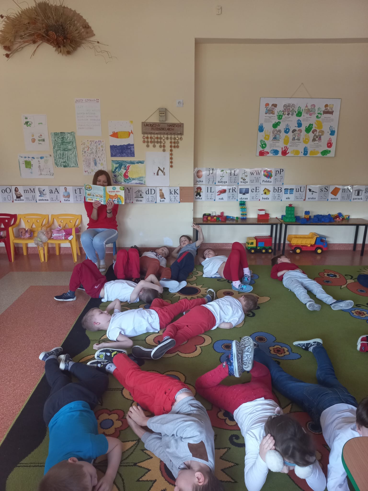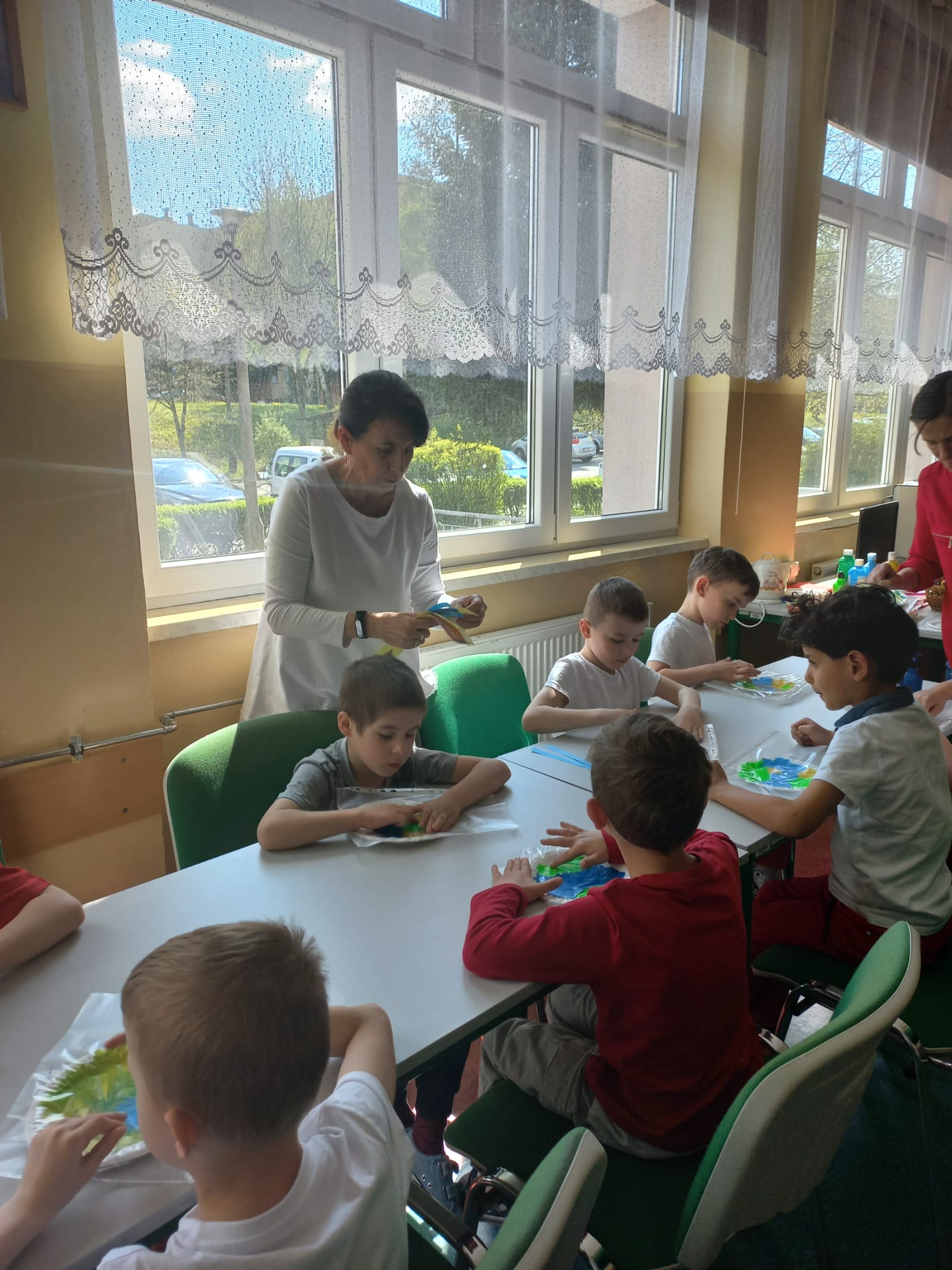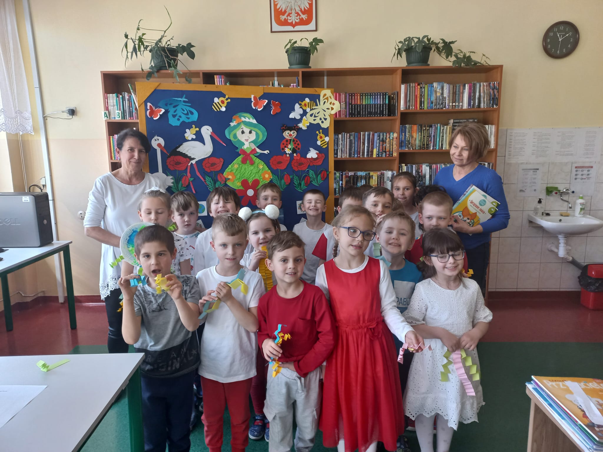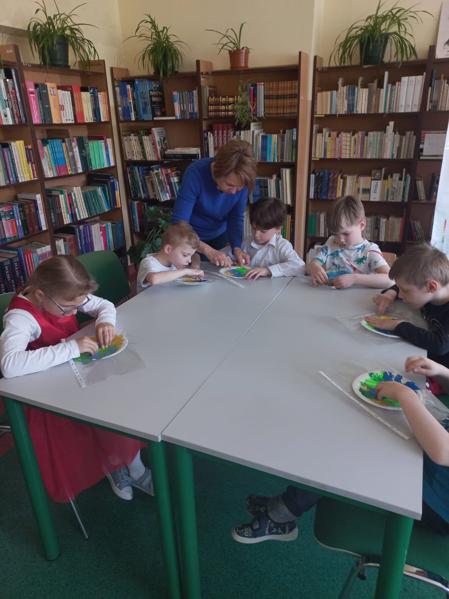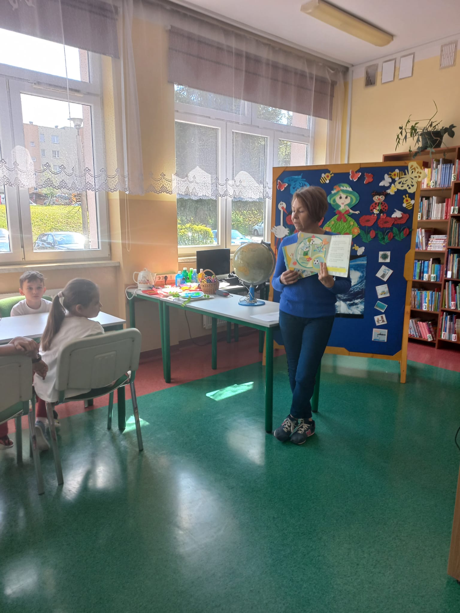 W bibliotece szkolnej dzieci wysłuchały wiersza I. Sikiryckiego ,, Sznurek Jurka”, oglądały globus i mapy świata, a także wykonały prace plastyczną ,,Szczęśliwa ziemia”.