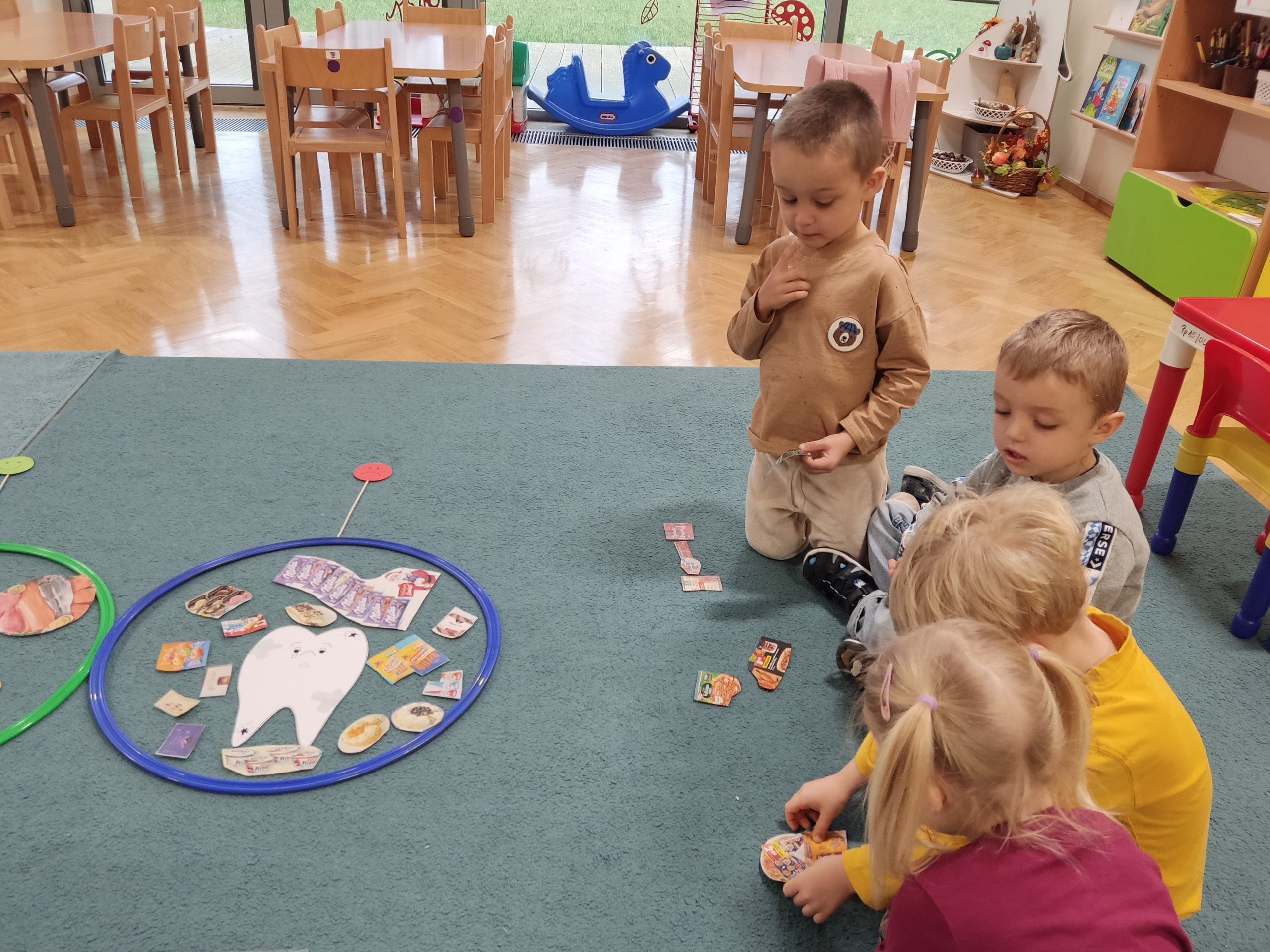 W ramach tematyki kompleksowej „Dbamy o zdrowie” dzieci poznały zawód lekarza, pielęgniarki i farmaceuty oraz niezbędne akcesoria, które są potrzebne pracownikom służby zdrowia. Podczas zabawy tematycznej wcieliły się w rolę lekarza, pielęgniarki i pacjenta. Podczas tego typu zabaw dzieci starały się przezwyciężać lęk, eliminować uprzedzenia do przykrych doświadczeń, tj.: wizyta w przychodni, szczepienia, badanie stetoskopem czy pobyt w szpitalu. Przedszkolaki utrwaliły w praktyce poprawne mycie rąk i posegregowały środki i przyrządy służące higienie całego ciała. Przypomniały sobie piramidę zdrowego żywienia i najważniejsze witaminy, które wpływają na nasze zdrowie.