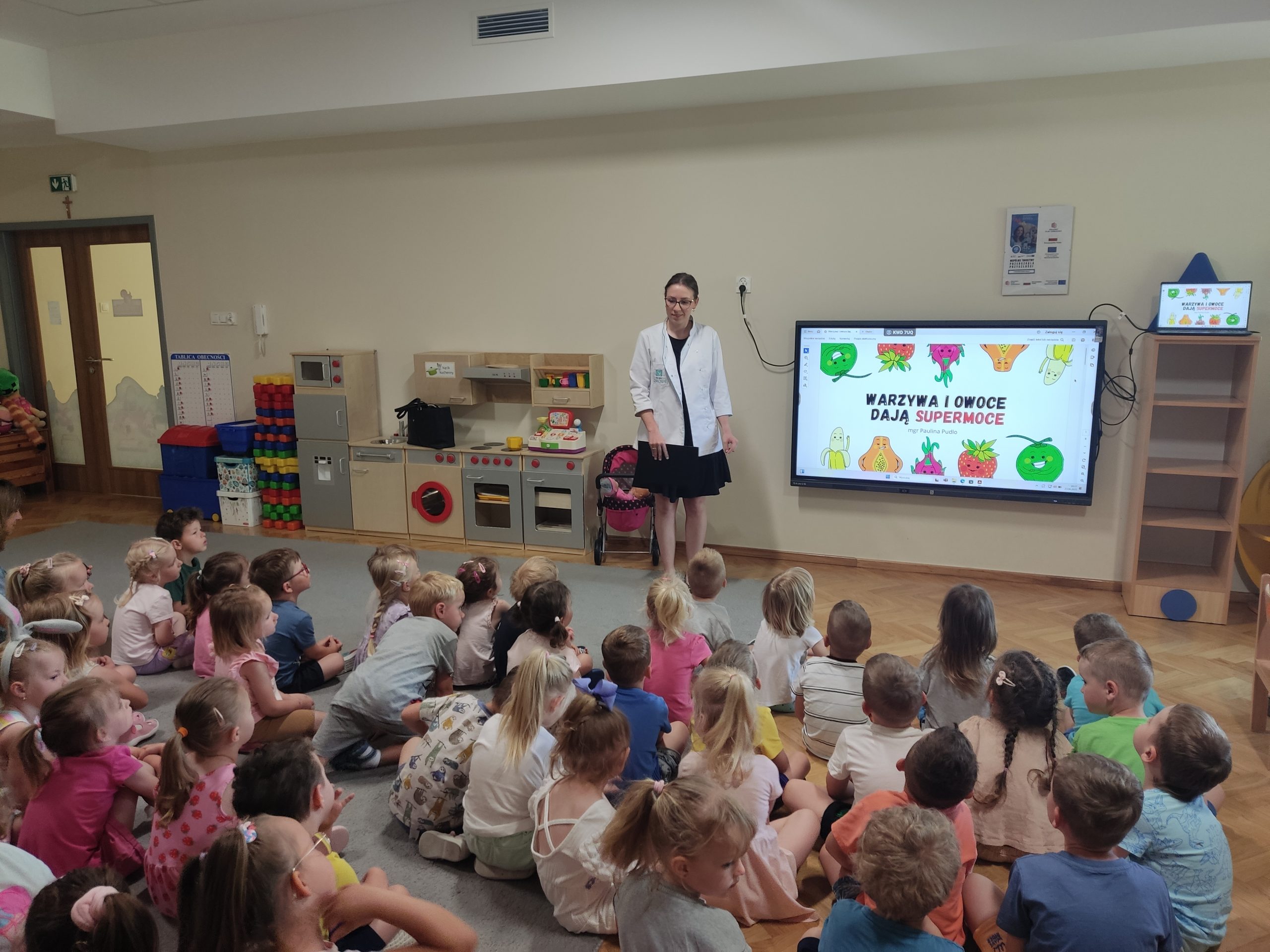 W ramach realizacji Rocznego Planu Pracy „Jestem przedszkolakiem, dbam o zdrowie – opowiem Wam, jak to robię” nasze przedszkole podejmuje wiele inicjatyw mających na celu poszerzenie wiedzy dzieci na temat zdrowego stylu życia oraz wyrabiania prozdrowotnych nawyków. Z takim oto przesłaniem odbyła się prelekcja prowadzona przez naszego gościa – Panią Paulinę Pudlo z Centrum Dietetycznego „Projekt Zdrowie” – pod hasłem „Jedz warzywa, jedz owoce, zyskasz wtedy supermoce”. Dietetyk przekonywała, jak ważną rolę w naszej diecie odgrywają warzywa i owoce, które powinny być składnikiem każdego posiłku. Regularne spożywanie warzyw i owoców to klucz do zdrowia i dobrego samopoczucia. Warzywa i owoce to podstawa zdrowej diety. Warto je jeść w każdym posiłku i cieszyć się ich dobroczynnym działaniem!