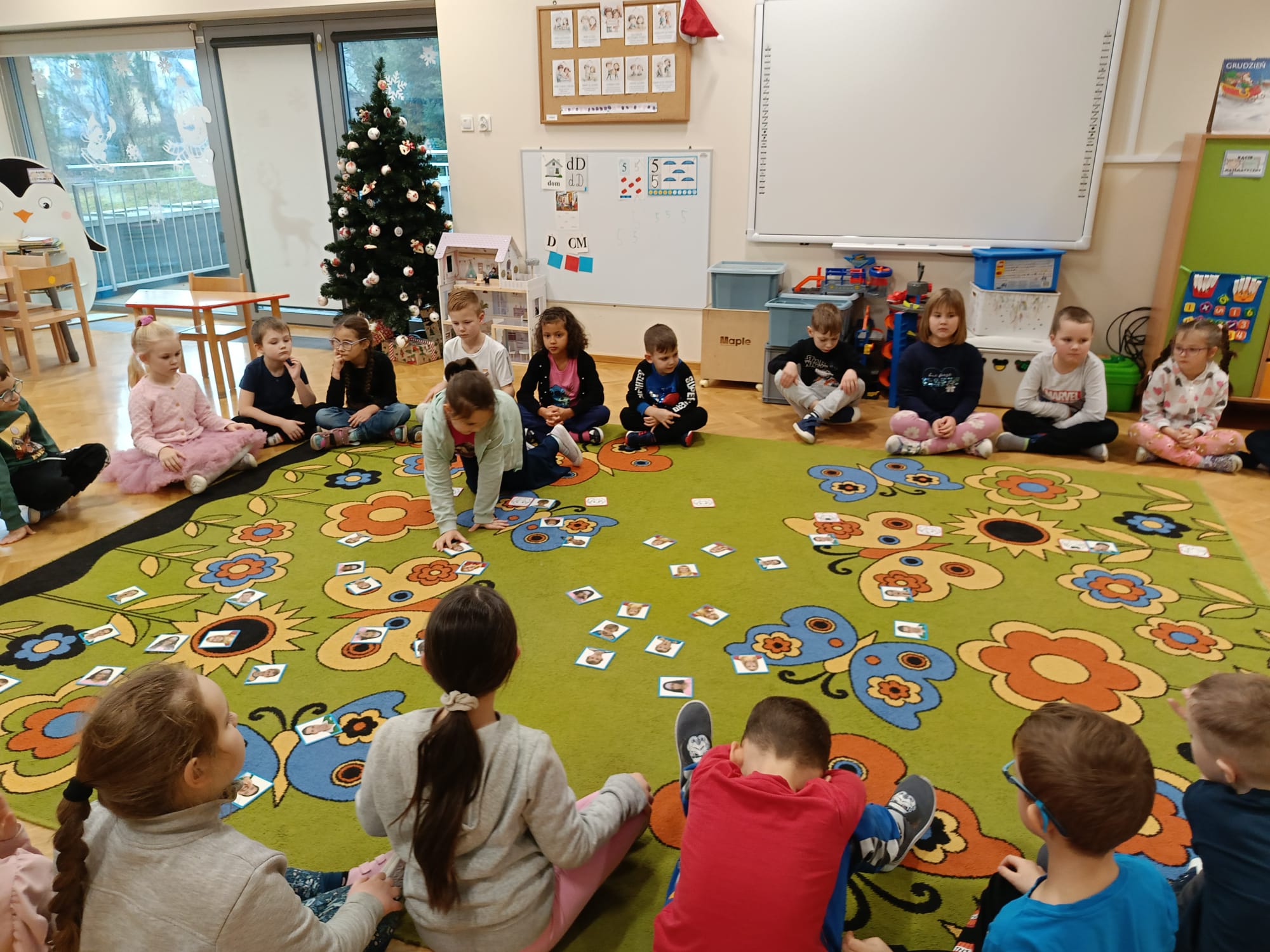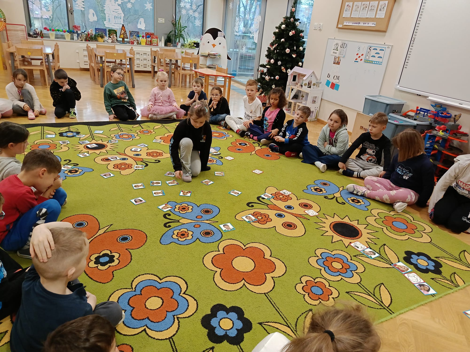 Następnie dzieci zamieniły się w bohaterów opowieści i samodzielnie dopasowywały emocje, segregując je według barw i znaczeń. Wspólna aktywność była okazją do rozwijania umiejętności rozpoznawania i nazywania uczuć.