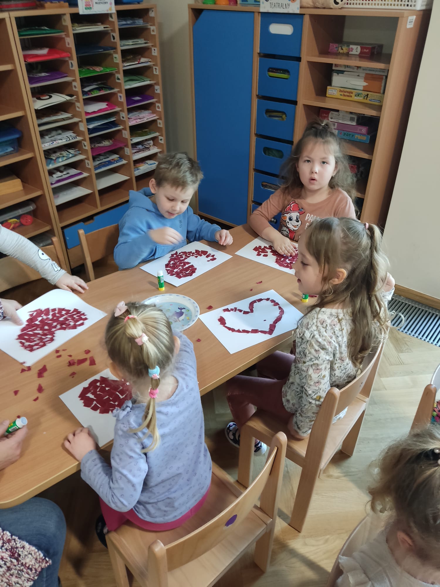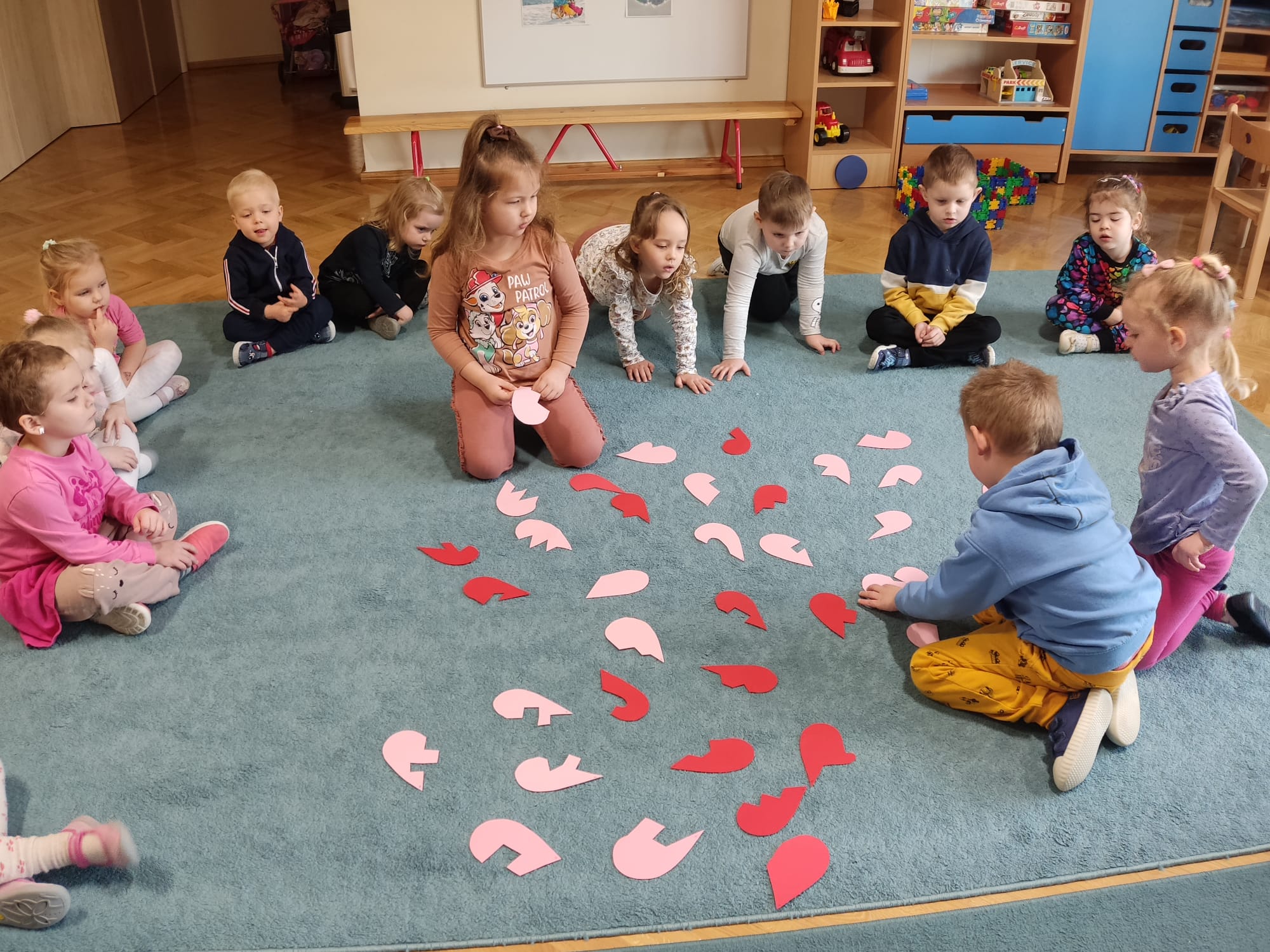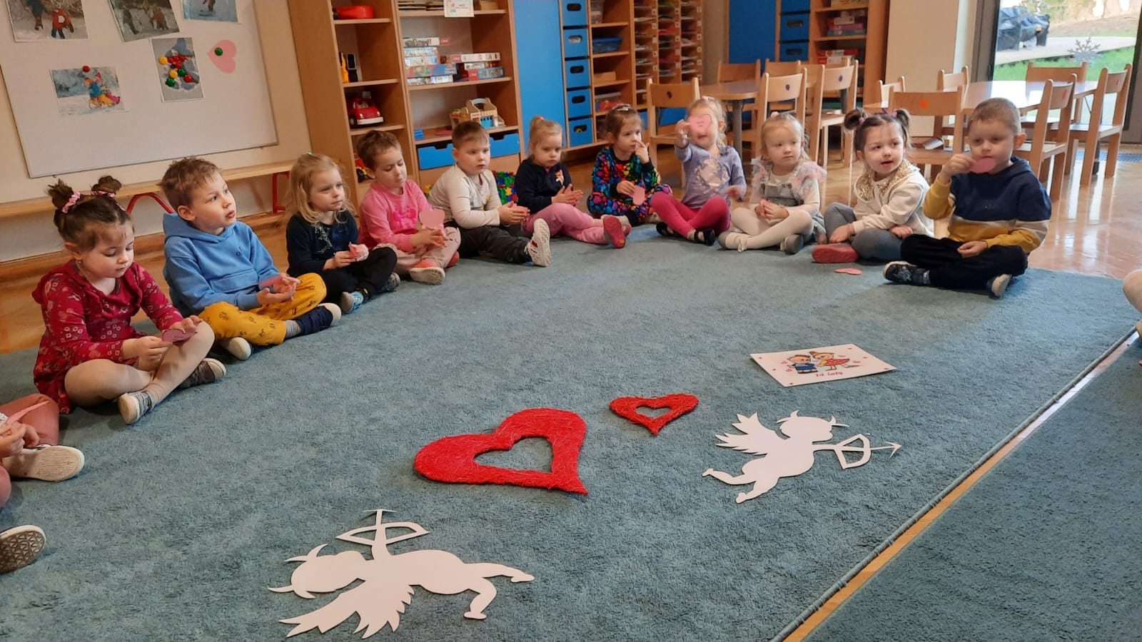 W każdej aktywności towarzyszyły nam serca, które są symbolem miłości. Walentynkowe święto w grupie „Misiów” rozpoczęło się zabawą matematyczną z serduszkami. Dzieci w dowód sympatii wręczały sobie serduszka, każdy został obdarowany – to dowód na to, że w naszej grupie wszyscy się lubią. Następnie Misie szukały takiego samego serduszka, czyli pary do tańca. Po tańcach sklejały złamane serca co nie było wcale łatwe, ale wszystko się udało! Gimnastyka z serduszkami i ćwiczenia oddechowe rozruszały całą grupę. Przedszkolaki zapoznały się również z tradycją „Walentynek”, rozmawiały o tym jak można okazywać przyjaźń i miłość bliskim osobom nie tylko od święta.