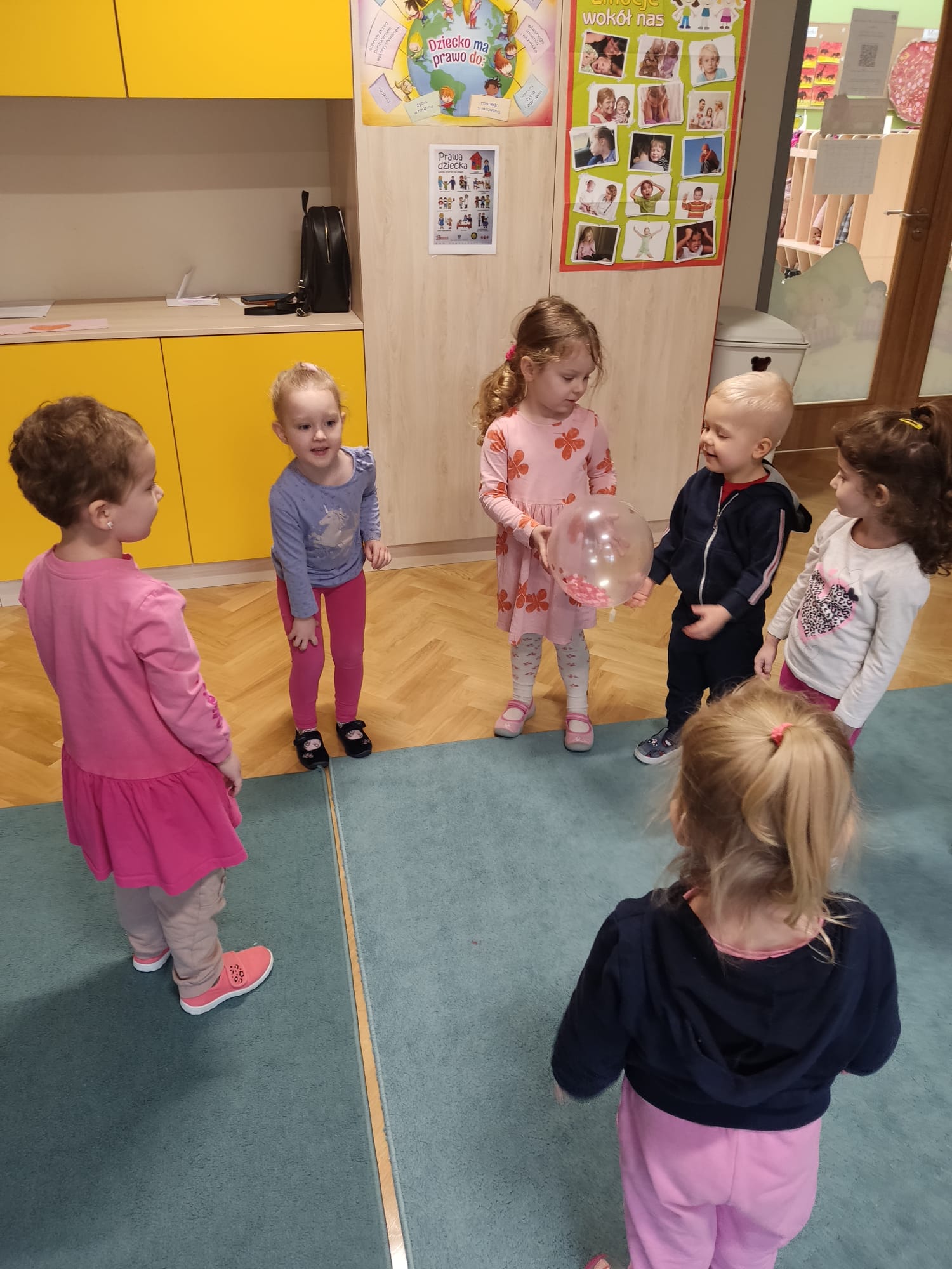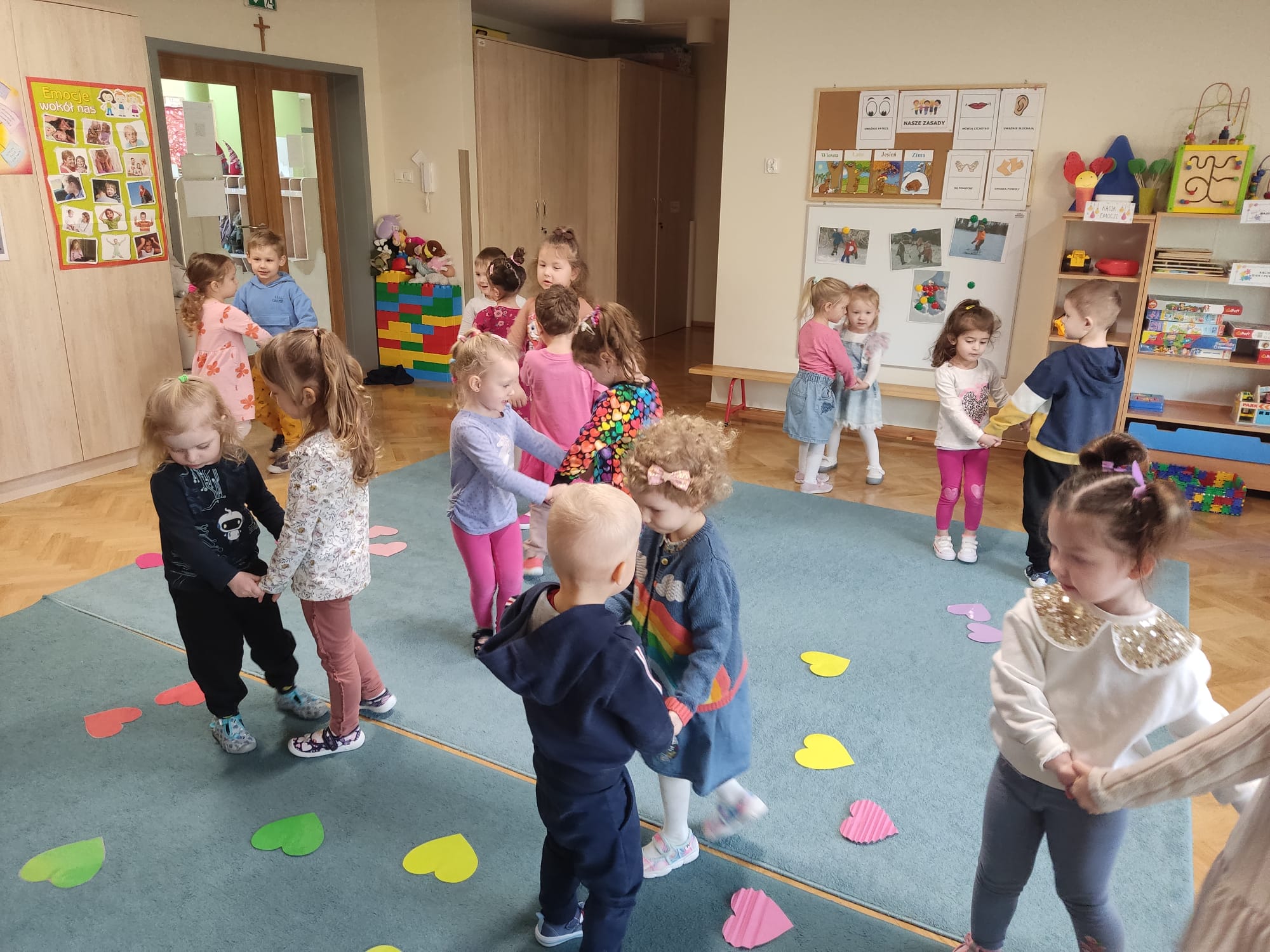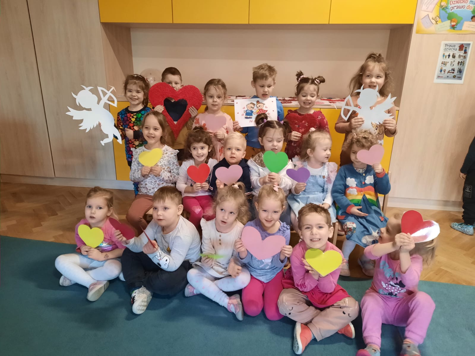 W każdej aktywności towarzyszyły nam serca, które są symbolem miłości. Walentynkowe święto w grupie „Misiów” rozpoczęło się zabawą matematyczną z serduszkami. Dzieci w dowód sympatii wręczały sobie serduszka, każdy został obdarowany – to dowód na to, że w naszej grupie wszyscy się lubią. Następnie Misie szukały takiego samego serduszka, czyli pary do tańca. Po tańcach sklejały złamane serca co nie było wcale łatwe, ale wszystko się udało! Gimnastyka z serduszkami i ćwiczenia oddechowe rozruszały całą grupę. Przedszkolaki zapoznały się również z tradycją „Walentynek”, rozmawiały o tym jak można okazywać przyjaźń i miłość bliskim osobom nie tylko od święta.