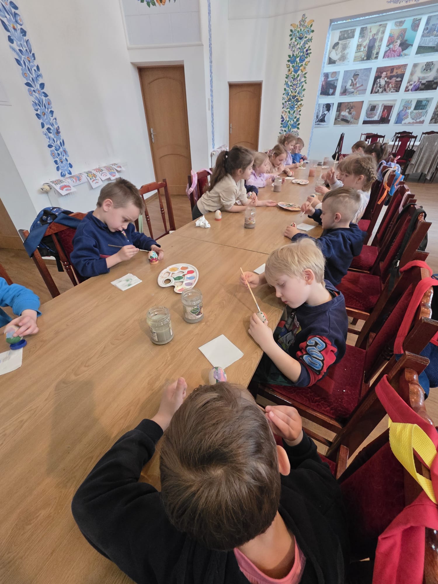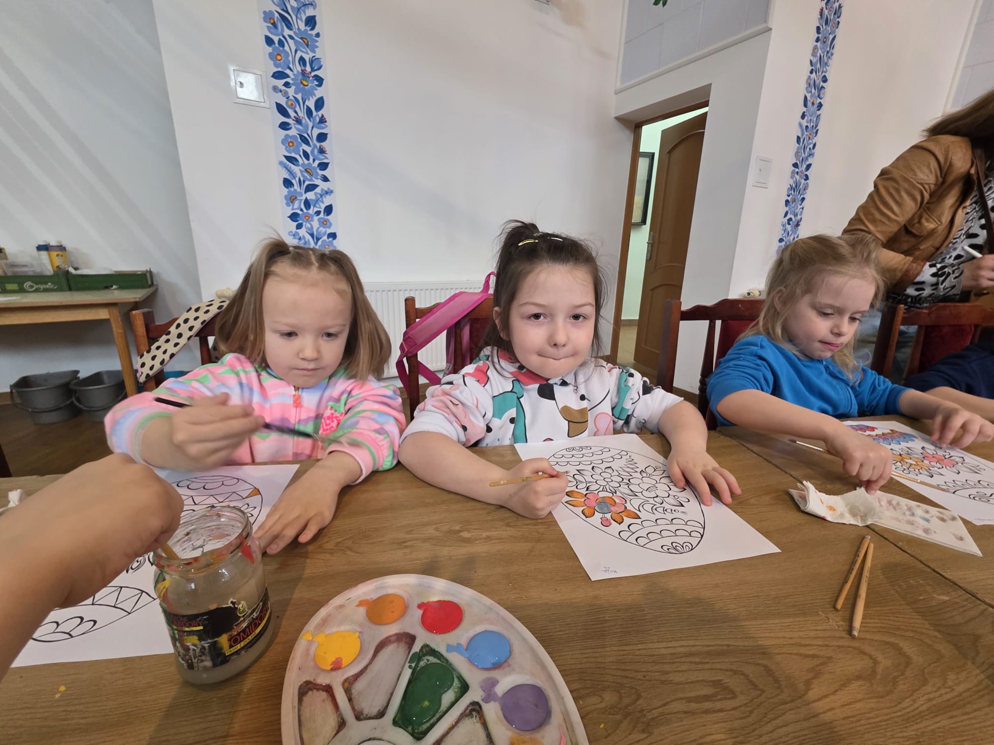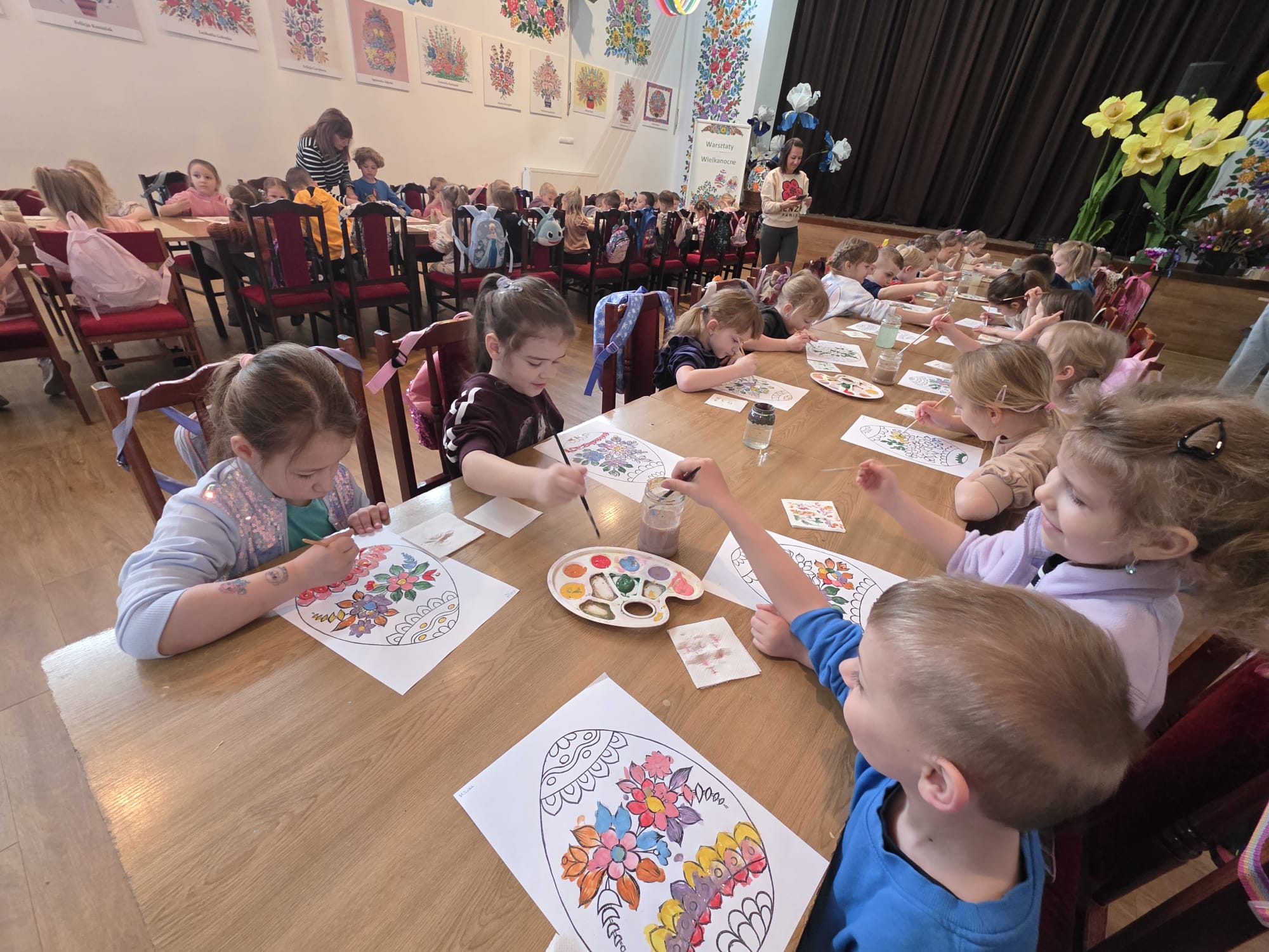 Podczas warsztatów przedszkolaki z wielkim zaangażowaniem tworzyły własne prace plastyczne. Ozdabiały pisanki, przygotowywały palmy wielkanocne oraz ćwiczyły precyzyjne malowanie kwiatowych wzorów farbami, inspirowanych kwiatowymi motywami Malowanej Wsi.