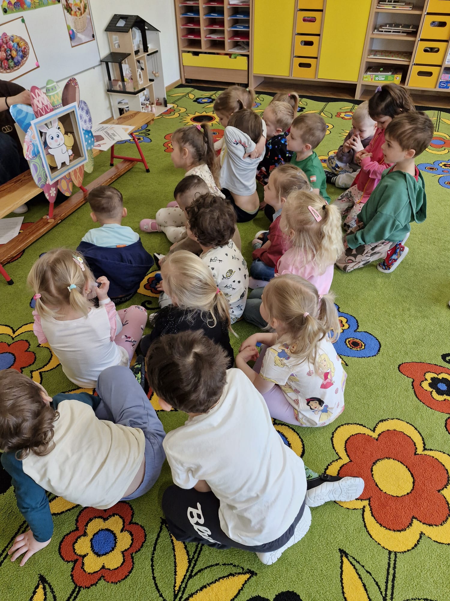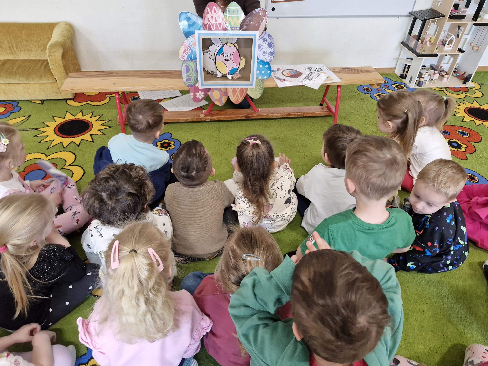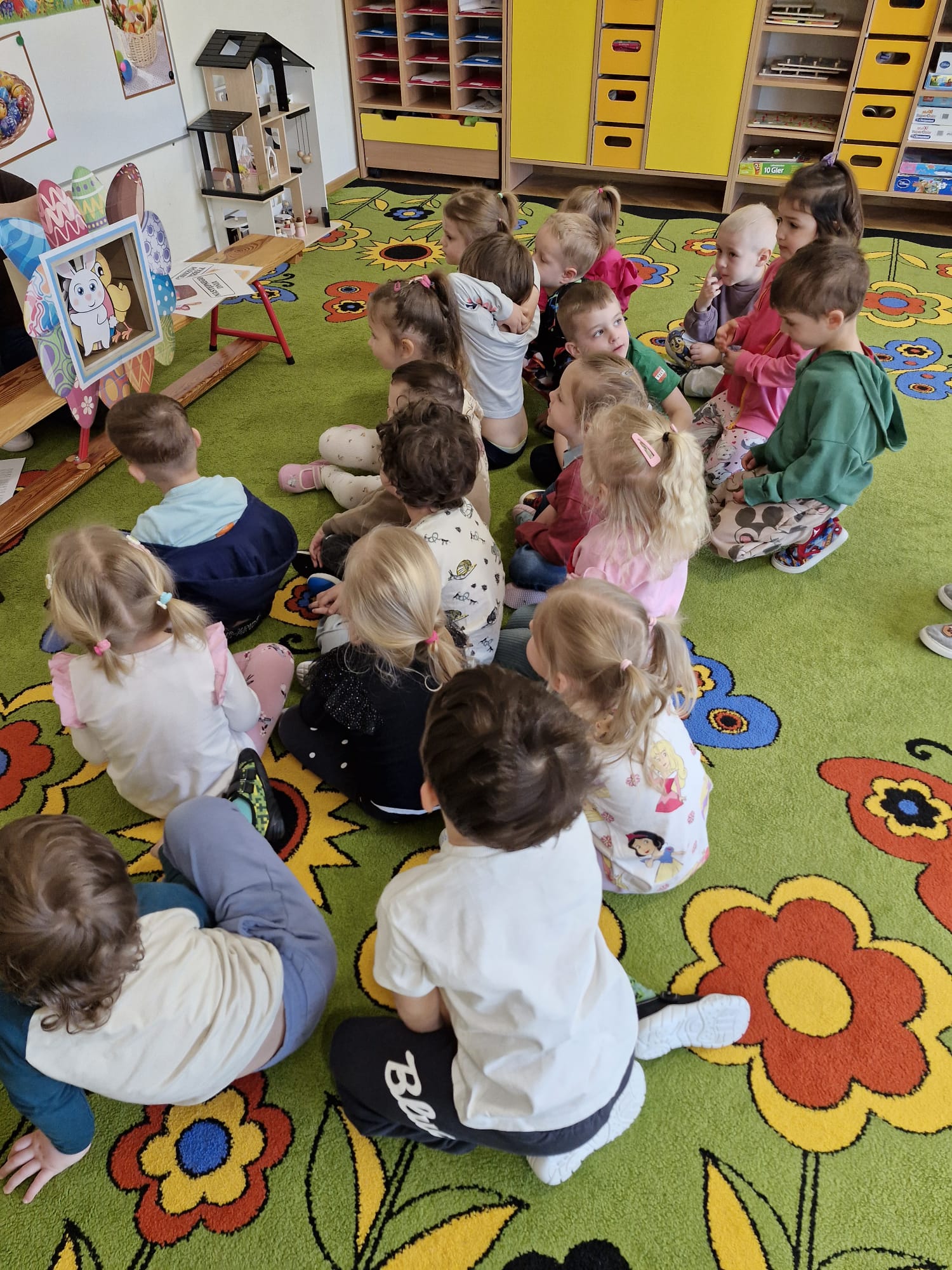 14 kwietnia w naszej grupie został przedstawiony dzieciom teatrzyk o tematyce wielkanocnej, przygotowany przez Panią. Dzieci z zainteresowaniem oglądały przedstawienie, w którym pojawiły się: wesoły kurczak, zajączek, baranek i kolorowa pisanka. Dzięki teatrzykowi przedszkolaki poznały tradycje wielkanocne oraz podpowiedział jak mogą pomóc w przygotowaniach przedświątecznych. Atmosfera była radosna, a dzieci chętnie brały udział w rozmowie po przedstawieniu.