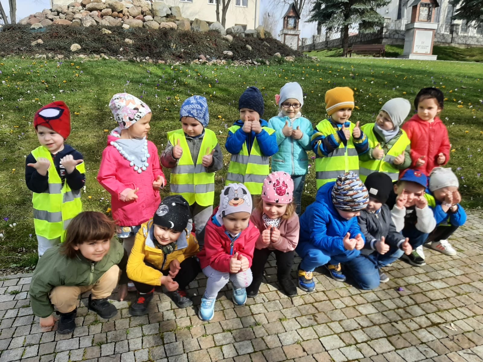 Piękną wiosenną pogodę dzieci z grupy ,,Misie” wykorzystały na spacer. Przedszkolaki bezpośrednio obcowały z przyrodą, poznawały nazwy spotkanych kwiatów drzew i roślin.