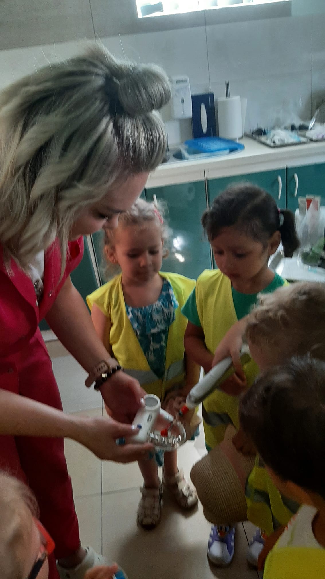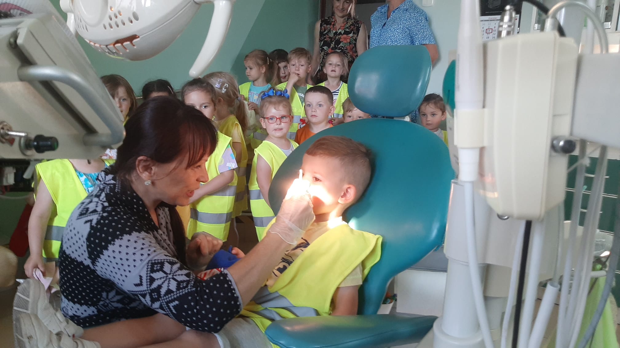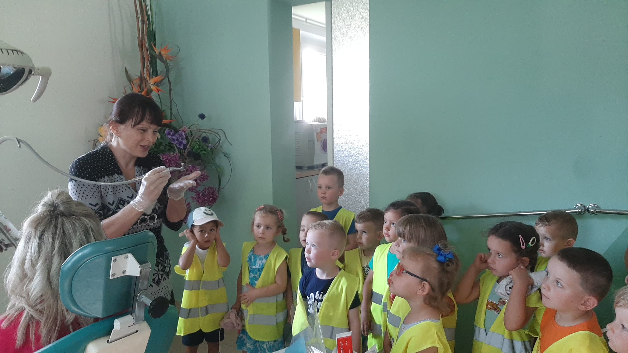 W ramach kształtowania nawyków prozdrowotnych, dnia 20 czerwca odwiedziliśmy pobliski gabinet stomatologiczny. Celem wycieczki było uświadomienie dzieciom konieczności dbania o zęby oraz dbania o higienę jamy ustnej jak również przestrzegania zdrowej diety. Pani lek. dent. Anna Mleczko przyjęła nas bardzo serdecznie. Zapoznała dzieci z wyposażeniem gabinetu stomatologicznego, wyjaśniła jak się leczy zęby, pokazała dzieciom działanie sprzętu medycznego. Następnie, pani pielęgniarka przeprowadziła pogadankę na temat prawidłowego mycia zębów na zestawie tzw. „dużej szczęki”. Każde z dziecka mogło spróbować poprawnie je wyszczotkować.