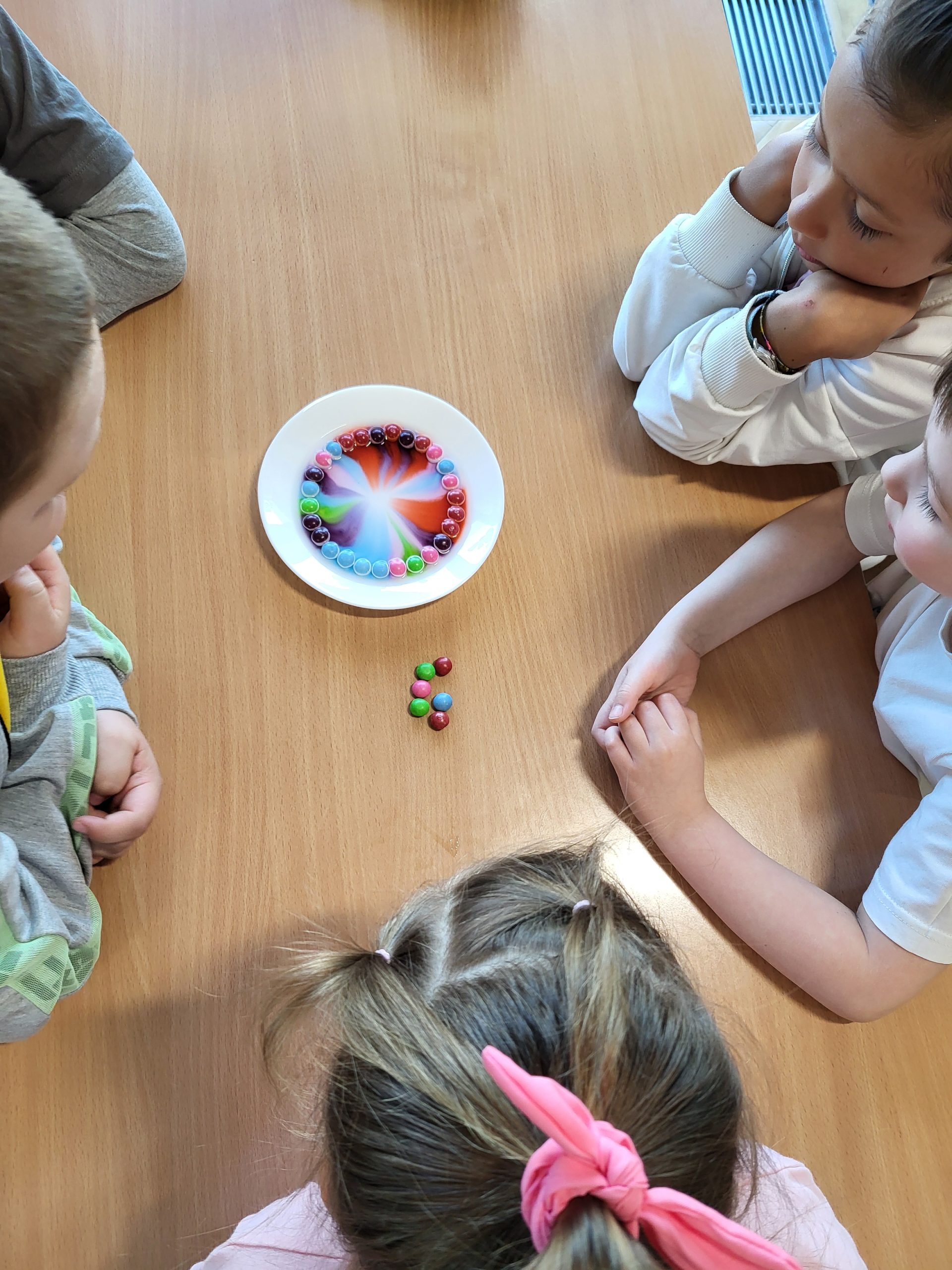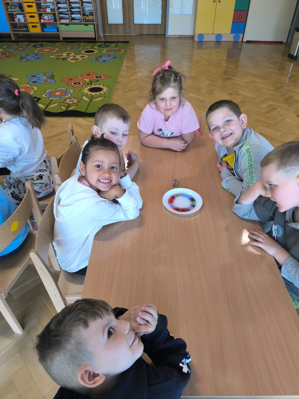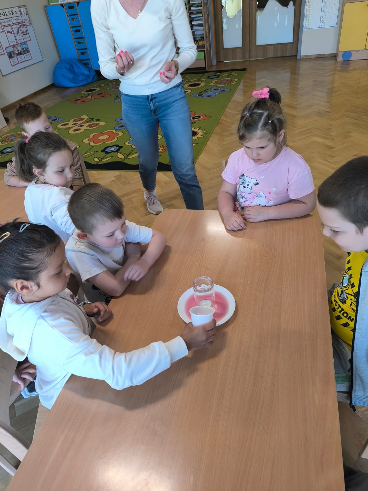 W dniu 28 kwietnia dzieci z naszej grupy w ramach Ogólnopolskiego Projektu Edukacyjnego „Gramy zmysłami” brały udział w eksperymentach przy użyciu wody. Pierwszy eksperyment wykonano z zastosowaniem wody i cynamonu – po włożeniu palca do wody z cynamonem, palec pozostawał suchy. Następny eksperyment to przykrycie szklanką zapalonego tealighta (podgrzewacza) na płaskim talerzyku i wlanie wody z barwnikiem – woda została wciągnięta do szklanki. Kolejny, to polanie wodą ułożonych na płaskim talerzyku skittlesów, które w efekcie spowodowały piękną, kolorową tęczę. Ostatni eksperyment polegał na wypełnieniu wodą szklanki, nakryciu ją kartką papieru i zmianie jej położenia tj. dnem do góry – woda nie wylała się. Przedszkolaki z wielkim zaciekawieniem przyglądały się i brały udział w tych niecodziennych i zadziwiających zajęciach. Eksperymenty te były okazją do wprowadzenia dzieci w fascynujący świat nauki, wspaniale się przy tym bawiąc z zachowaniem wszelkich zasad bezpieczeństwa.