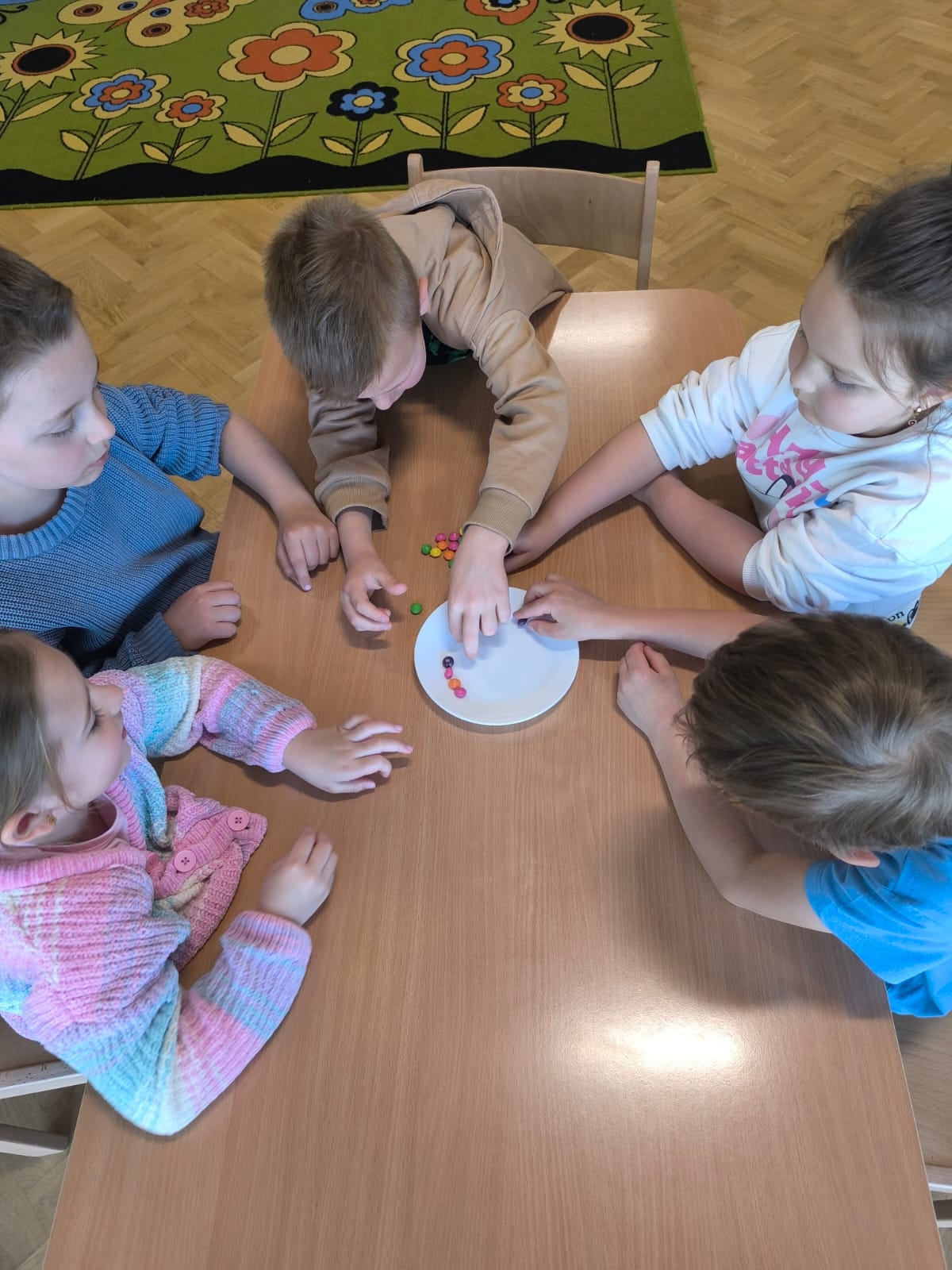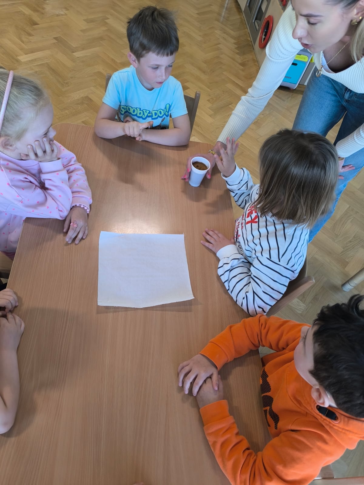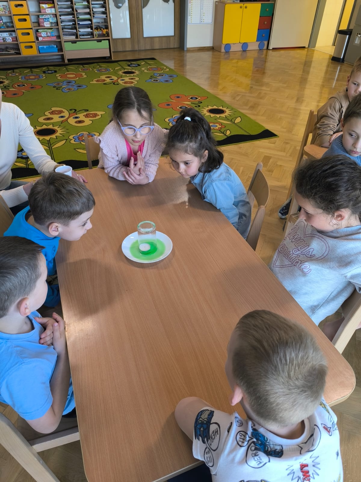 W dniu 28 kwietnia dzieci z naszej grupy w ramach Ogólnopolskiego Projektu Edukacyjnego „Gramy zmysłami” brały udział w eksperymentach przy użyciu wody. Pierwszy eksperyment wykonano z zastosowaniem wody i cynamonu – po włożeniu palca do wody z cynamonem, palec pozostawał suchy. Następny eksperyment to przykrycie szklanką zapalonego tealighta (podgrzewacza) na płaskim talerzyku i wlanie wody z barwnikiem – woda została wciągnięta do szklanki. Kolejny, to polanie wodą ułożonych na płaskim talerzyku skittlesów, które w efekcie spowodowały piękną, kolorową tęczę. Ostatni eksperyment polegał na wypełnieniu wodą szklanki, nakryciu ją kartką papieru i zmianie jej położenia tj. dnem do góry – woda nie wylała się. Przedszkolaki z wielkim zaciekawieniem przyglądały się i brały udział w tych niecodziennych i zadziwiających zajęciach. Eksperymenty te były okazją do wprowadzenia dzieci w fascynujący świat nauki, wspaniale się przy tym bawiąc z zachowaniem wszelkich zasad bezpieczeństwa.