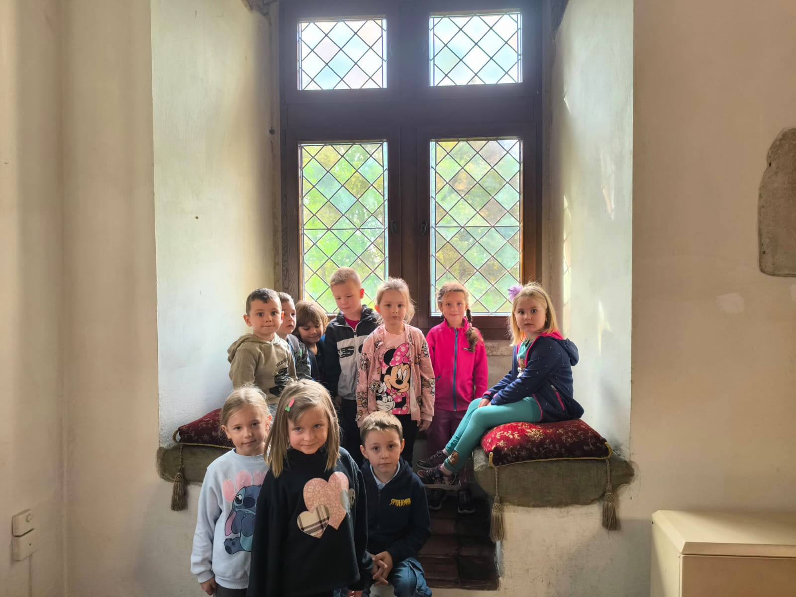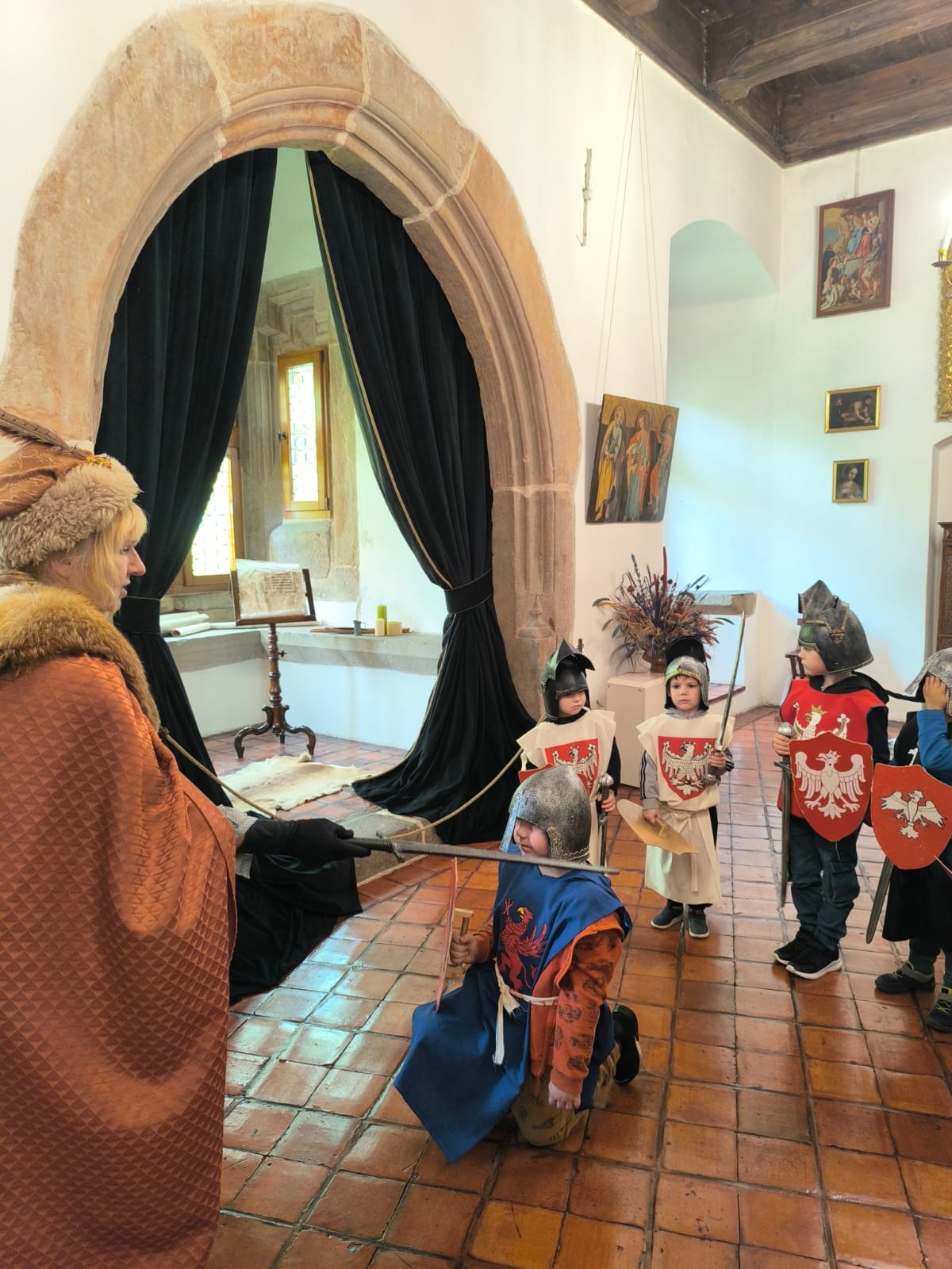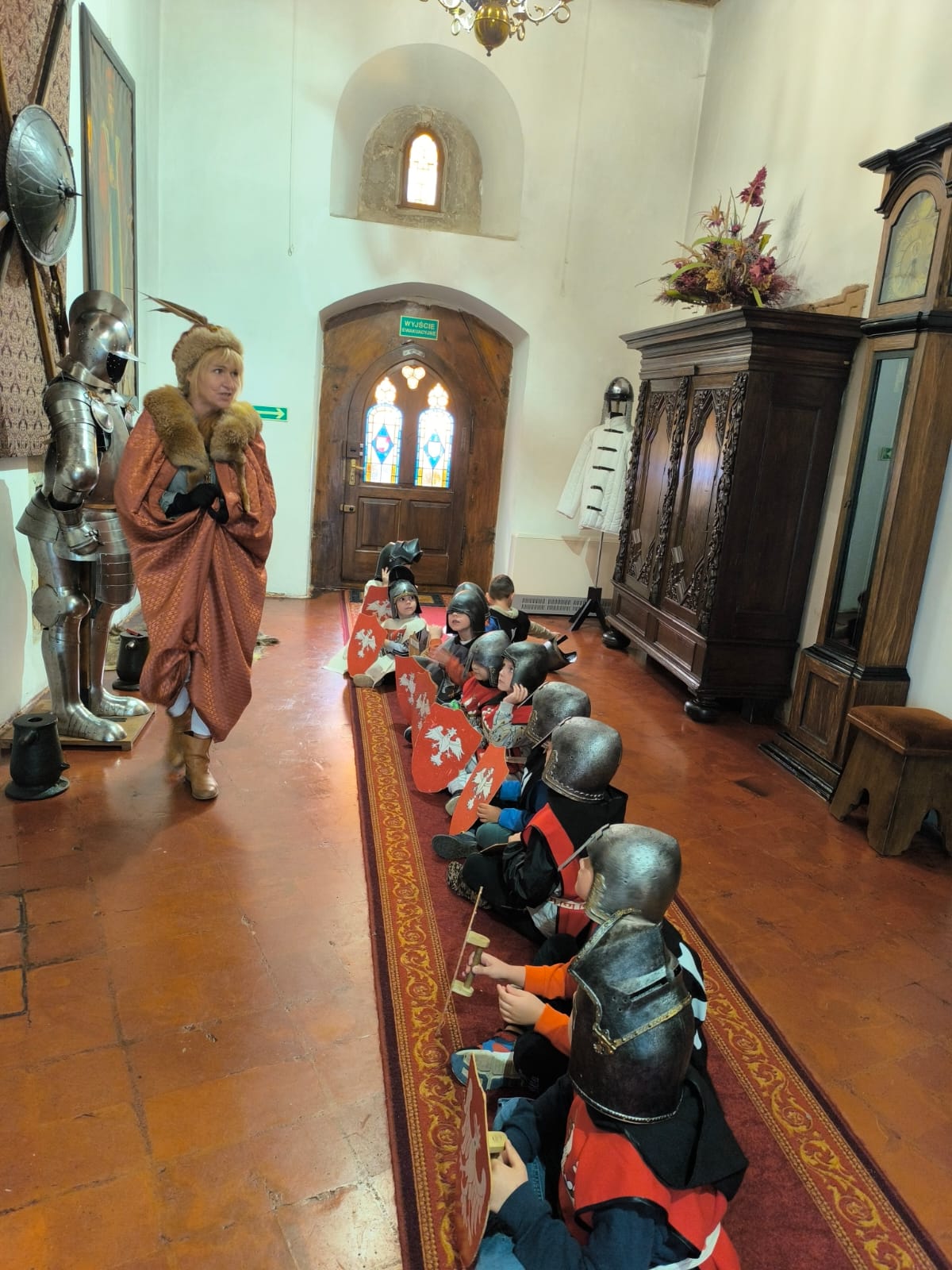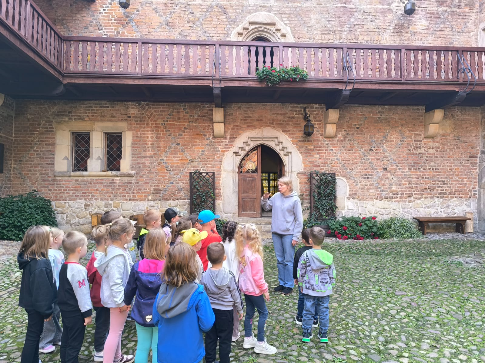 26 września dzieci z grupy „Liski” pojechały na wycieczkę edukacyjną do Zamku w Dębnie. Na początku przedszkolaki ubrane w stroje dam dworu i rycerzy uczestniczyły w warsztatach „Zanim giermek stał się rycerzem”. Następnie pani przewodnik oprowadziła przedszkolaki po kuchni, spiżarni, sali koncertowej, skarbcu, sali myśliwskiej, sali rycerskiej. Zwiedzają pomieszczenia w zamku dzieci poznawały historie i życie najważniejszych przedstawicieli rodów go zamieszkujących. Wysłuchały legendy o Białej Damie. Największe wrażenie sprawił jednak pobyt w podziemnych lochach. W tym niezwykle urokliwym miejscu dzieci przeżyły prawdziwą lekcję historii, która dostarczyła im wielu niezapomnianych wrażeń.