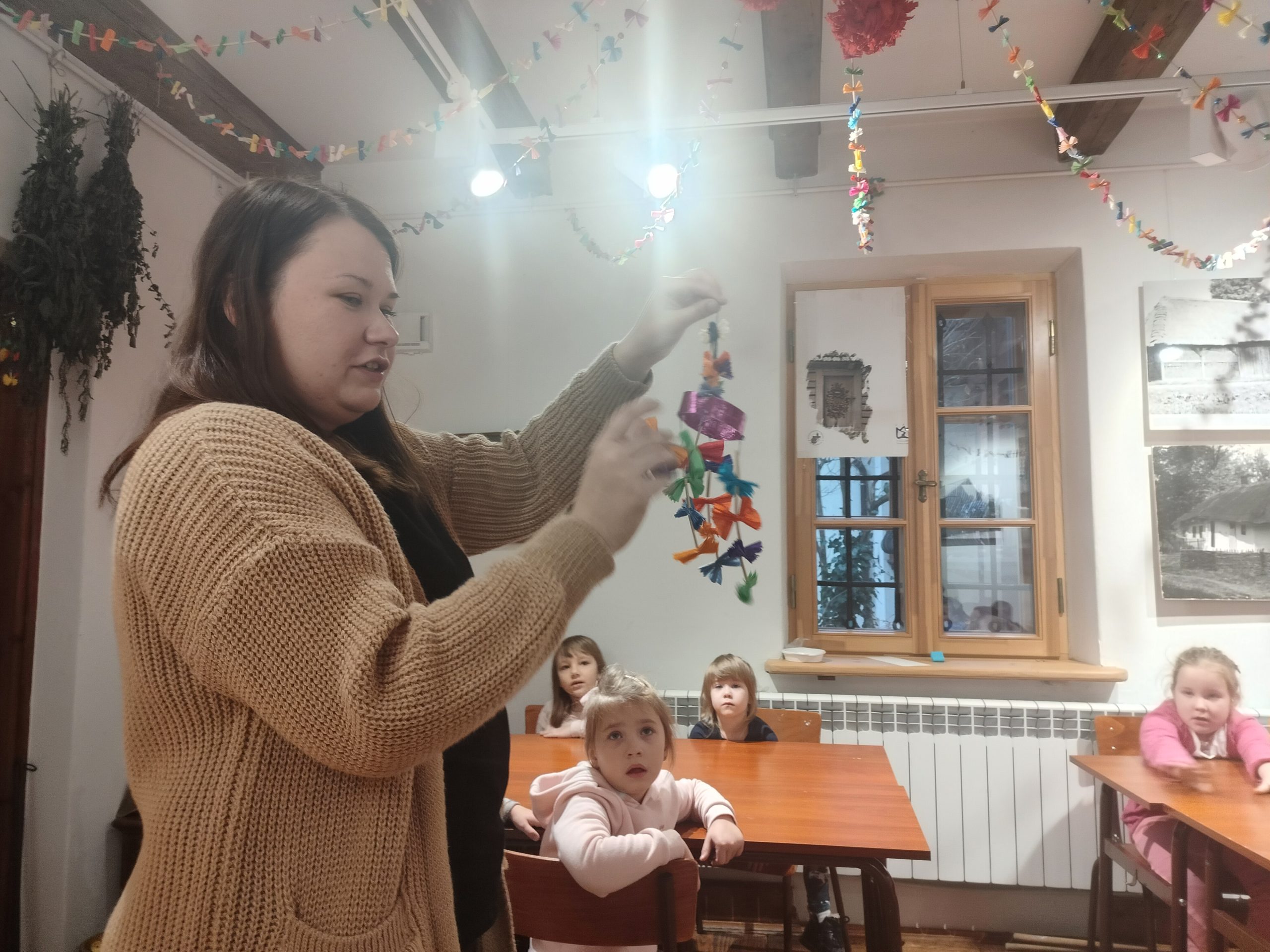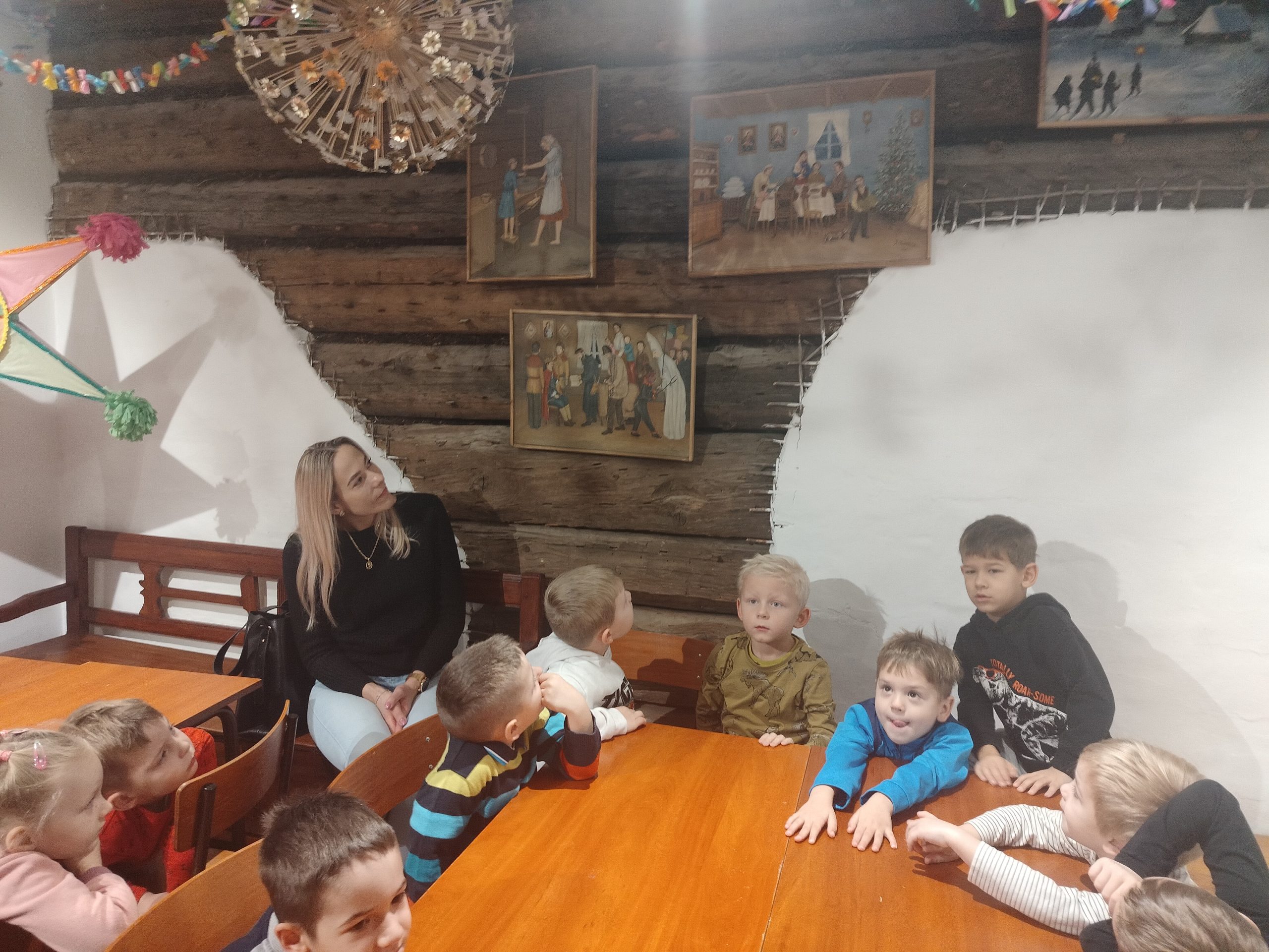 Dnia 14 grudnia dzieci z gr IV „ Liski” wybrały się na warsztaty świąteczne do Muzeum Etnograficznego. Celem zajęć było poszerzenie wiedzy o świątecznych zwyczajach, zapoznanie z wybranymi tradycjami związanymi z okresem Bożego Narodzenia. Przedszkolaki zgłębiali temat tradycji bożonarodzeniowych w Polsce. Z czego składał się świąteczny wystrój wiejskiej chałupy? Skąd brano ozdoby? Jak one wyglądały? Po wprowadzeniu, w części warsztatowej dzieci wykonywały tradycyjne ozdoby bożonarodzeniowe takie jak: światy z opłatków, oraz kolorowe cukierki. Przedszkolaki chętnie uczestniczyły w proponowanych zajęciach.