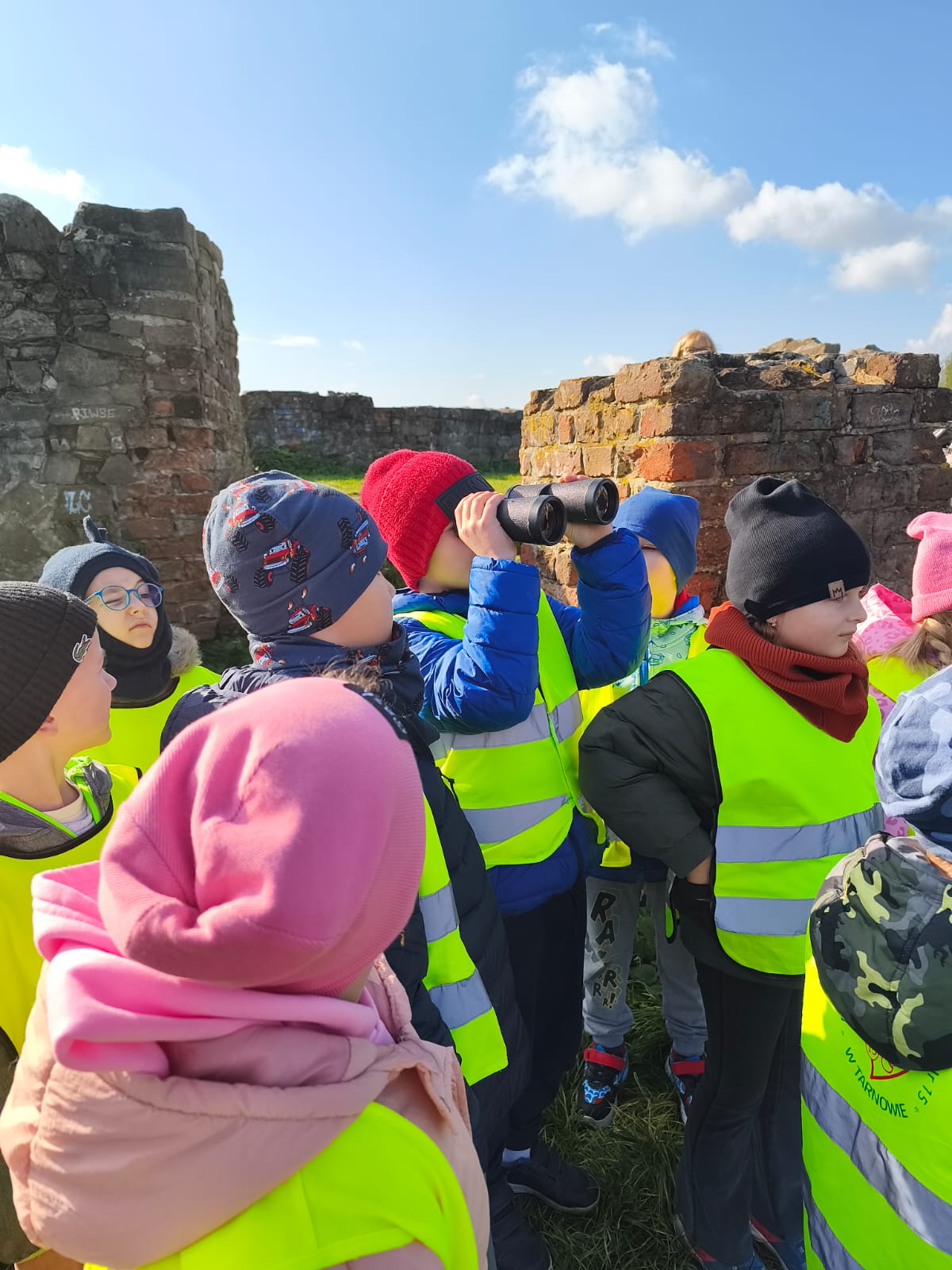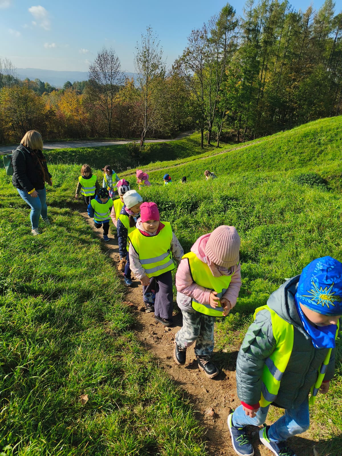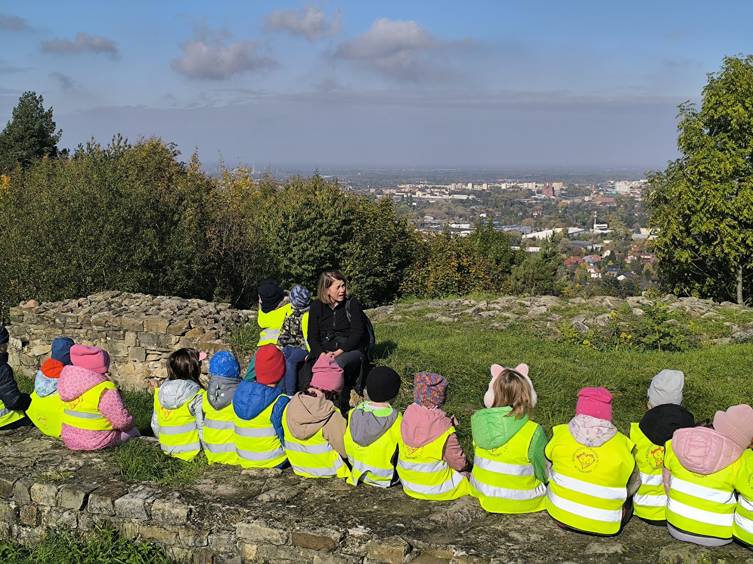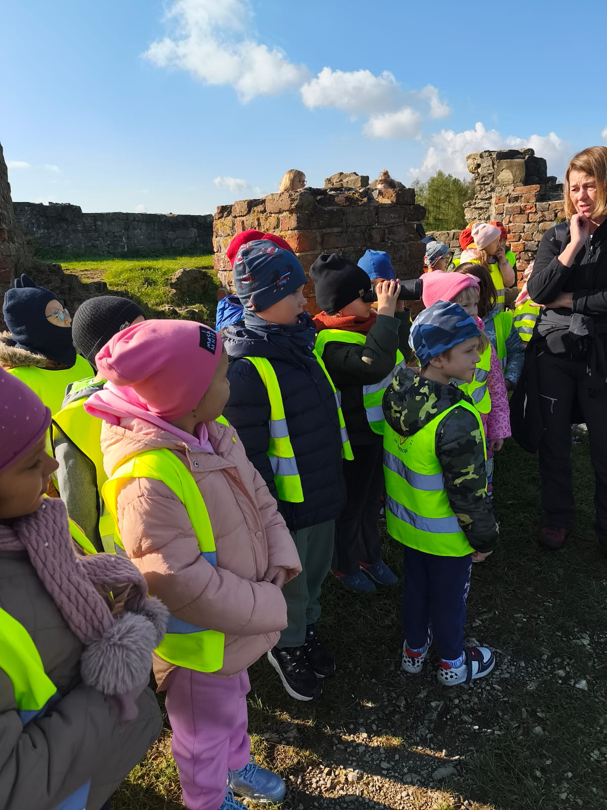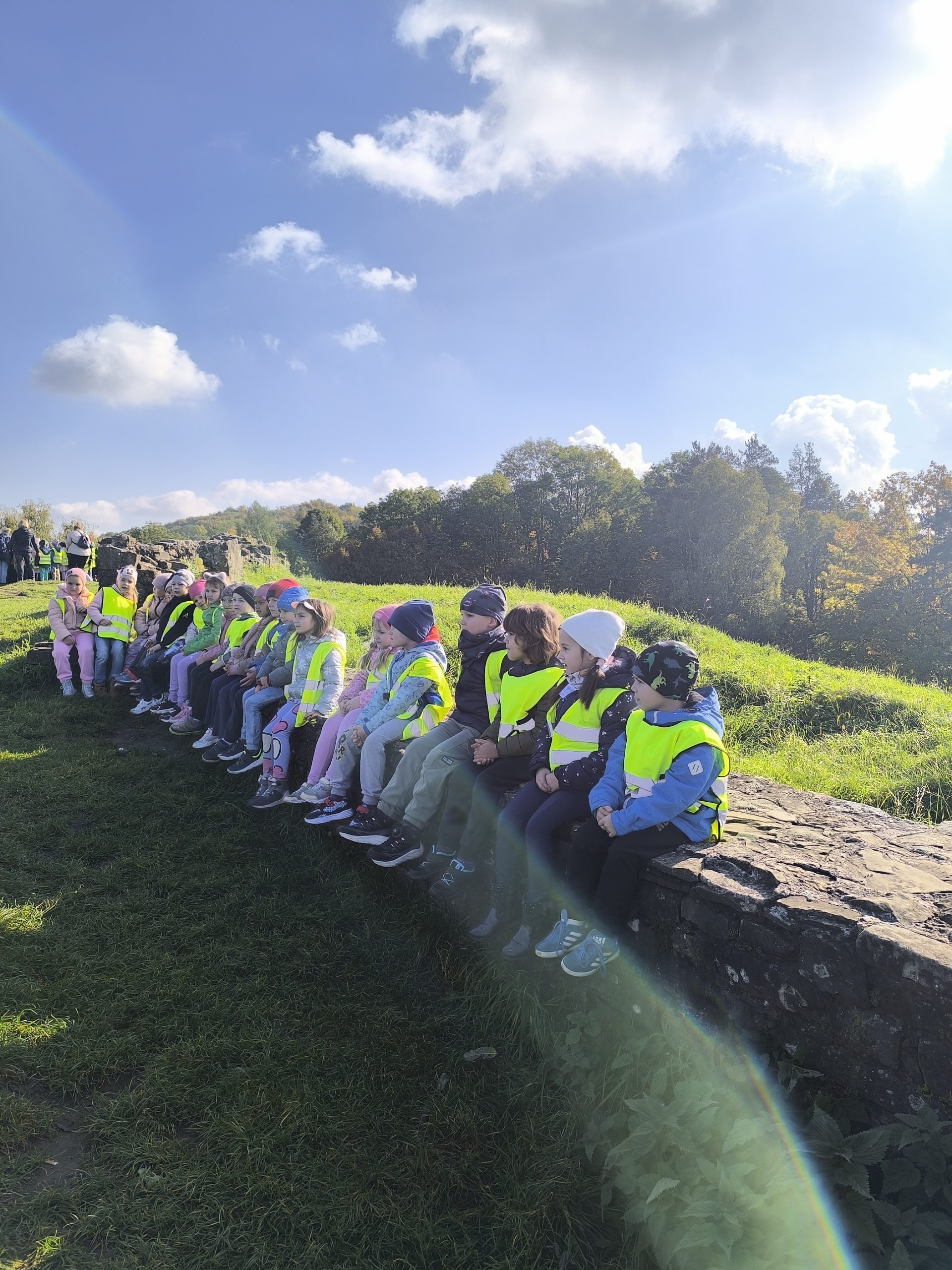Po krótkim odpoczynku grupa ruszyła dalej, spacerem na szczyt Góry Marcina. Po drodze dzieci obserwowały przyrodę – kolorowe liście, leśne ścieżki i piękne jesienne krajobrazy. Na szczycie czekała kolejna atrakcja – ruiny zamku, które rozbudziły dziecięcą wyobraźnię. Tam przedszkolaki wysłuchały legendy o powstaniu zamku i próbowały wyobrazić sobie, jak mógł wyglądać dawniej.