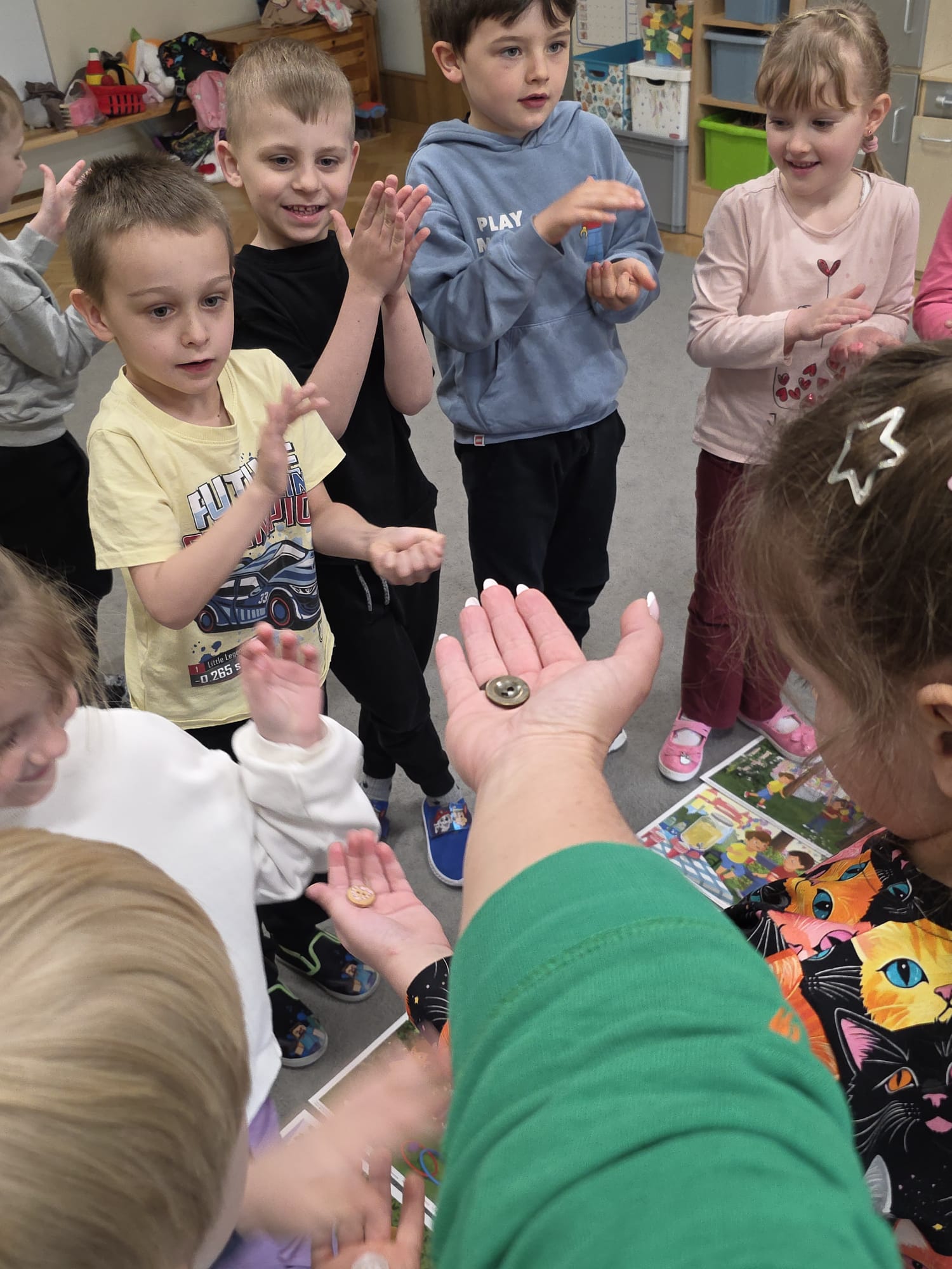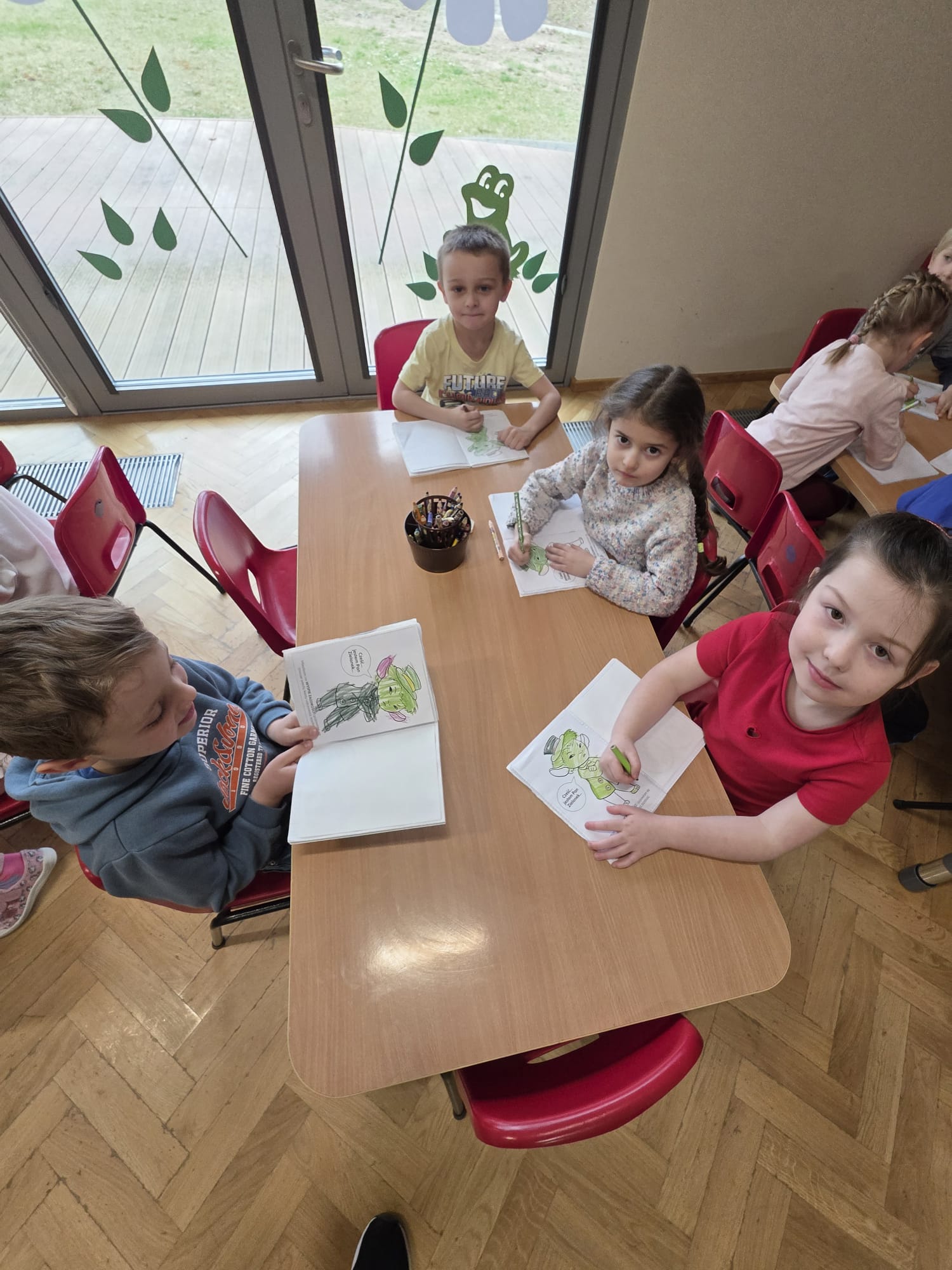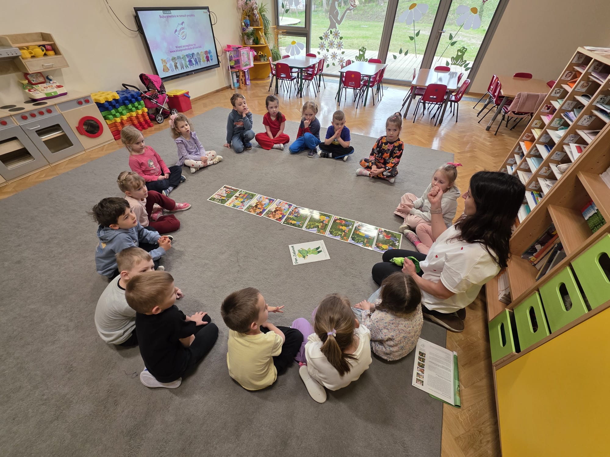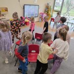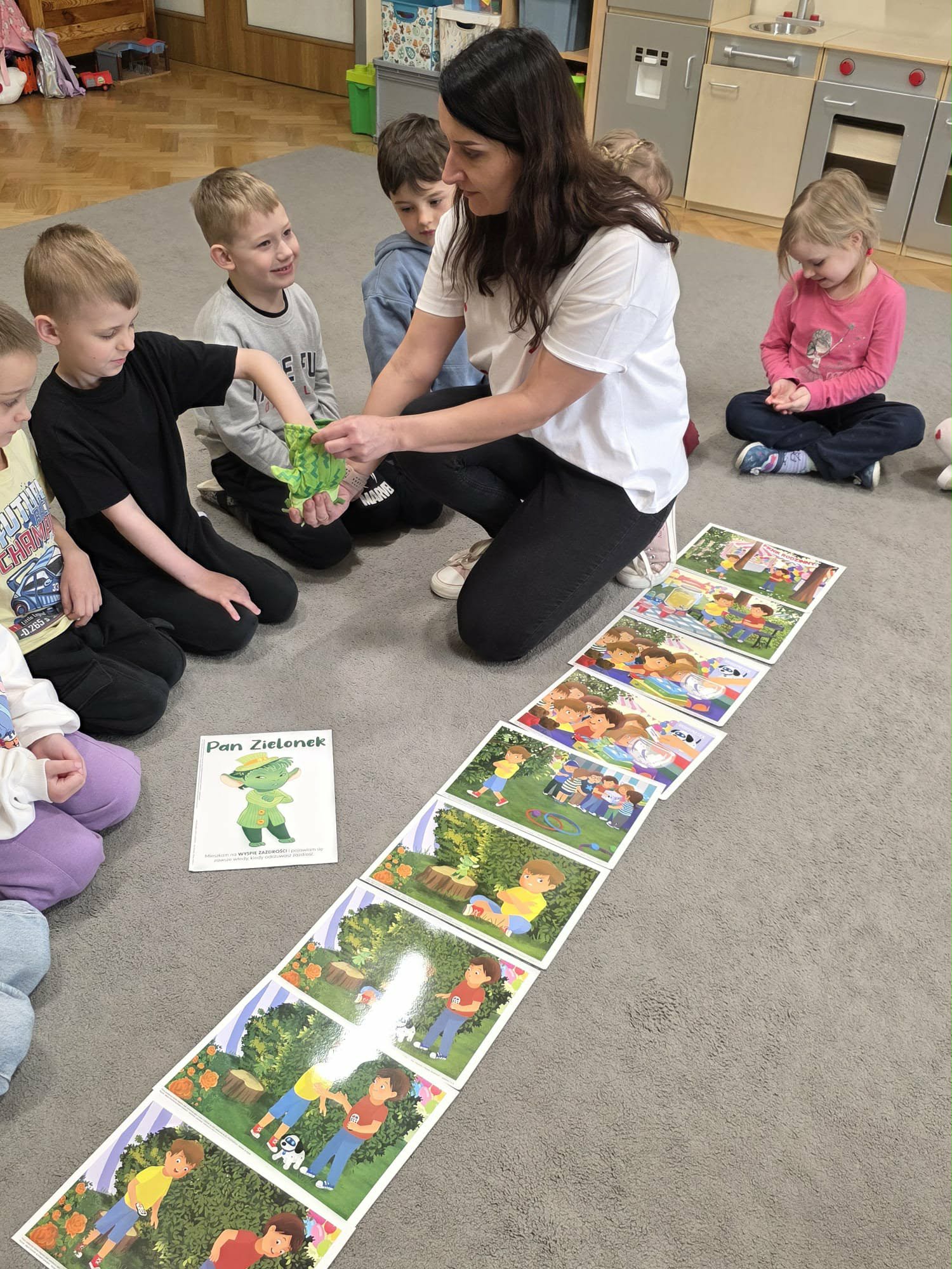 Tym razem dzieci poznały Pana Zielonka z Wyspy Zazdrości. Dzięki jego historii dzieci dowiedziały się, że zazdrość może stać się motywacją do działania, rozwijania swoich umiejętności oraz dążenia do wyznaczonych celów. Zastanawialiśmy się, czym jest zazdrość, kiedy może się pojawiać oraz w jaki sposób można sobie z nią radzić. Podczas zajęć pojawiły się zabawy pomagające lepiej zrozumieć omawianą emocję jak „gorące krzesełka”, ” złoty guzik”, „czuję zazdrość, kiedy…”, podczas której dzieci mogły opowiedzieć o różnych sytuacjach wywołujących to uczucie.