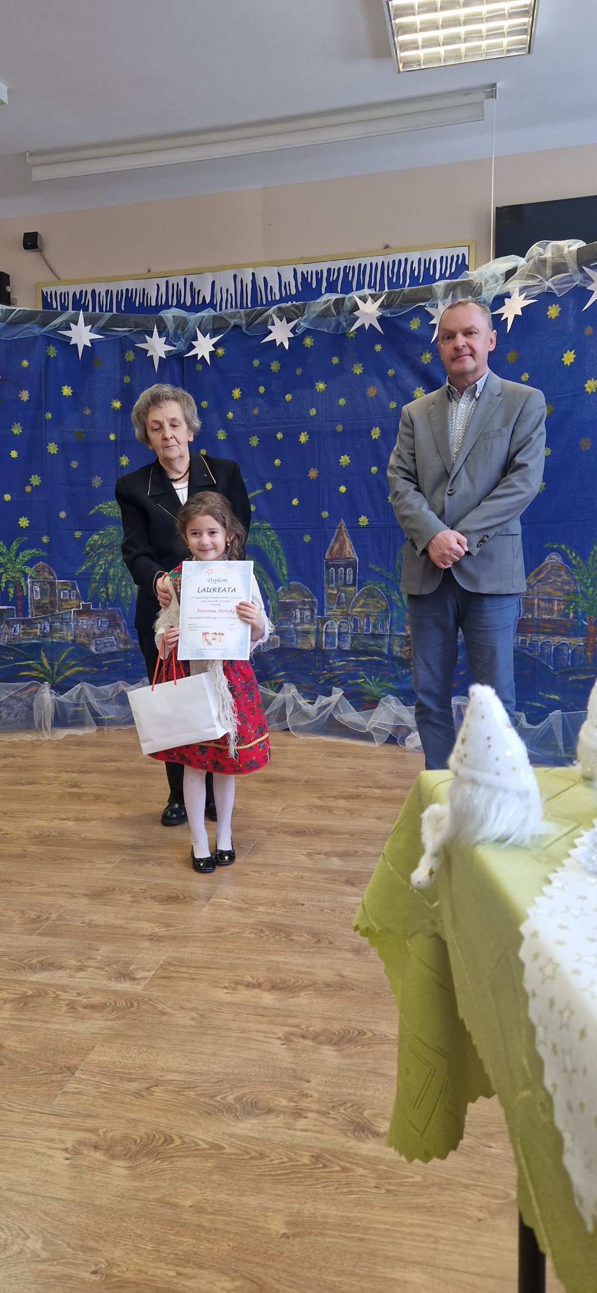 Naszą placówkę z wielkim zaangażowaniem reprezentowała grupa „Małe Gazduski” z grupy V, wykonując pastorałkę „Dnia jednego o północy”, a także solistka