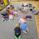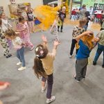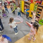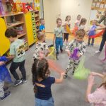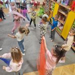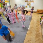 Podczas zabaw muzycznych dzieci rozwijały dużą i małą motorykę poprzez różne ruchu rąk i ciała. Rozwijały wyobraźnię i kreatywność. Kształtowały poczucie rytmu. W tańcu z chustami wyrażały swoje emocje.