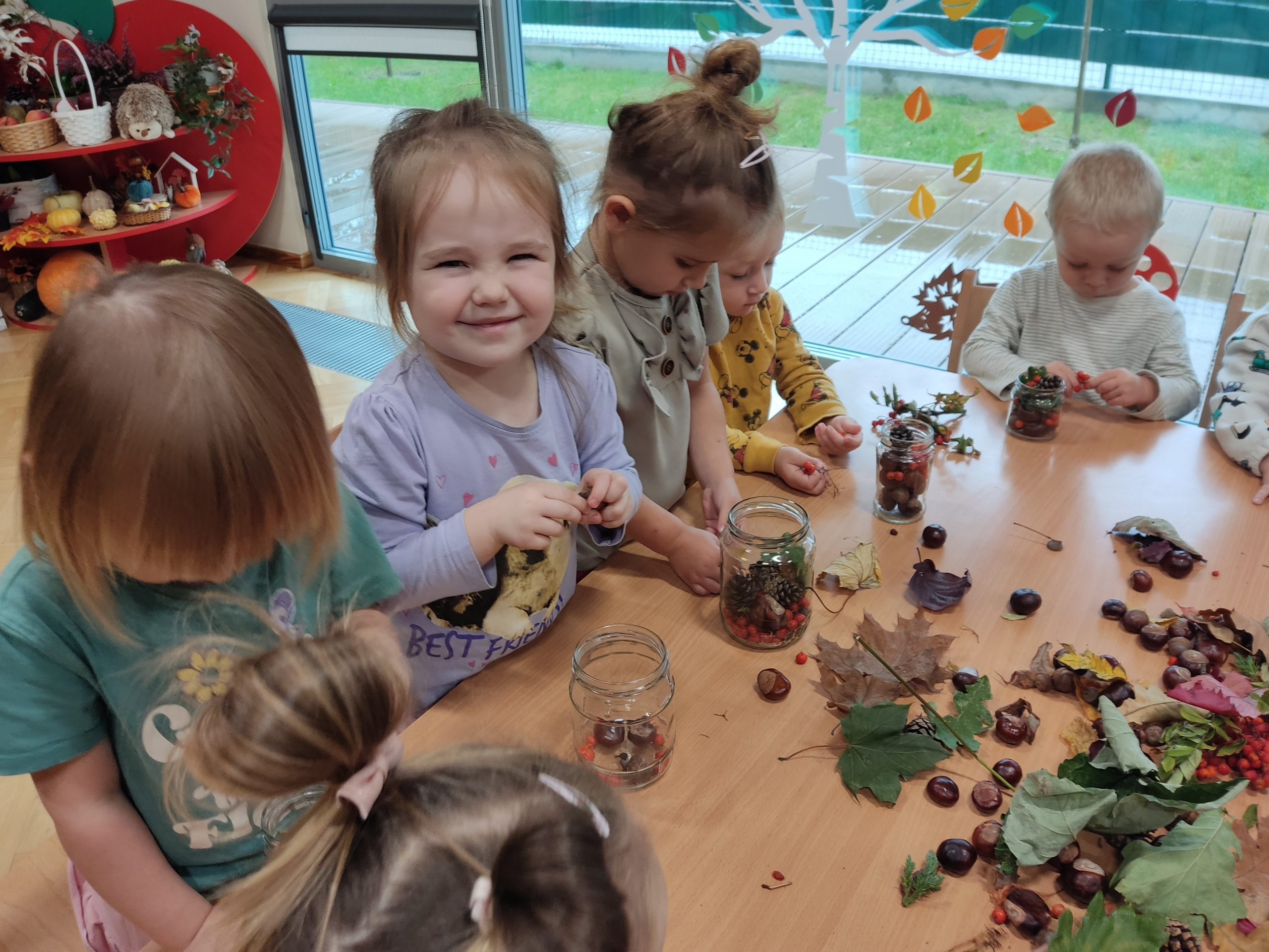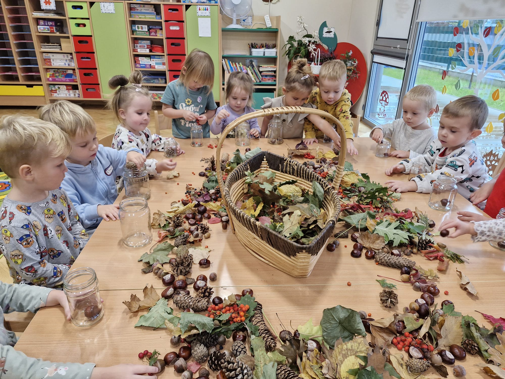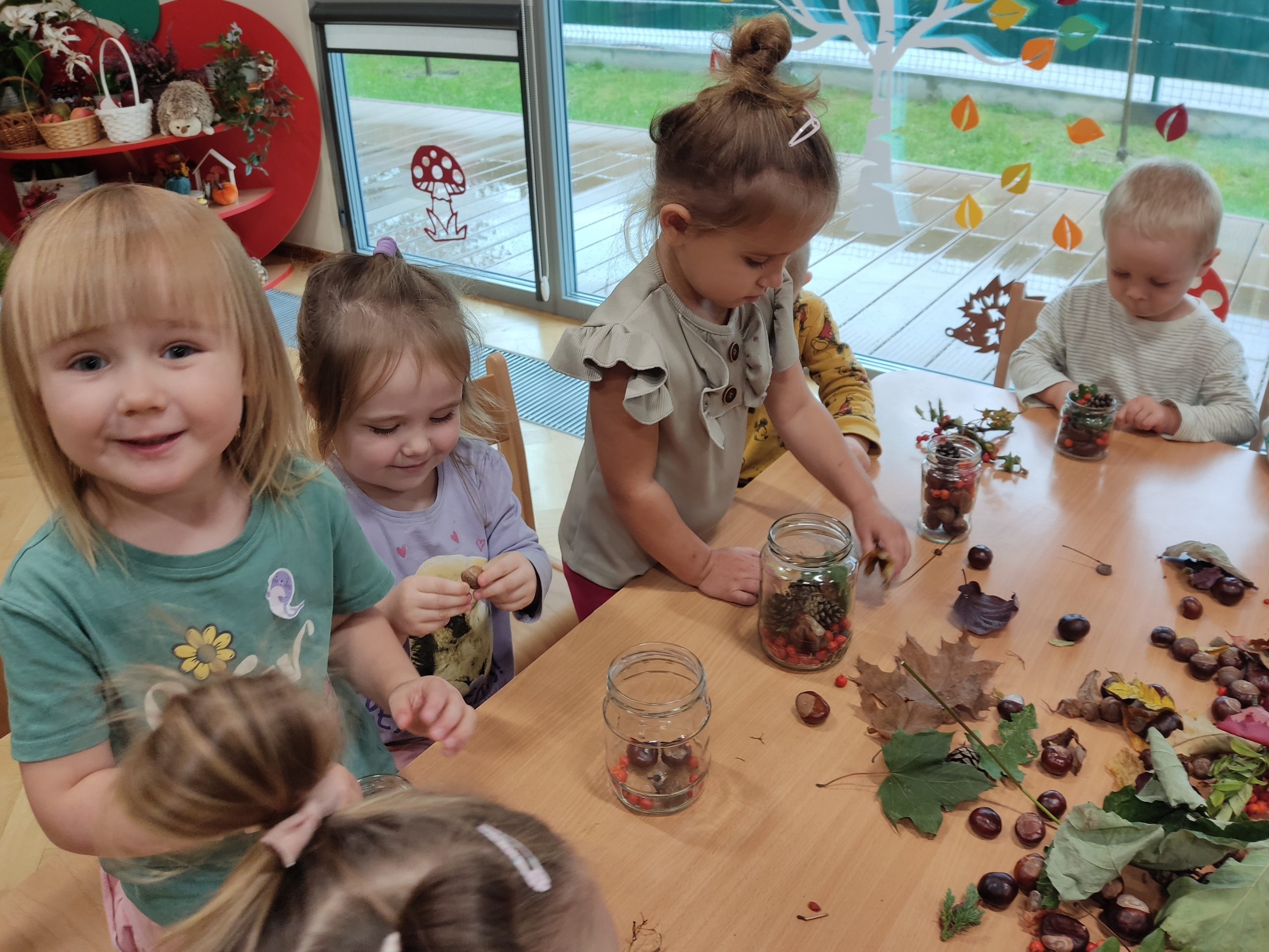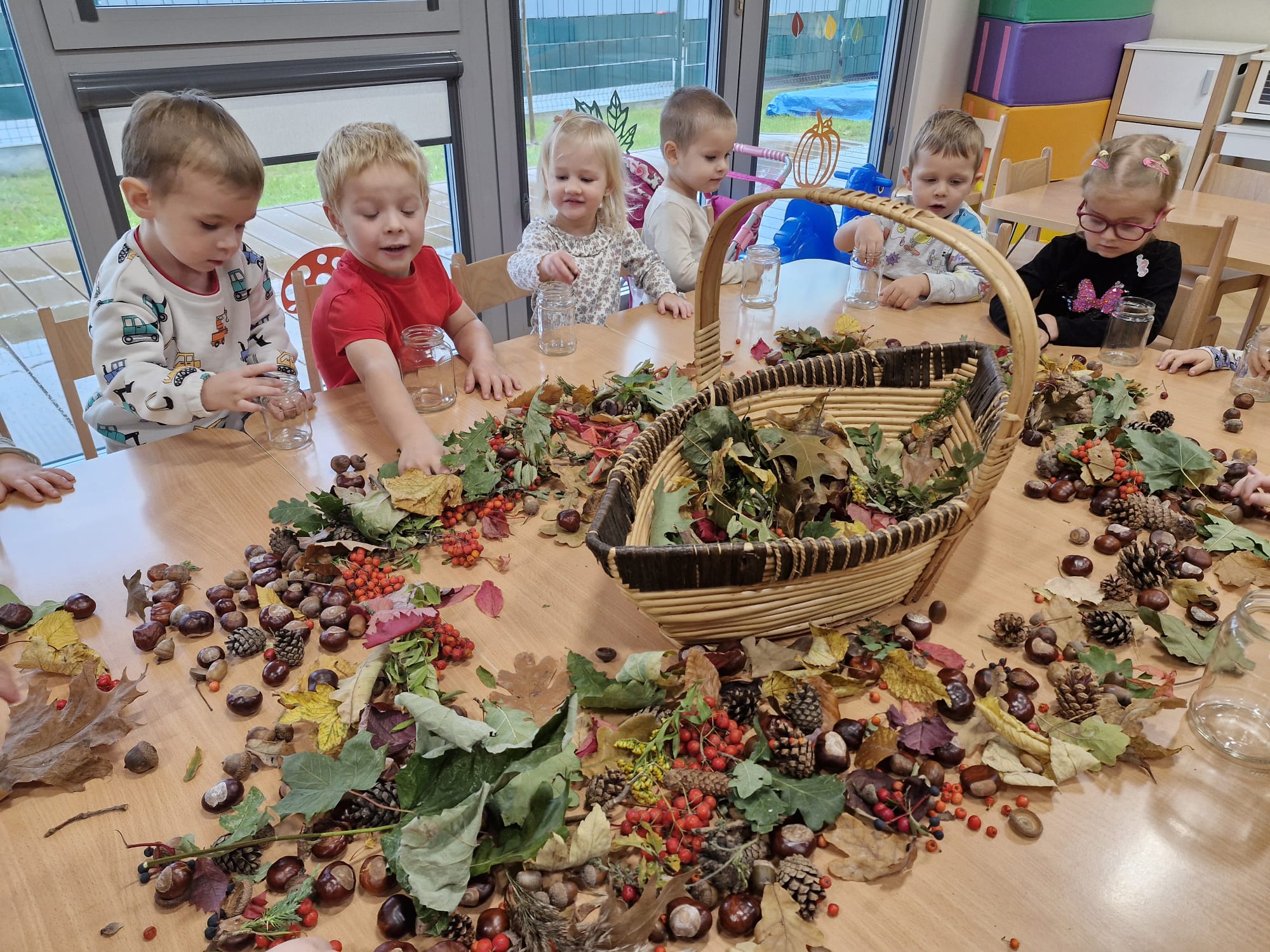 W tym tygodniu w grupie Jeżyków zagościła wyjątkowa, barwna postać – Pani Jesień! W ramach realizowanej w grupie innowacji pedagogicznej „Kraina Zmysłów – sensoryczna podróż przez świat natury” przeprowadzone zostały zabawy sensoryczne z wykorzystaniem jesiennych darów przyrody. Pani Jesień przyniosła ze sobą kosz pełen skarbów: kolorowe liście, szyszki, kasztany, żołędzie i jarzębinę. Nasze przedszkolaki miały okazję poznać dary jesieni wszystkimi zmysłami – dotykały różnorodnych tekstur, wąchały zapachy liści, obserwowały kolory i kształty, a nawet nasłuchiwały szelestu jesiennych liści i gałązek. Zainspirowane przyrodą, dzieci z radością i dużym zaangażowaniem zamieniły się w małych artystów – każde z nich stworzyło własny jesienny słoiczek, wypełniony wybranymi darami natury. Zajęcie to pobudziło kreatywność, doskonaliło sprawność manualną i – co najważniejsze – sprawiło mnóstwo radości! To był tydzień pełen twórczej aktywności i sensorycznych odkryć. Dzięki takim działaniom dzieci nie tylko rozwijają swoje zmysły, ale również budują pozytywny kontakt z otaczającym światem i uczą się czerpać radość z bycia blisko natury.