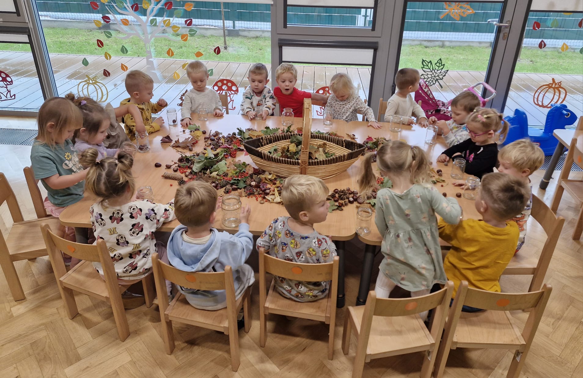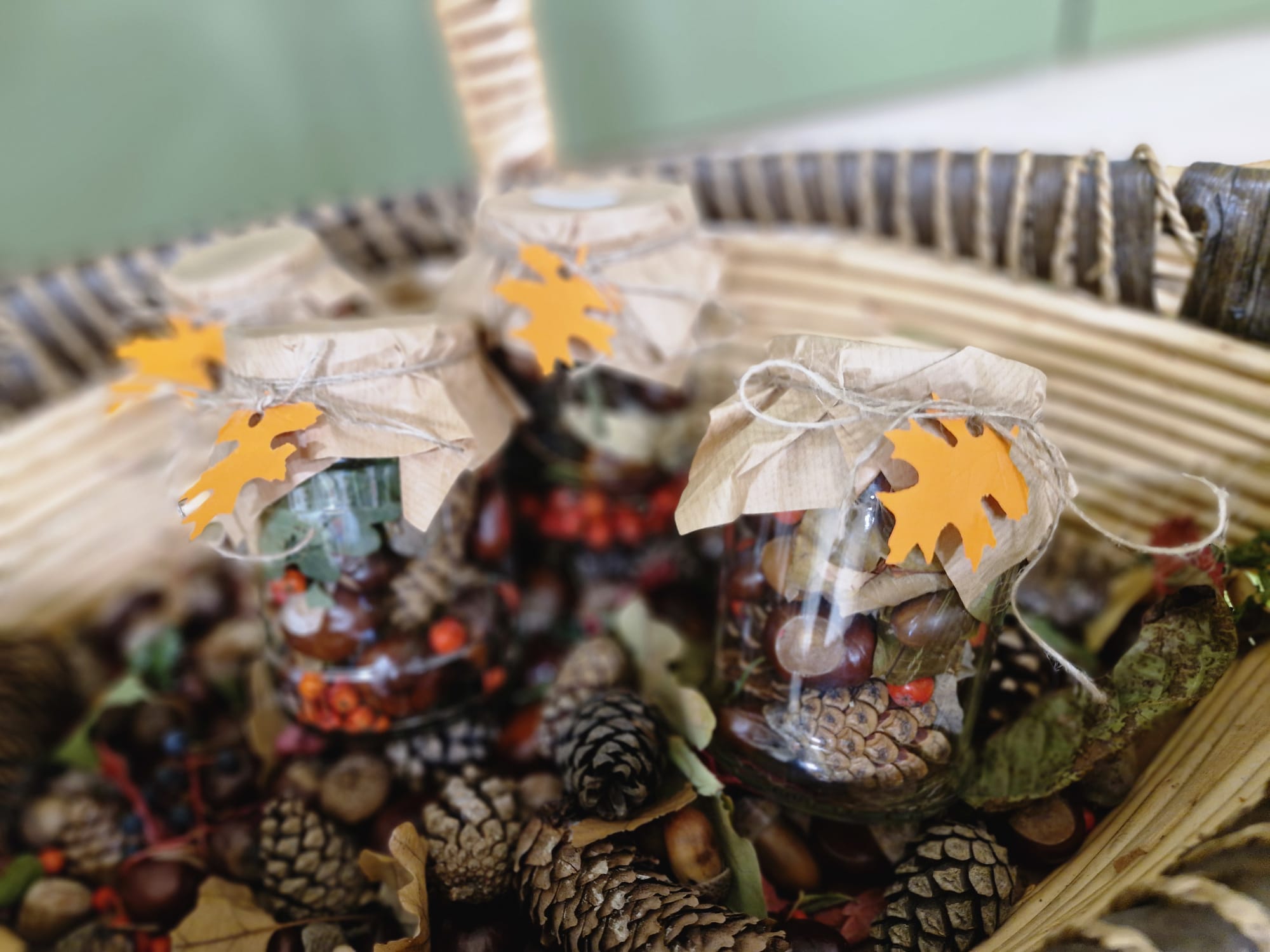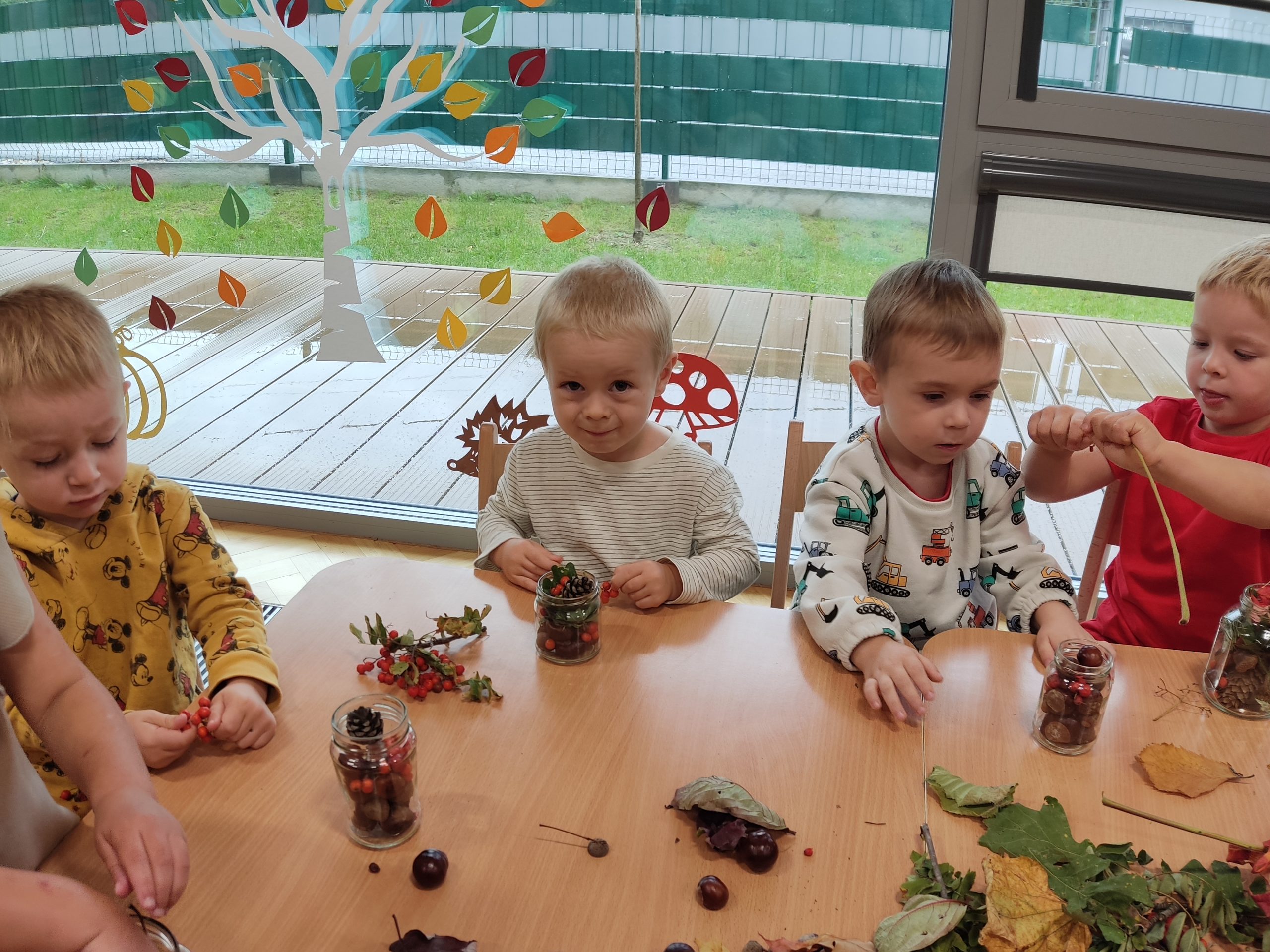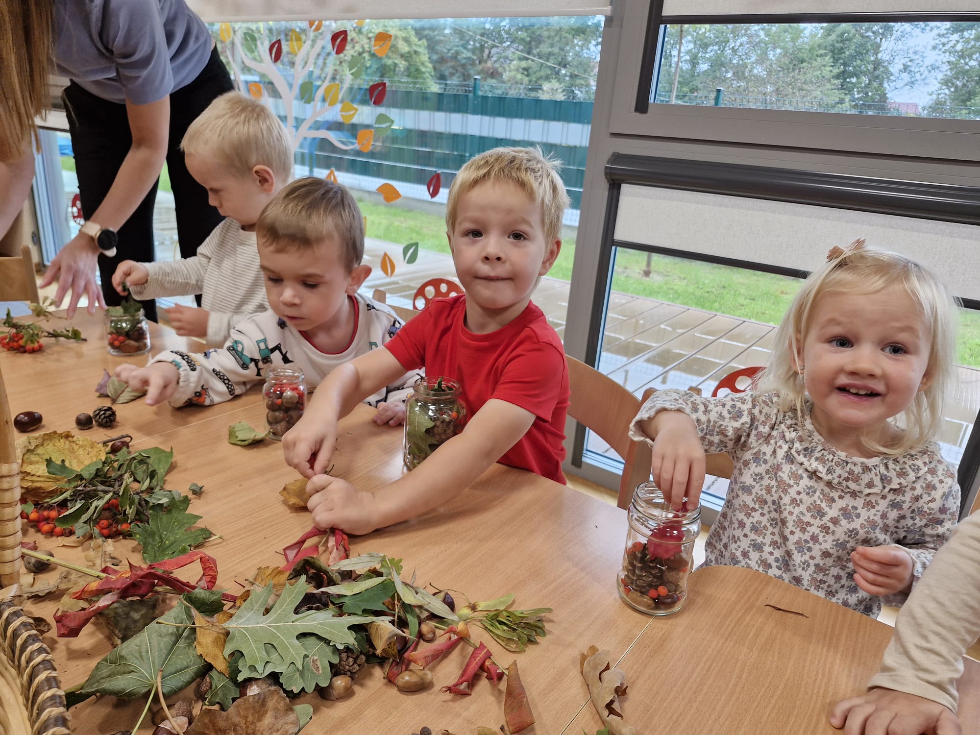 W tym tygodniu w grupie Jeżyków zagościła wyjątkowa, barwna postać – Pani Jesień! W ramach realizowanej w grupie innowacji pedagogicznej „Kraina Zmysłów – sensoryczna podróż przez świat natury” przeprowadzone zostały zabawy sensoryczne z wykorzystaniem jesiennych darów przyrody. Pani Jesień przyniosła ze sobą kosz pełen skarbów: kolorowe liście, szyszki, kasztany, żołędzie i jarzębinę. Nasze przedszkolaki miały okazję poznać dary jesieni wszystkimi zmysłami – dotykały różnorodnych tekstur, wąchały zapachy liści, obserwowały kolory i kształty, a nawet nasłuchiwały szelestu jesiennych liści i gałązek. Zainspirowane przyrodą, dzieci z radością i dużym zaangażowaniem zamieniły się w małych artystów – każde z nich stworzyło własny jesienny słoiczek, wypełniony wybranymi darami natury. Zajęcie to pobudziło kreatywność, doskonaliło sprawność manualną i – co najważniejsze – sprawiło mnóstwo radości! To był tydzień pełen twórczej aktywności i sensorycznych odkryć. Dzięki takim działaniom dzieci nie tylko rozwijają swoje zmysły, ale również budują pozytywny kontakt z otaczającym światem i uczą się czerpać radość z bycia blisko natury.
