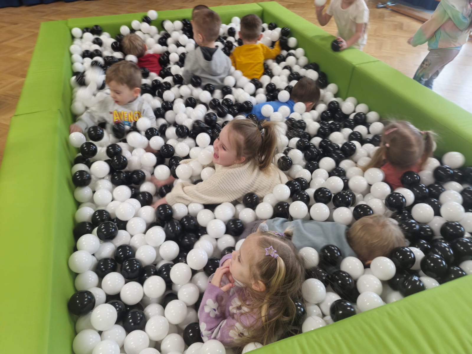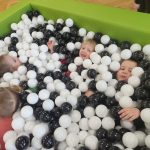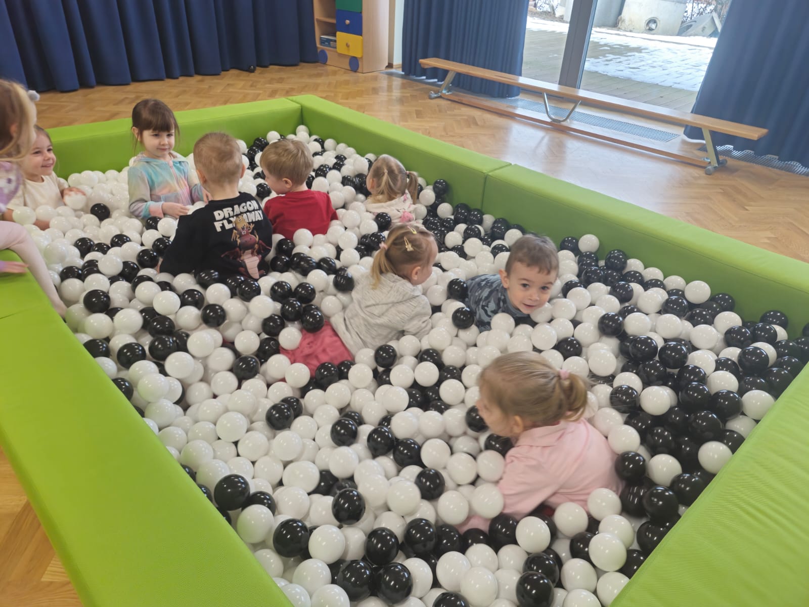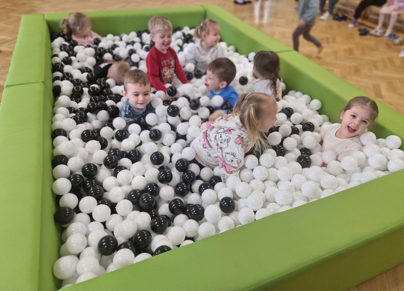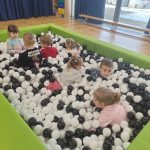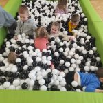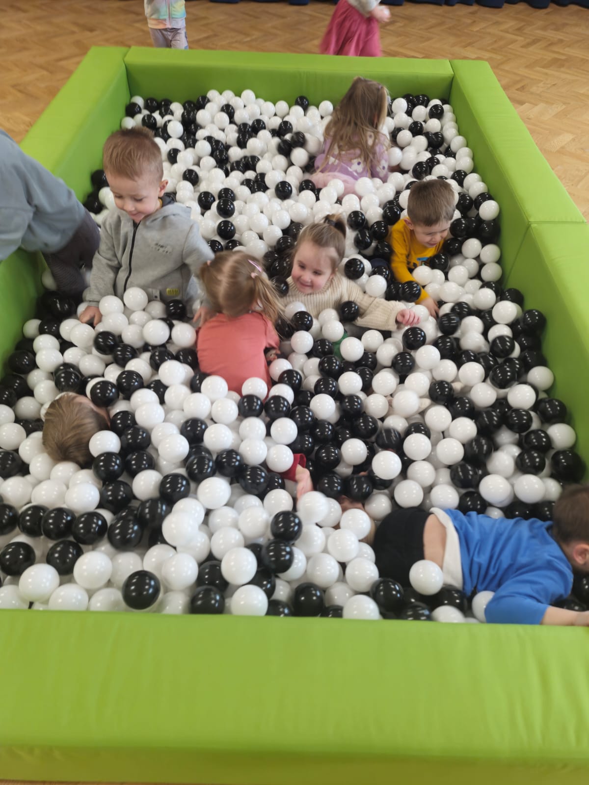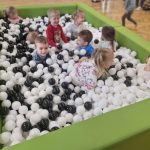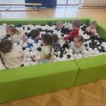 Dzieci z grupy „Jeżyki” uczestniczą w radosnych zabawach w przedszkolnym basenie wypełnionym kolorowymi piłeczkami. Przebywanie wśród kulek to doskonały sposób na delikatny masaż całego ciała oraz rozluźnienie napiętych mięśni. Zabawy w suchym basenie sprzyjają rozwojowi sprawności fizycznej – dzieci, przedzierając się przez różnobarwne piłeczki, uczą się panować nad własnym ciałem, ćwiczą równowagę oraz koordynację ruchową. Sprawność manualna rozwijana jest poprzez chwytanie, przenoszenie i rzucanie piłeczek. Aktywność w basenie wprawia dzieci w radosny nastrój, wpływa pozytywnie na ich samopoczucie oraz daje możliwość zaspokojenia naturalnej potrzeby ruchu.
