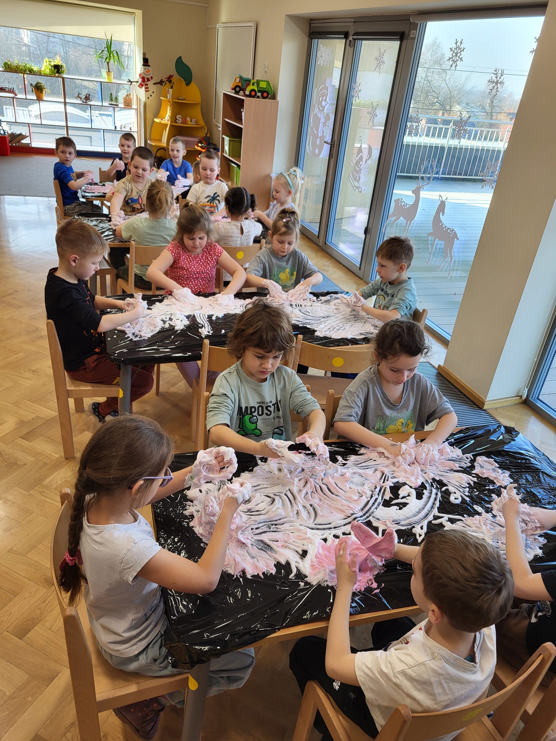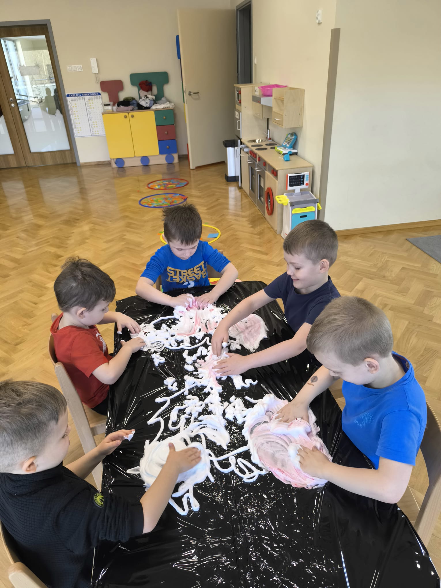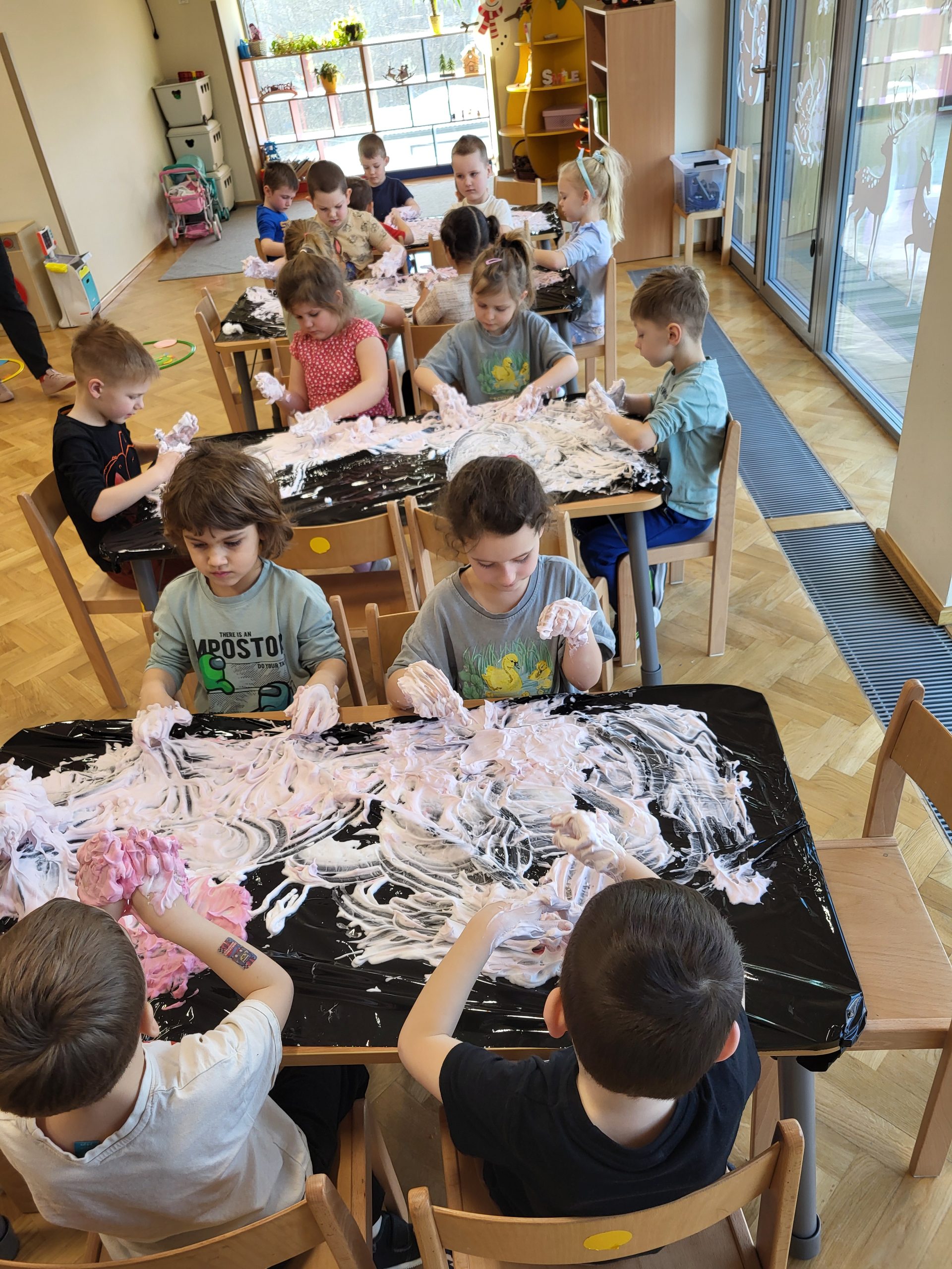 W dniu 11 lutego w naszej grupie, w ramach Ogólnopolskiego Projektu Edukacyjnego „Gramy Zmysłami” odbyły się zajęcia z wykorzystaniem pianek do golenia oraz barwników. Dzieci mieszały piankę z kolorowymi barwnikami i miały za zadanie rysować po niej palcami poznane w tym tygodniu figury geometryczne, jak również kwiatki, słońce, chmury, uśmiechnięte buzie. Był też czas na dowolną, kreatywną zabawę pianką. Zajęcia dostarczyły dzieciom wiele doznań sensorycznych zapachowych, wzrokowych, ale przede wszystkim stymulacji dotykowej. Wszystkie przedszkolaki świetnie się przy tym bawiły.