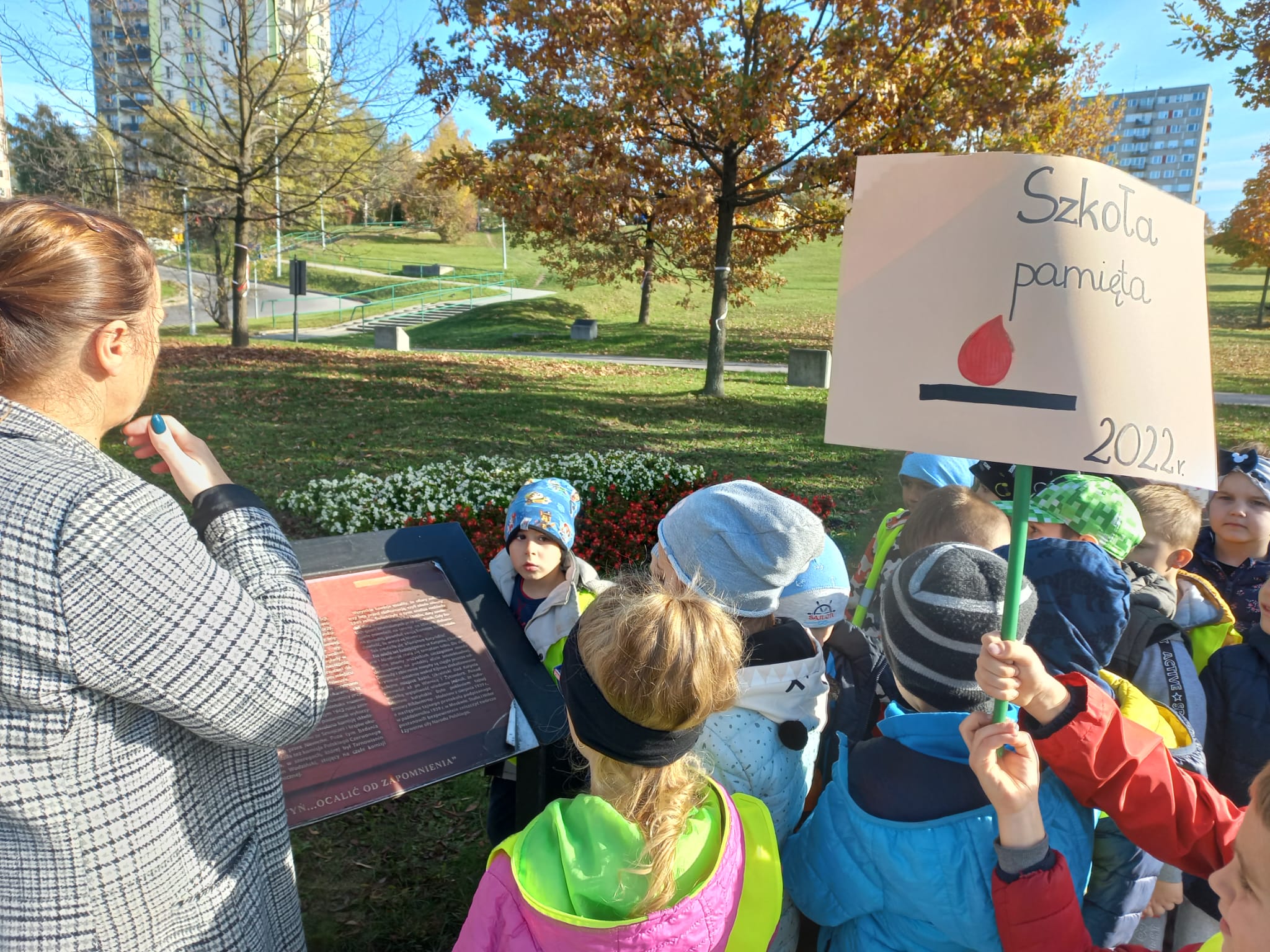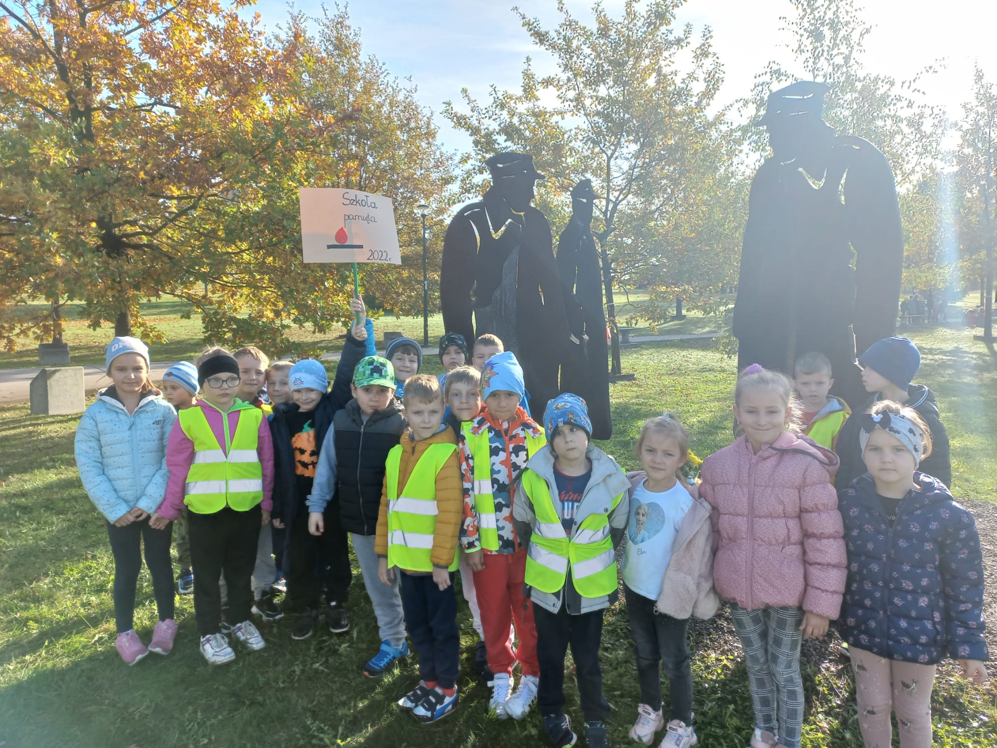 28.10.2022r. grupa IV wzięła udział w akcji ,, Szkoła pamięta” organizowanej przez MEN. Celem tej inicjatywy jest zorganizowanie działań upamiętniających ważne postaci i wydarzenia. Zajączki w tym dniu odwiedziły Aleję Dębów Katyńskich w Tarnowie. Zapaliły znicze pod pomnikiem ofiar katyńskich. W ciszy oglądały pamiątkowe obeliski, wysłuchały informacji o poległych w Katyniu tarnowianinach.