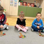 Nie zabrakło też zabaw ruchowych i muzycznych! „Zajączki” tańczyły przy piosenkach o jesieni, naśladowały spadające liście, a także bawiły się w „kasztanowe wyścigi”.W sali powstał też nasz mały „kącik przyrodniczy”, w którym dzieci mogą codziennie oglądać i dotykać jesienne skarby.