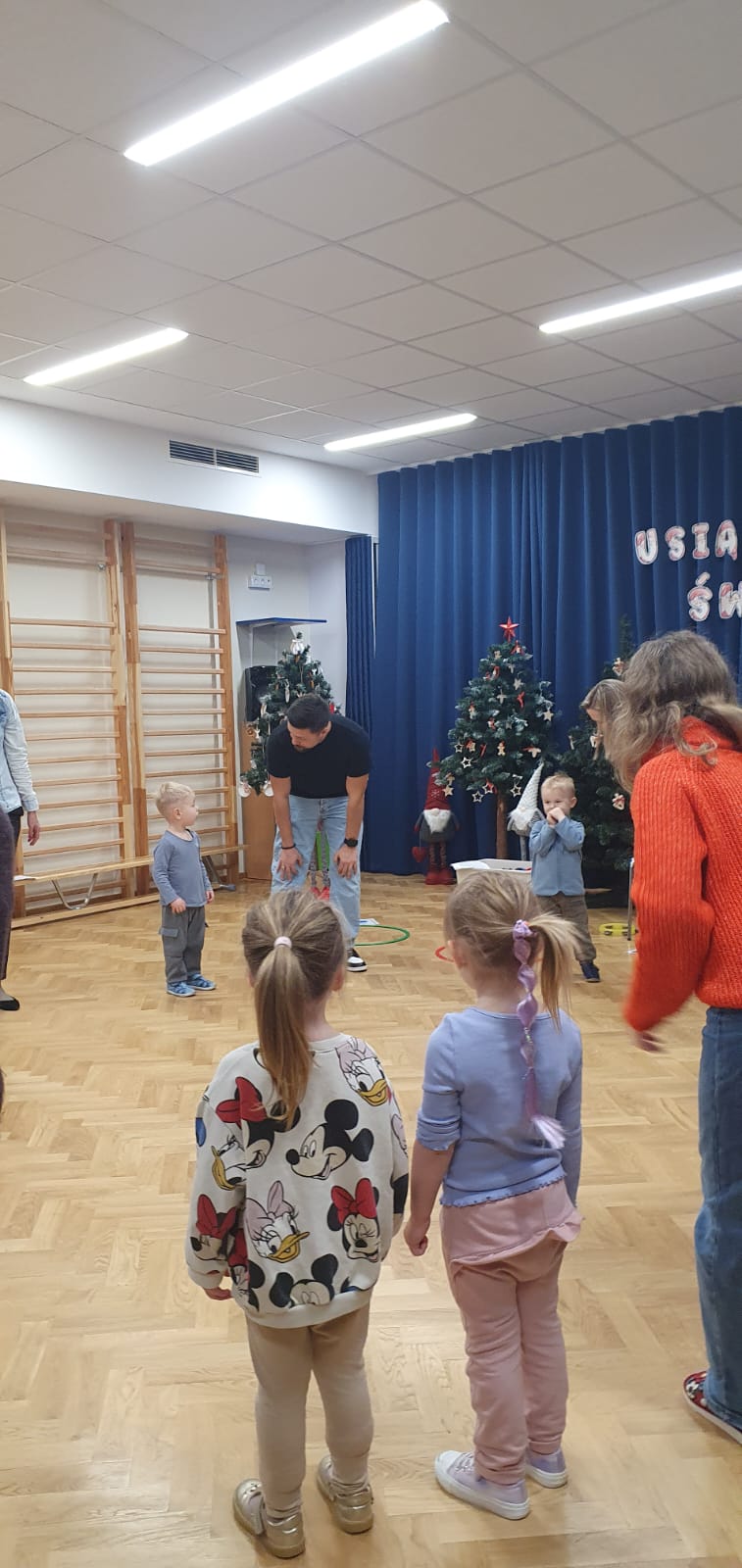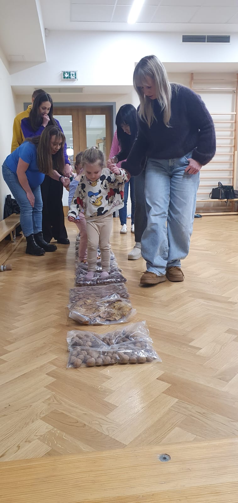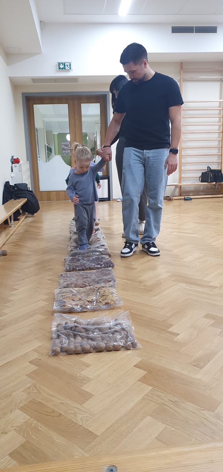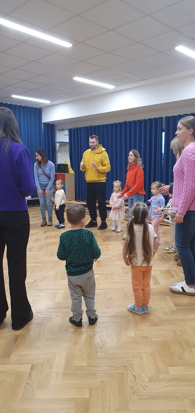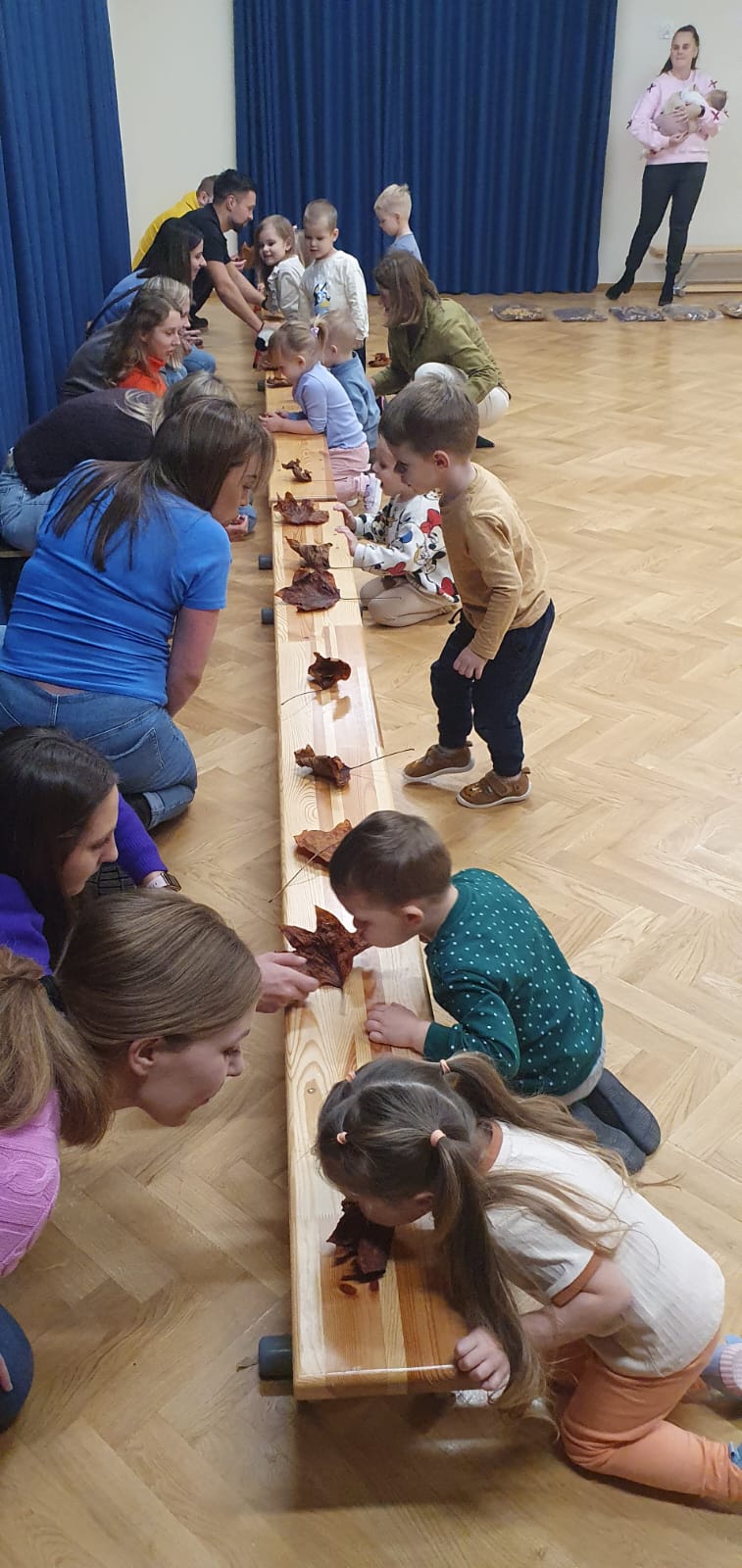 w zabawy muzyczne, oddechowe, ruchowe i sensoryczne…Dzieci były zachwycone obecnością swoich Rodziców, a dorośli z entuzjazmem angażowali się we wszystkie zadania. Wspólna aktywność pokazała, jak ważny jest czas spędzany razem – szczególnie wtedy, gdy łączy zabawę, ruch i uśmiech. Przedszkolaki miały okazję zaprezentować swoje różnorodne umiejętności, a Rodzice z dumą obserwowali je podczas wspólnych zabaw. Dużym przeżyciem okazała się ścieżka sensoryczna przygotowana z jesiennych skarbów – liści, kasztanów, orzechów, żołędzi, patyków, szyszek i mchu. Dzieci z ogromną ciekawością odkrywały kolejne „stacje”, przechodząc po nich w samych skarpetkach. Każdy krok dostarczał niezwykłych wrażeń.