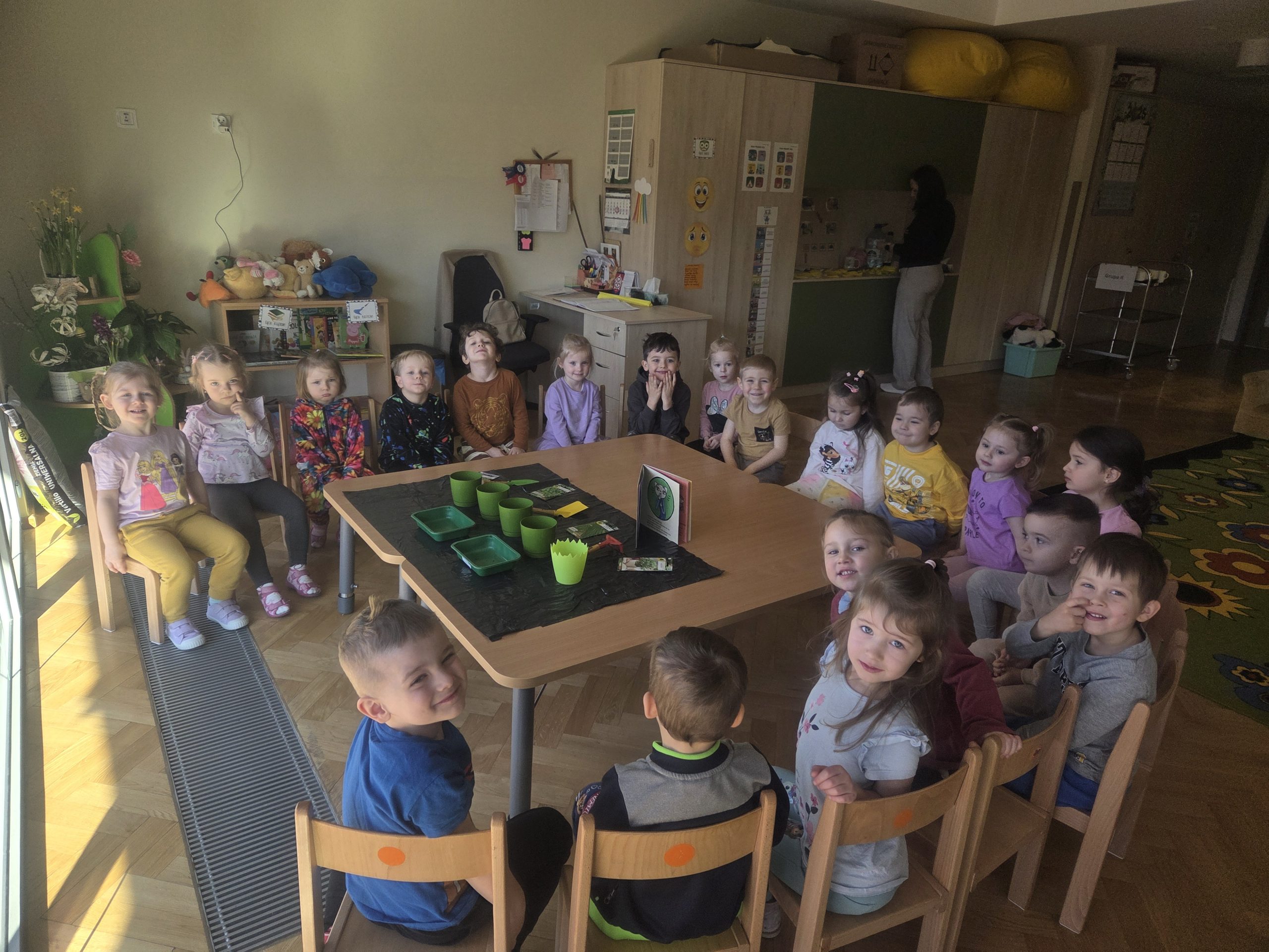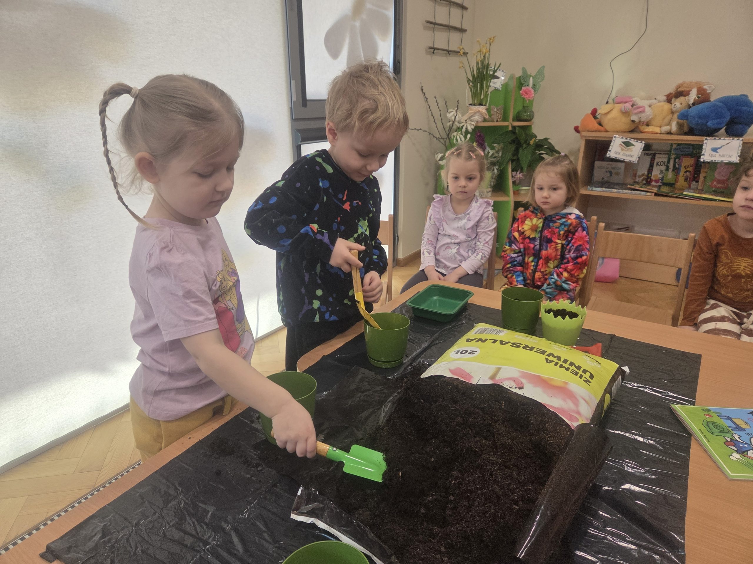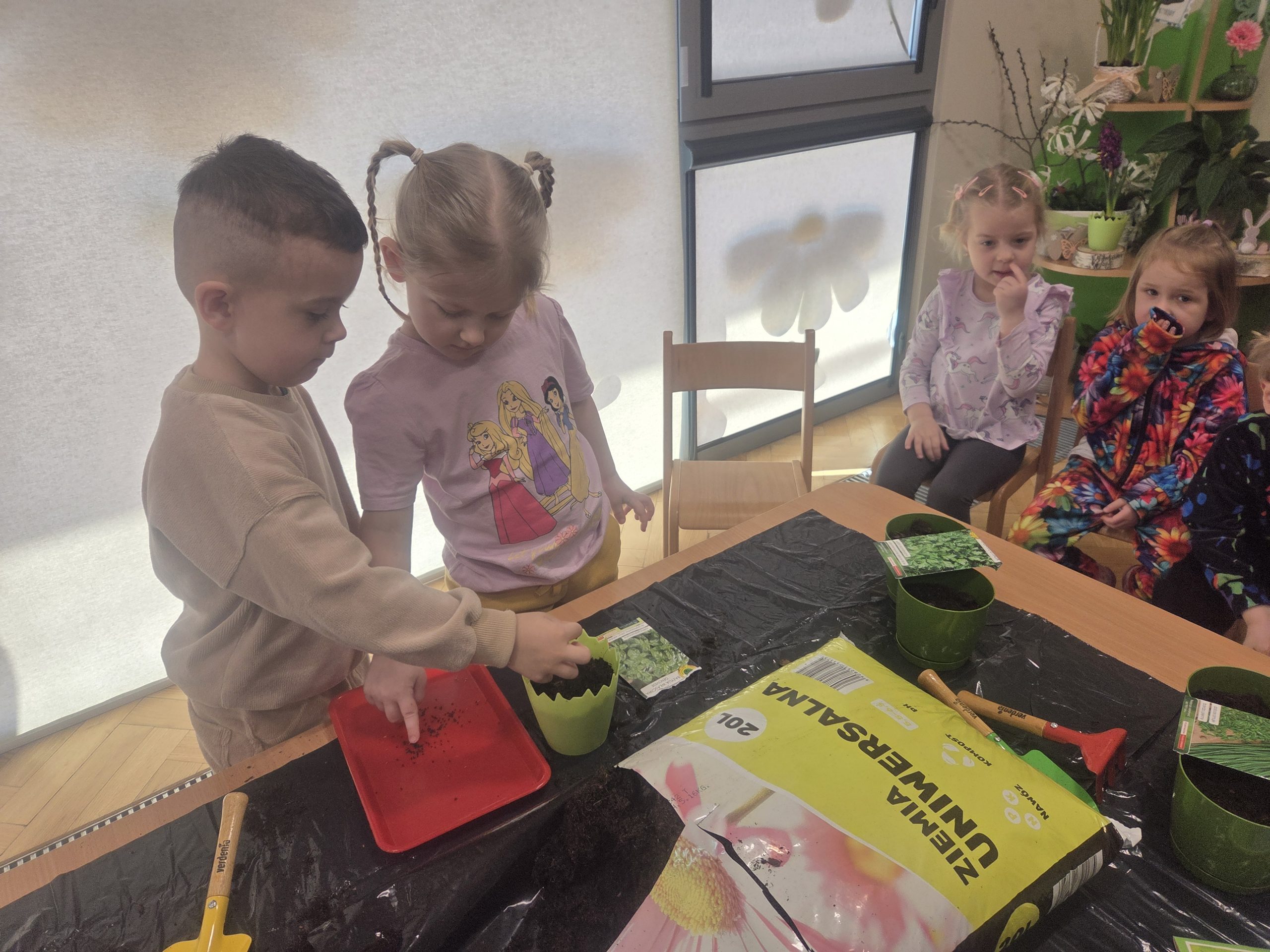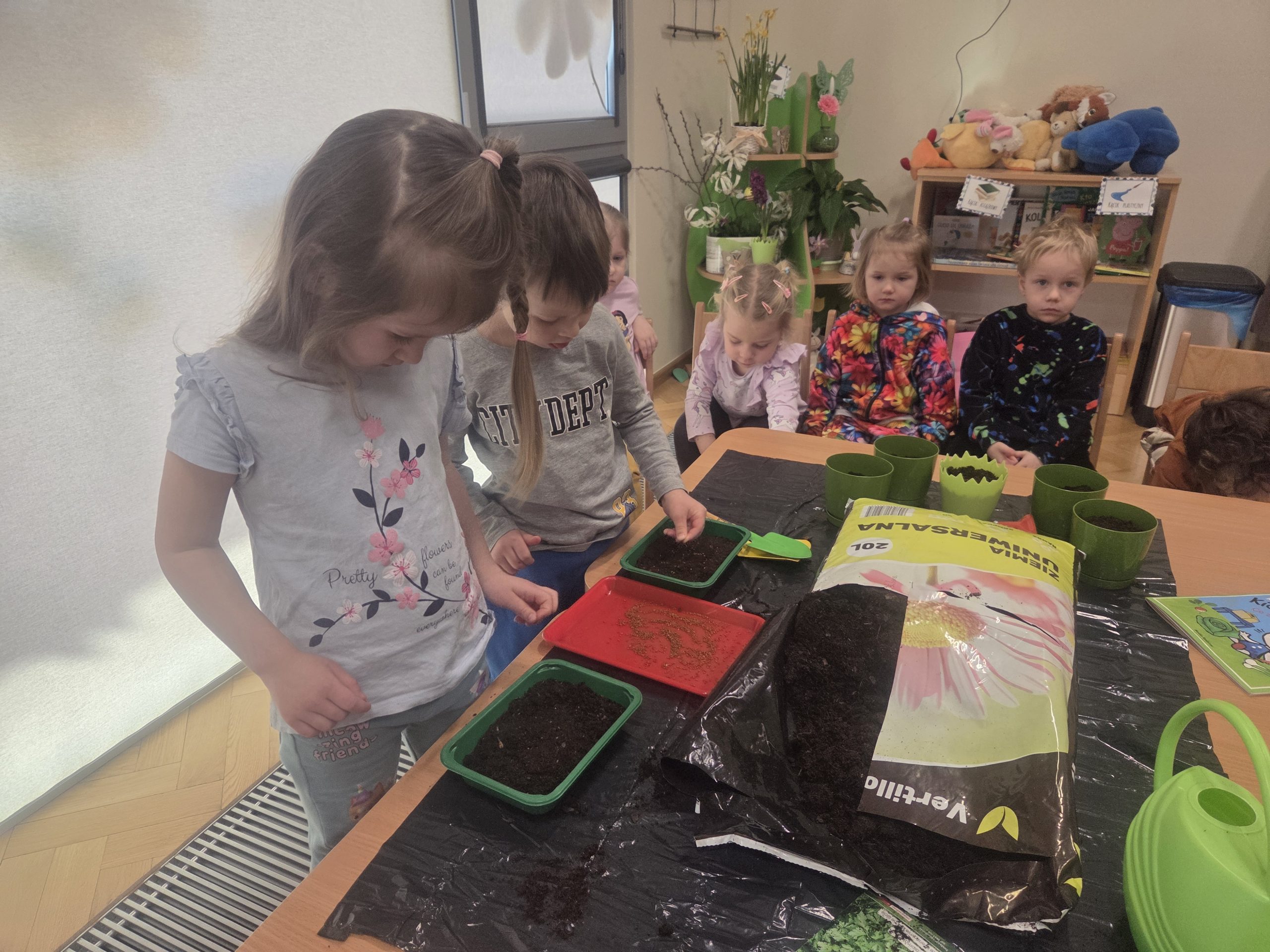 20 marca, tuż przed pierwszym dniem wiosny, Zajączki postanowiły założyć własną hodowlę warzyw w naszej sali. Realizując kolejny temat z Programu „Z Kicią Kocią maluchy zmieniają się w zuchy”, najpierw dzieci wysłuchały opowiadania o tym jak Kicia Kocia wraz z przyjaciółmi siała warzywa w przedszkolu, a następnie przystąpiliśmy do pracy. Każdy z nas miał okazję od podstaw rozpocząć pracę – zasiać jakieś warzywo, czy też podlać je po skończonym wysiewie. Każdego dnia dzieci będą samodzielnie podlewać warzywa, aby uświadomić im jak ważne jest dbanie o rośliny/warzywa. Oby już wkrótce wyrosły pierwsze plony!