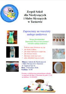 Zapraszamy przedszkolaki na Warsztaty Małego Naukowca, pełne prostych i ciekawych eksperymentów (m.in. wulkan, tęcza, higiena rąk). Zajęcia odbędą się 14 kwietnia 2026 r. o godz. 16:00 w Zespół Szkół dla Niesłyszących i Słabo Słyszących w Tarnowie przy ul. Lippóczy’ego 4a.