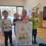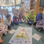 W ramach realizacji OGÓLNOPOLSKIEGO PROGRAMU EDUKACJI ZDROWOTNEJ dzieci zrealizowały temat” Zdrowe śniadanie lisicy Karoliny”. Tym razem lisica Karolina wprowadziła dzieci w świat zdrowego odżywiania. Zajęcia miały na celu uświadomić dzieciom, że pełnowartościowe śniadanie odgrywa bardzo ważną rolę w codziennym funkcjonowaniu. Podczas zajęć omówiliśmy piramidę zdrowego żywienia. Dzieci dowiedziały się, że podstawą zdrowego stylu życia jest spożywanie warzyw i owoców, produktów zbożowych, nabiału oraz odpowiednia ilość wody i ruch. Dzieci same potrafiły powiedzieć, które produkty są zdrowe