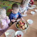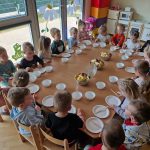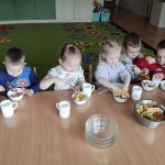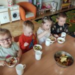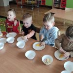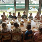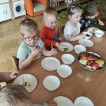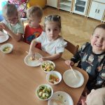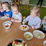 Zdrowie to bardzo ważna sprawa, dlatego dzieci z grupy „Jeżyki” rozmawiały o tym, jak możemy o nie dbać, a następnie w praktyczny sposób rozwijały tę wiedzę podczas warsztatów kulinarnych realizowanych w ramach innowacji „Kraina Zmysłów – sensoryczna podróż przez świat natury”. Zajęcia były doskonałą okazją do kształtowania postawy prozdrowotnej oraz promowania zasad prawidłowego odżywiania. Dzieci samodzielnie przygotowywały sałatkę owocową, zaczynając od podstawowych zasad higieny, takich jak dokładne mycie rąk. Następnie kroiły owoce i komponowały kolorowe porcje, ucząc się przy tym samodzielności i rozwijając poczucie sprawczości. Kulinarna aktywność dostarczyła także wielu wrażeń sensorycznych – dzieci poznawały owoce poprzez smak, zapach, węch, kolor i strukturę, a także wybierały swoje ulubione składniki. Warsztaty były również okazją do utrwalania zasad kulturalnego zachowania – zarówno przy stole, jak i podczas przygotowywania sałatki. Dzieci ćwiczyły używanie zwrotów grzecznościowych oraz właściwe nawyki związane ze spożywaniem posiłków. Największą radość sprawiło dzieciom degustowanie własnoręcznie przygotowanej sałatki, która okazała się nie tylko smaczna, ale i pełne witamin.