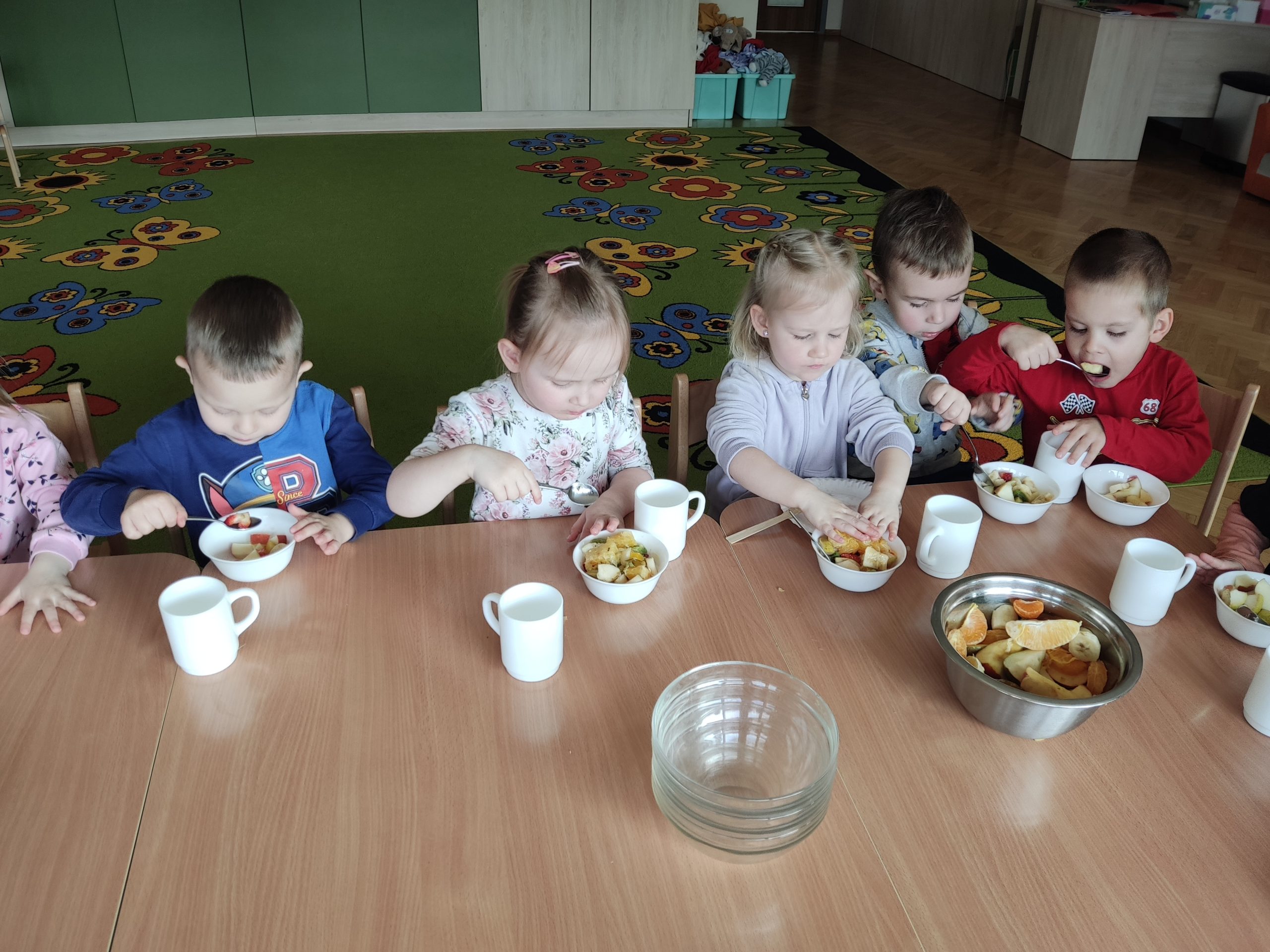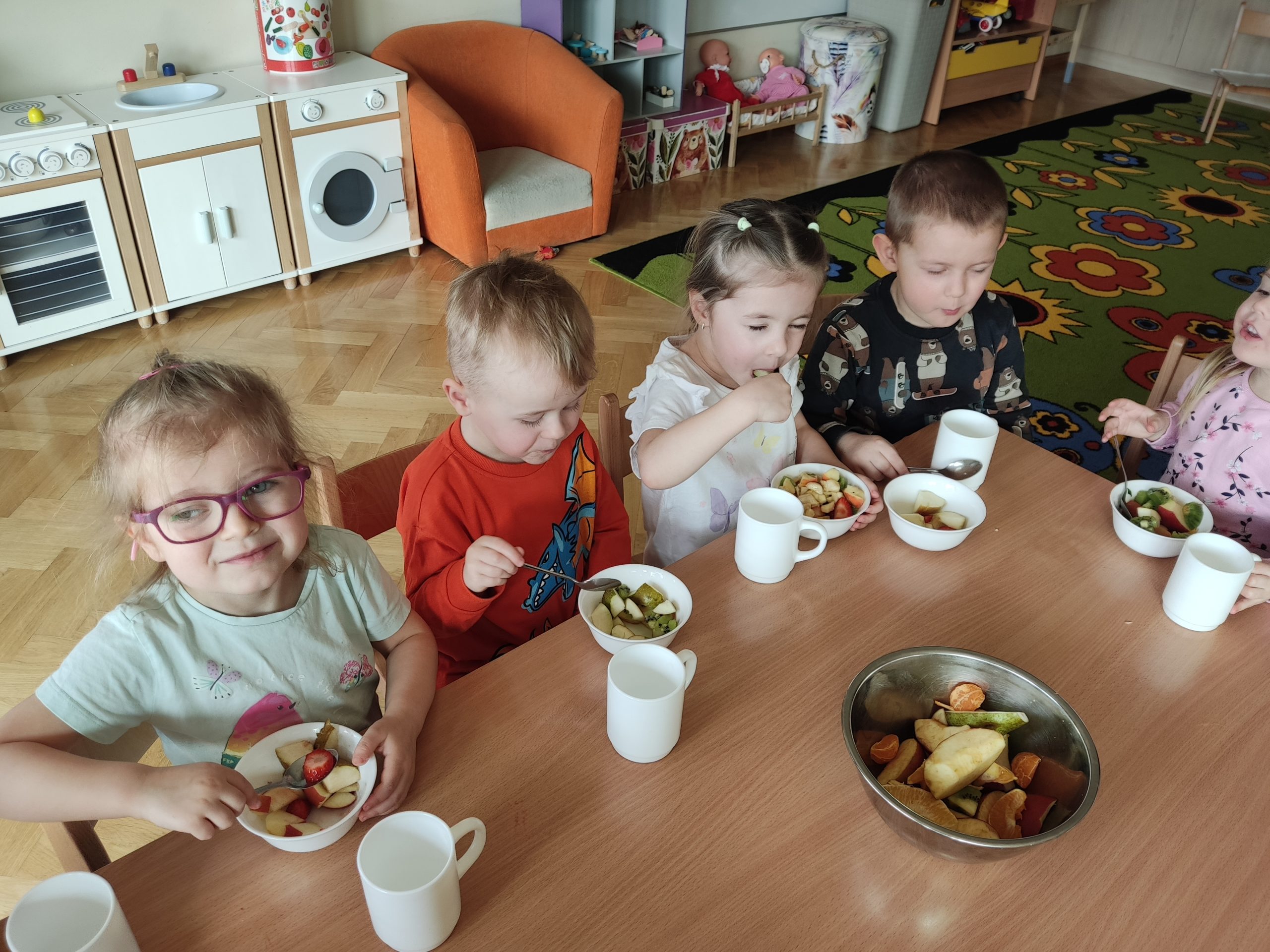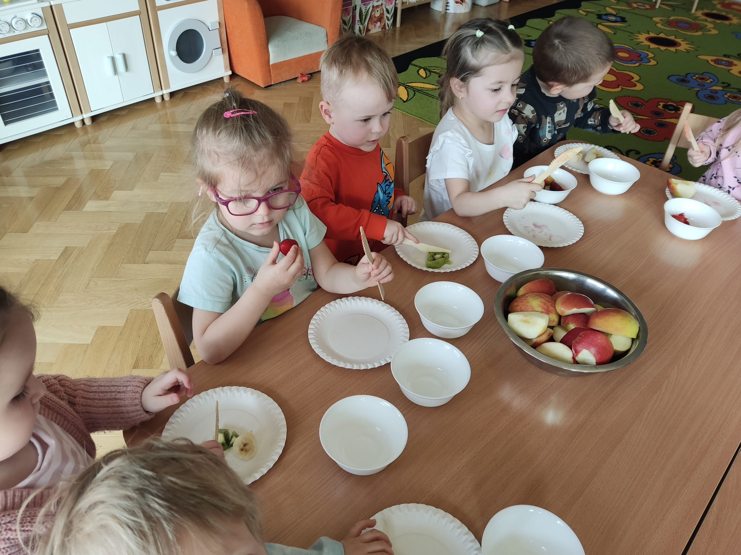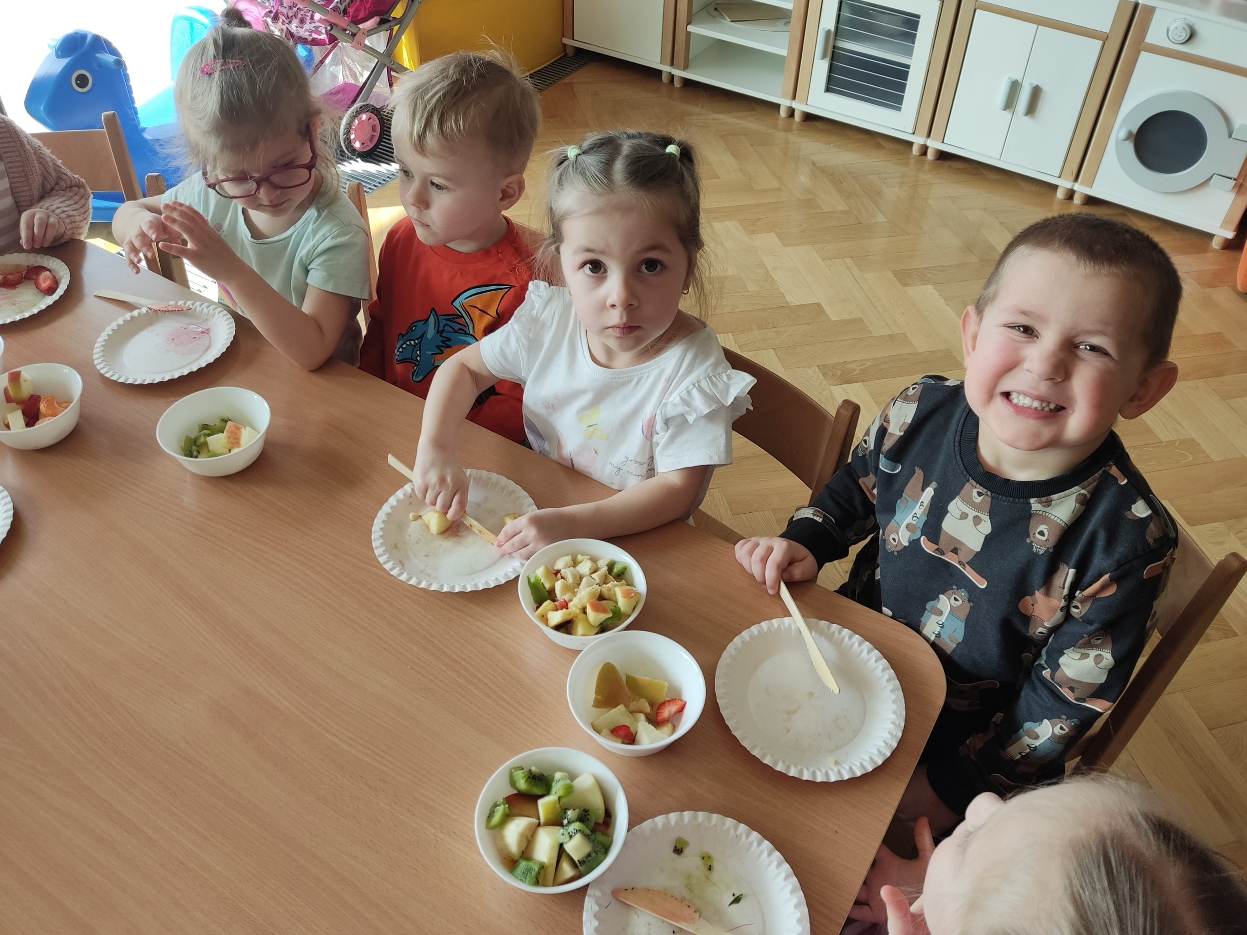 Zdrowie to bardzo ważna sprawa, dlatego dzieci z grupy „Jeżyki” rozmawiały o tym, jak możemy o nie dbać, a następnie w praktyczny sposób rozwijały tę wiedzę podczas warsztatów kulinarnych realizowanych w ramach innowacji „Kraina Zmysłów – sensoryczna podróż przez świat natury”. Zajęcia były doskonałą okazją do kształtowania postawy prozdrowotnej oraz promowania zasad prawidłowego odżywiania. Dzieci samodzielnie przygotowywały sałatkę owocową, zaczynając od podstawowych zasad higieny, takich jak dokładne mycie rąk. Następnie kroiły owoce i komponowały kolorowe porcje, ucząc się przy tym samodzielności i rozwijając poczucie sprawczości. Kulinarna aktywność dostarczyła także wielu wrażeń sensorycznych – dzieci poznawały owoce poprzez smak, zapach, węch, kolor i strukturę, a także wybierały swoje ulubione składniki. Warsztaty były również okazją do utrwalania zasad kulturalnego zachowania – zarówno przy stole, jak i podczas przygotowywania sałatki. Dzieci ćwiczyły używanie zwrotów grzecznościowych oraz właściwe nawyki związane ze spożywaniem posiłków. Największą radość sprawiło dzieciom degustowanie własnoręcznie przygotowanej sałatki, która okazała się nie tylko smaczna, ale i pełne witamin.