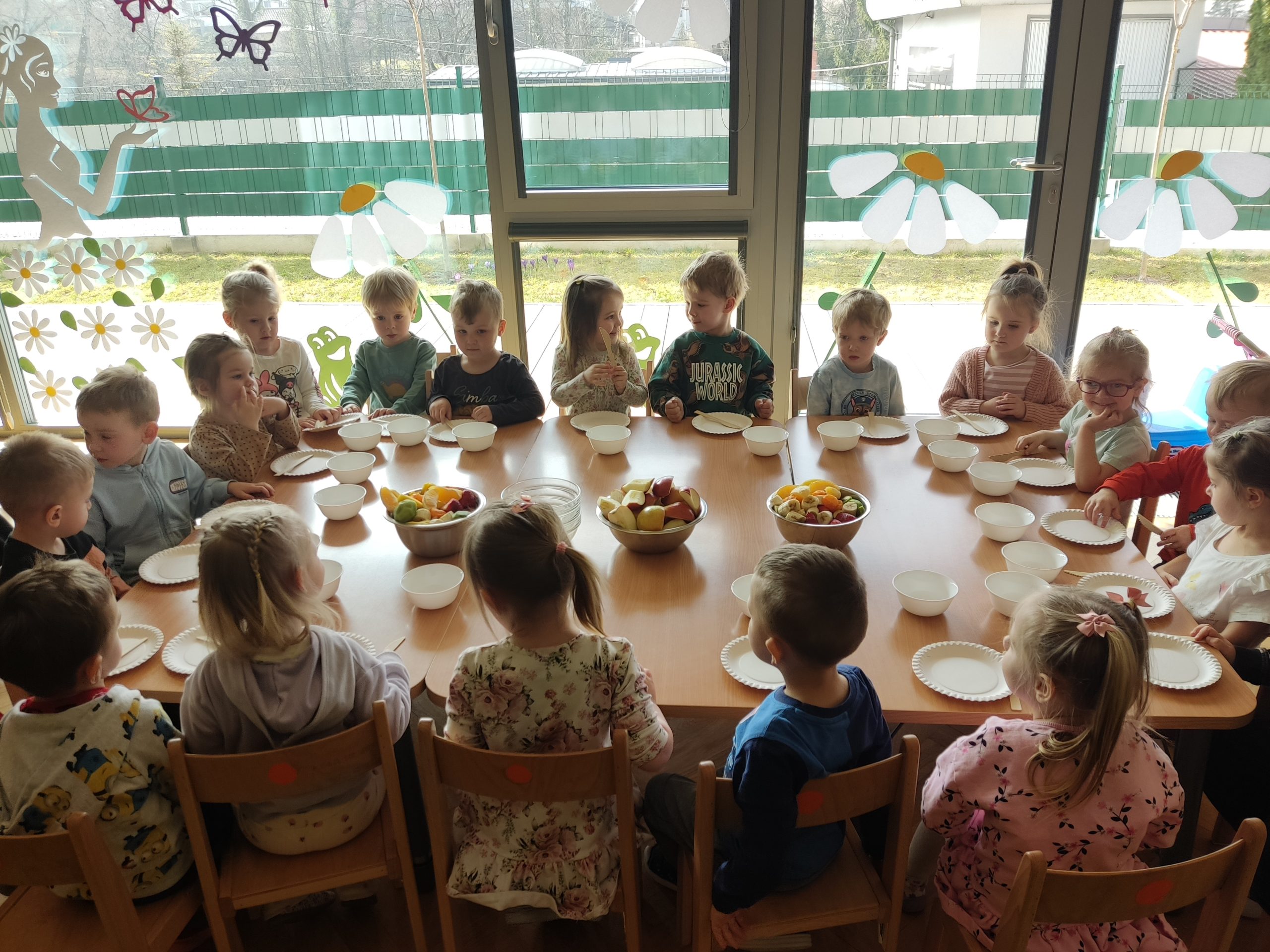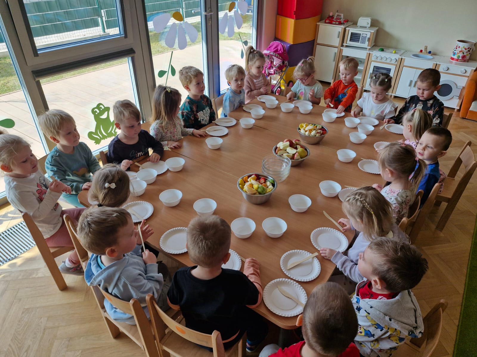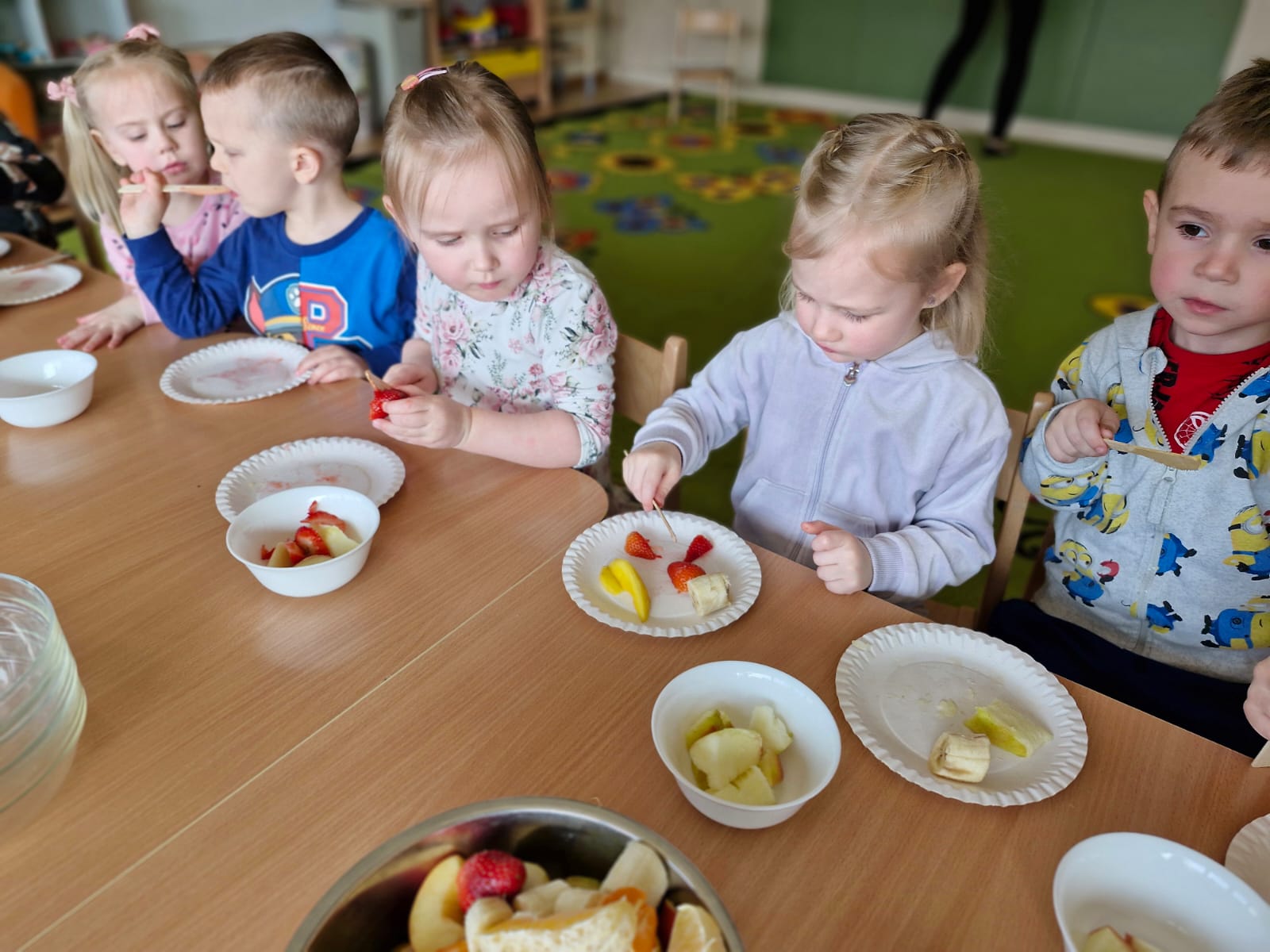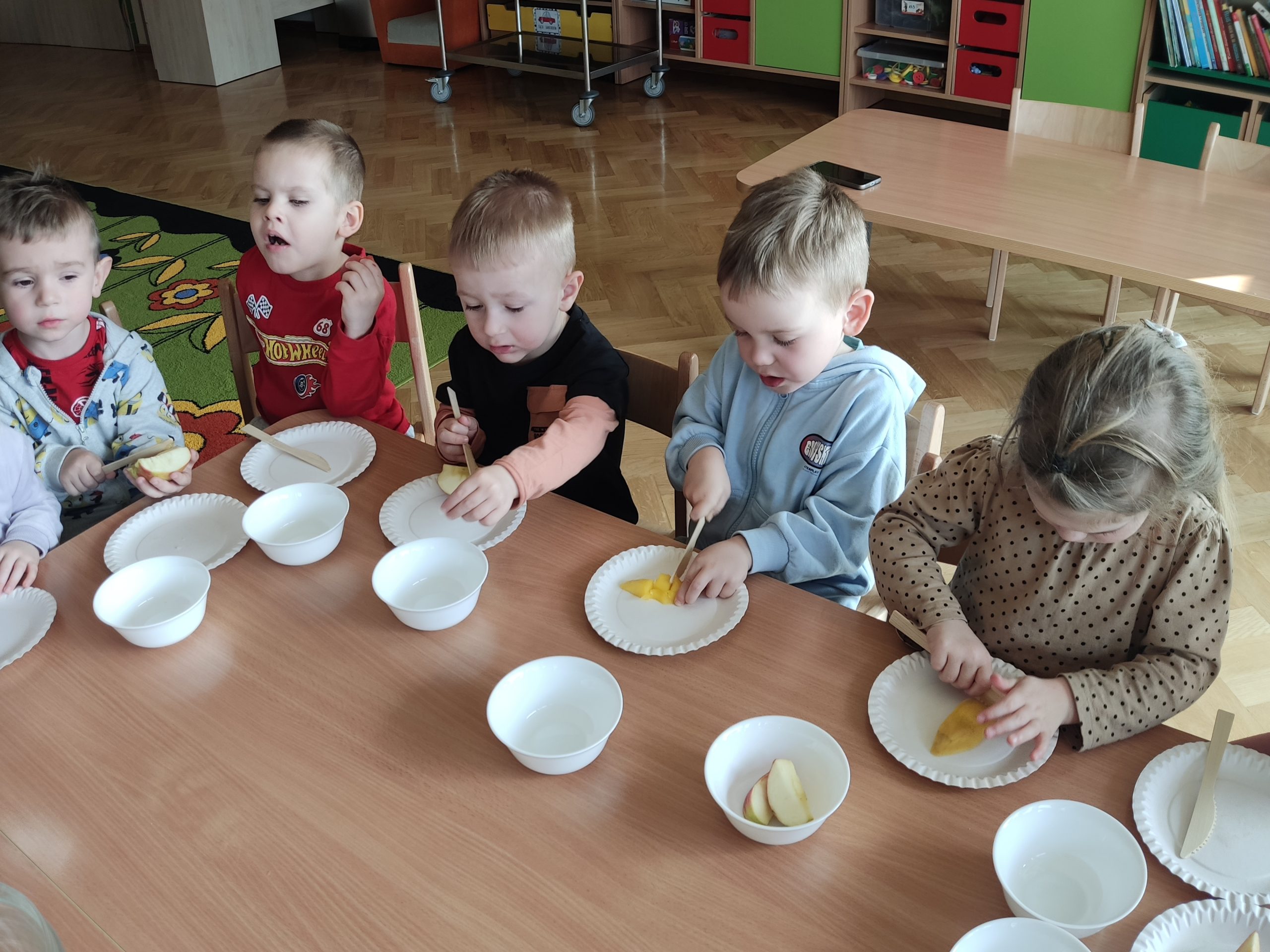 Zdrowie to bardzo ważna sprawa, dlatego dzieci z grupy „Jeżyki” rozmawiały o tym, jak możemy o nie dbać, a następnie w praktyczny sposób rozwijały tę wiedzę podczas warsztatów kulinarnych realizowanych w ramach innowacji „Kraina Zmysłów – sensoryczna podróż przez świat natury”. Zajęcia były doskonałą okazją do kształtowania postawy prozdrowotnej oraz promowania zasad prawidłowego odżywiania. Dzieci samodzielnie przygotowywały sałatkę owocową, zaczynając od podstawowych zasad higieny, takich jak dokładne mycie rąk. Następnie kroiły owoce i komponowały kolorowe porcje, ucząc się przy tym samodzielności i rozwijając poczucie sprawczości. Kulinarna aktywność dostarczyła także wielu wrażeń sensorycznych – dzieci poznawały owoce poprzez smak, zapach, węch, kolor i strukturę, a także wybierały swoje ulubione składniki. Warsztaty były również okazją do utrwalania zasad kulturalnego zachowania – zarówno przy stole, jak i podczas przygotowywania sałatki. Dzieci ćwiczyły używanie zwrotów grzecznościowych oraz właściwe nawyki związane ze spożywaniem posiłków. Największą radość sprawiło dzieciom degustowanie własnoręcznie przygotowanej sałatki, która okazała się nie tylko smaczna, ale i pełne witamin.
