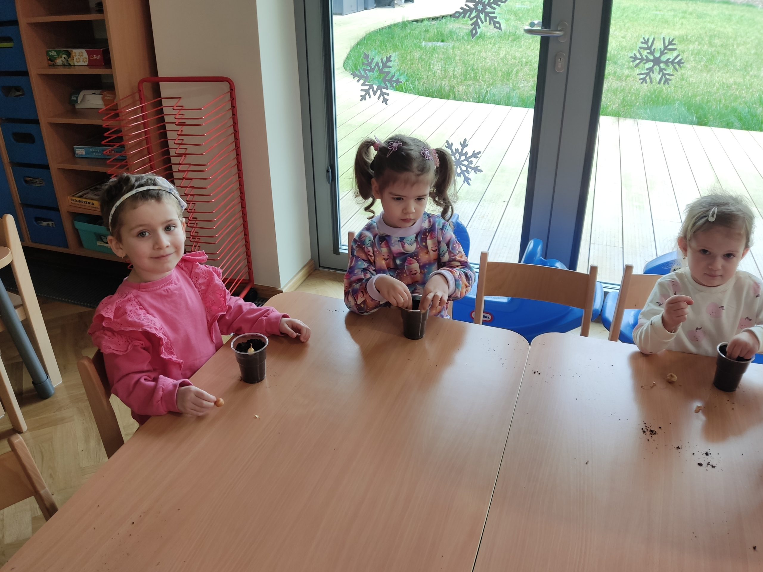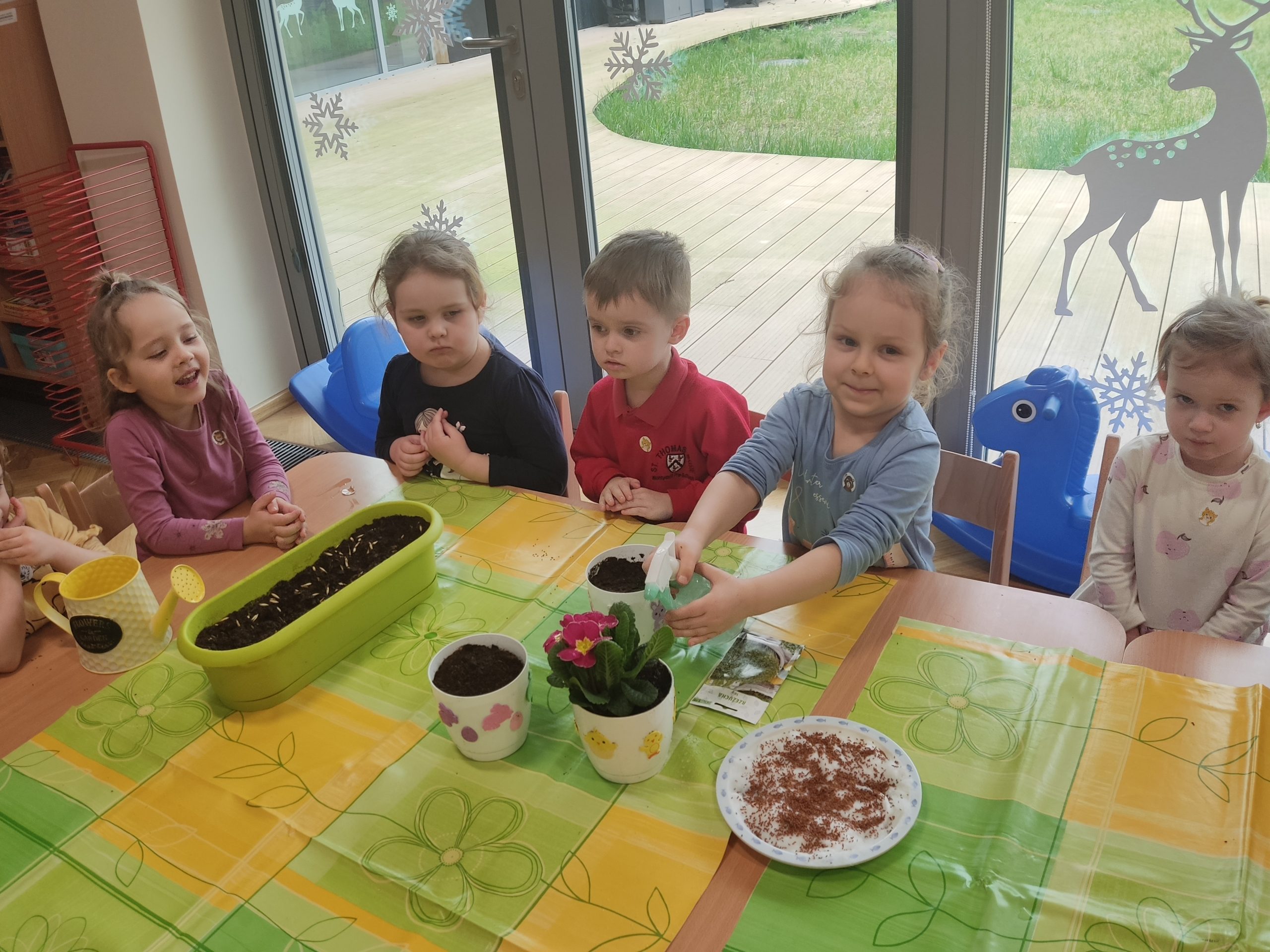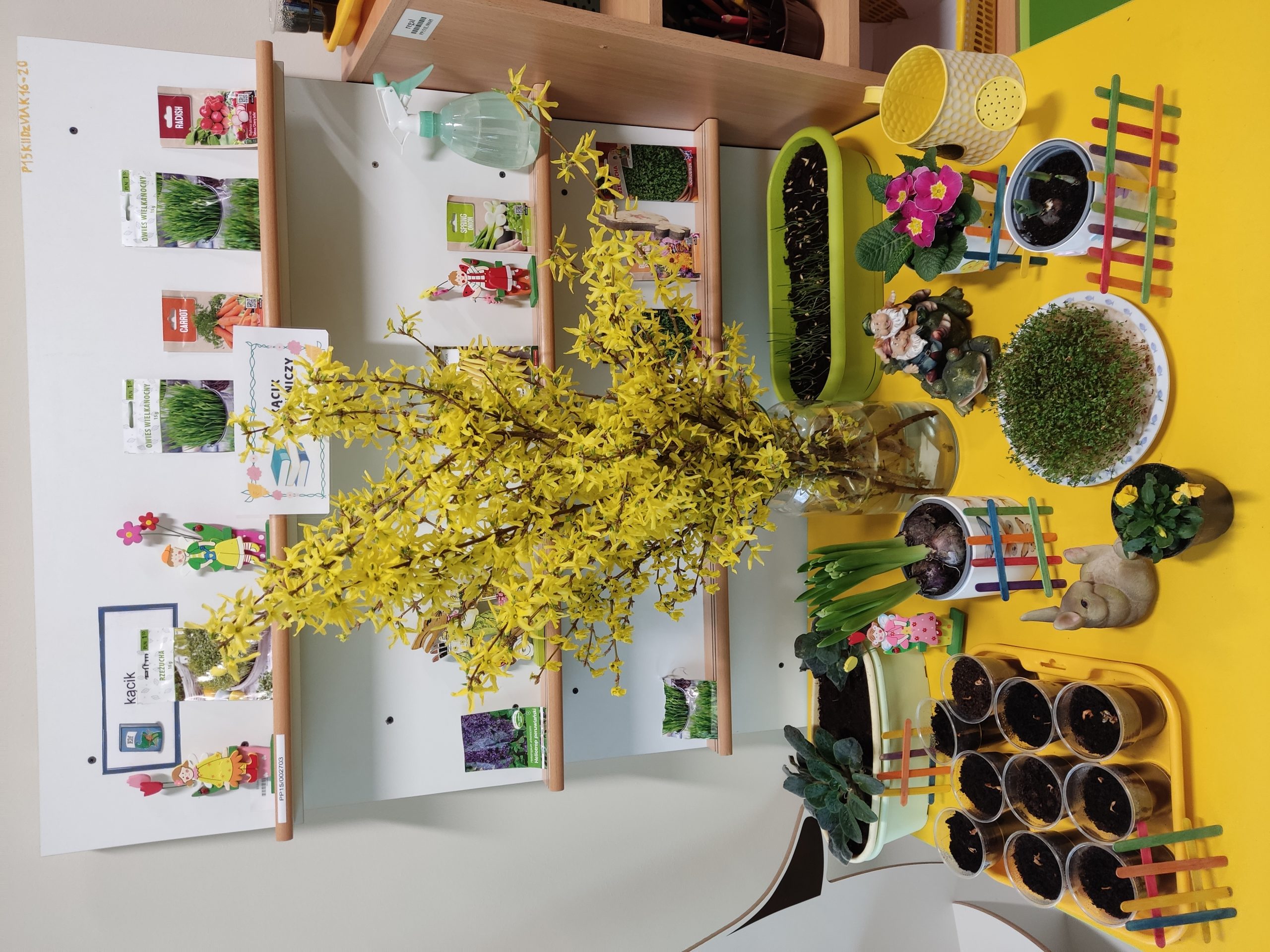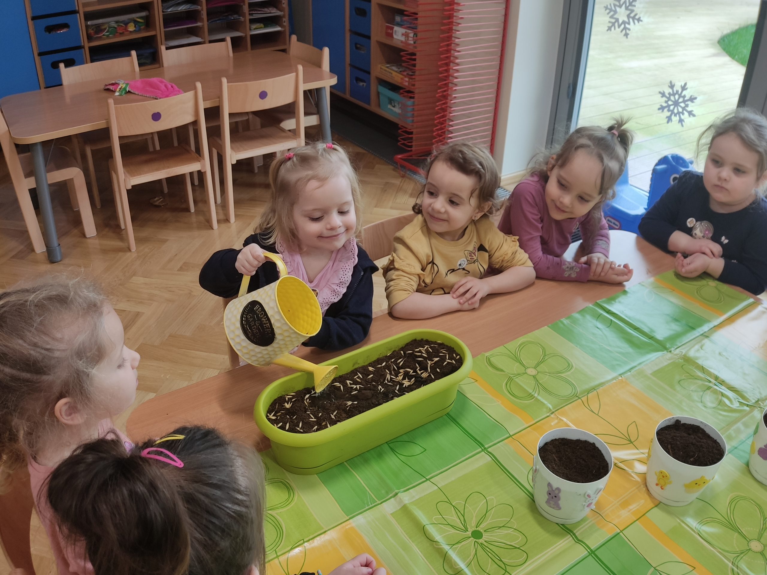 Misie postanowiły wprowadzić wiosenny nastrój do swojej sali i założyły zielony kącik. Zajęcia rozpoczęliśmy od zapoznania się z różnymi możliwościami hodowli roślin w naszym kąciku: w ziemi, na wacie, w słoiku oraz od ukazania czynników niezbędnych do prawidłowego wzrostu i rozwoju roślin. Wprowadzeniem do zajęć była historyjka obrazkowa ilustrująca etapy sadzenia roślin przez ogrodnika oraz prezentacja narzędzi potrzebnych mu do pracy w ogrodzie. Następnie nasi mali ogrodnicy, z dużym zaangażowaniem, przystąpili do pracy, każdy mógł sam posadzić rośliny. Z pomocą pań, przygotowały warsztat pracy potrzebny do założenia zielonego kącika: doniczki, ziemię, różnego rodzaju nasiona, cebulki kwiatowe, warzywa i wodę. Następnie każdy mógł włożyć trochę swojej pracy poprzez napełnianie doniczek ziemią, sianie nasion i sadzenie cebulki na szczypiorek. Na talerzyku wyłożonym watą wysiewaliśmy rzeżuchę. W skrzynce zasialiśmy owies oraz posadziliśmy małe cebulki. W słoiku wypełnionym wodą umieściliśmy nasiona fasoli. Następnie Misie podlały swoje sadzonki i ustawiły je w nasłonecznionym miejscu. Teraz codziennie będziemy obserwować nasze sadzonki oraz wspólnie je pielęgnować. Zabawa była wyśmienita, pełna wrażeń i bogata o nowe doświadczenia i wiadomości.