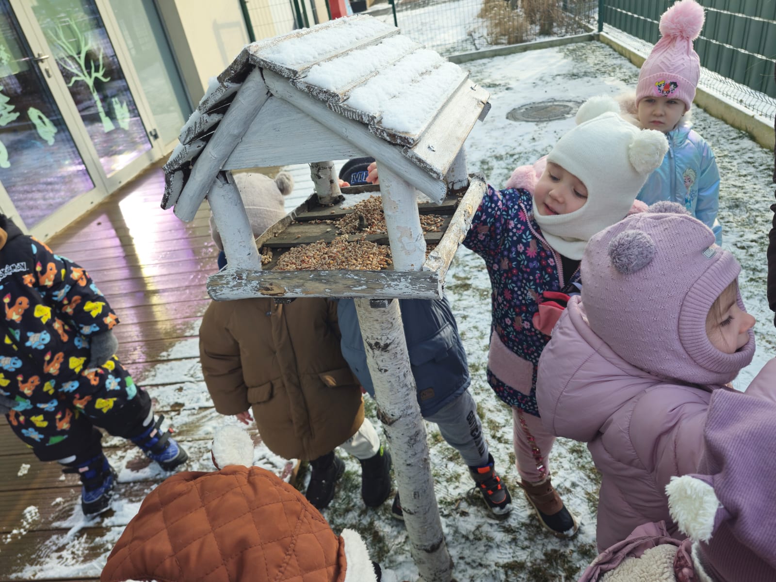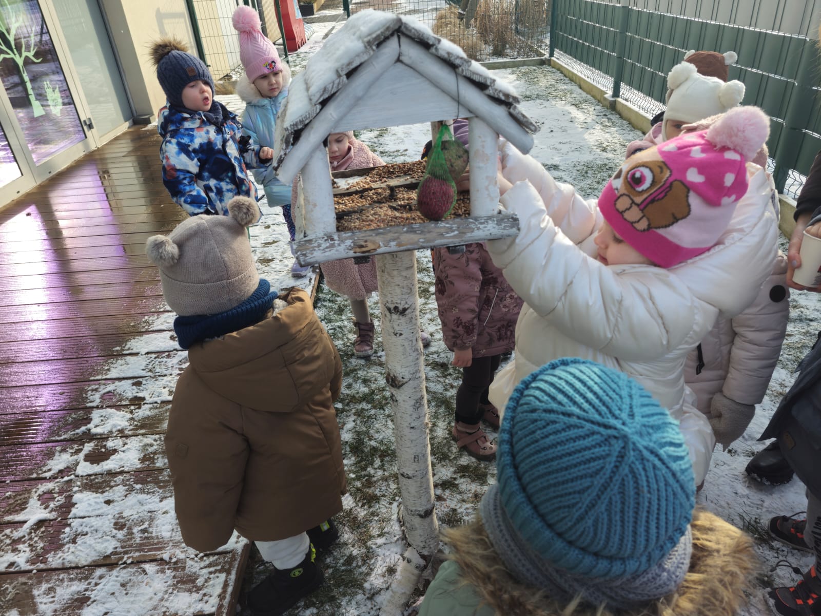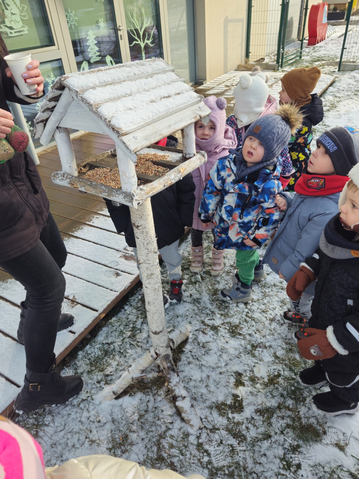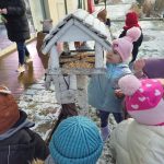 Zima to trudny czas dla ptaków, dlatego jak co roku nasze przedszkolaki z wielkim zaangażowaniem pamiętają o skrzydlatych przyjaciołach. „Jeżyki” dbają o to, aby karmniki w przedszkolnym ogrodzie były zawsze pełne ziarenek. Ogromną radość sprawia im wyjście do ogrodu, kiedy mogą wrzucić do karmnika kilka ziarenek do karmnika lub zawiesić kulki tłuszczowe dla ptaków.